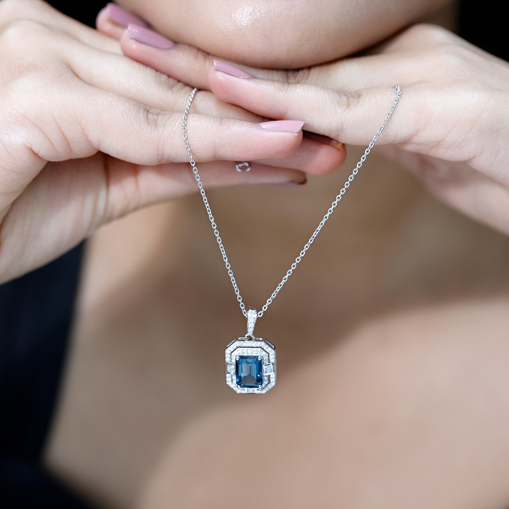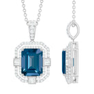 Certified Vintage Inspired Emerald Cut London Blue Topaz Necklace with Halo