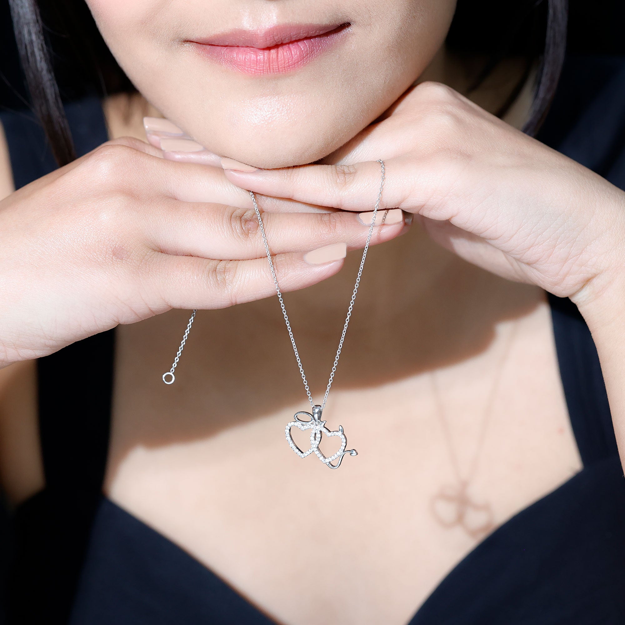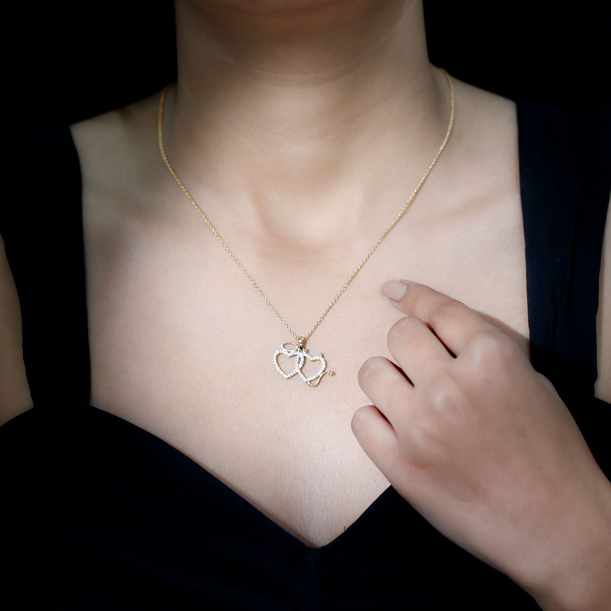 This stunning Cubic Zirconia Pendant perfectly represents love in all its forms - pure, playful, and passionate. The design features two intertwined open hearts, delicately encrusted with sparkling AAAA Quality zircon stones in surface prong setting. One heart features a polished oval motif at the top, signifying the angelic purity of love while the other has small devil horns and a curved tail, adding a fun and bold touch. Whether you are showing your love for someone special or treating yourself, this Open Heart Necklace is a perfect choice. It reminds us that love can be both gentle and exciting, making it a unique and thoughtful gift for any occasion.