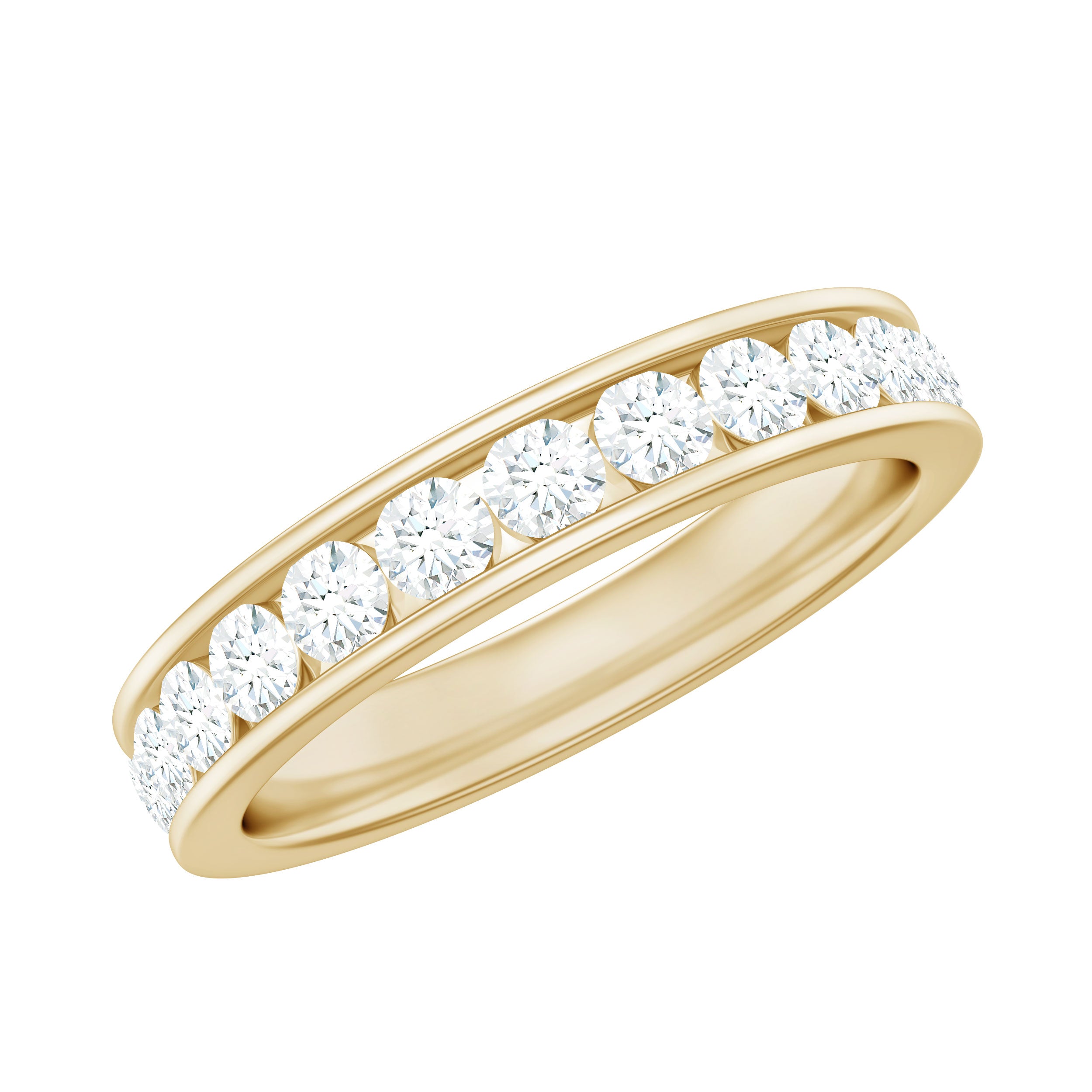 This Moissanite Eternity Band is perfect to represent your eternal love for her. The band features Round Shape Moissanites placed in the Channel Setting which creates a breathtaking look. This Channel Set Wedding Band reflects the classic shine of Moissanites representing grace, strength, and wisdom. To make your special day memorable get this Eternity Band Ring which can be styled solely or stacked with other statement rings to achieve a signature look. The classic shine of D-VS1 quality Moissanites makes it perfect for the special day. This ring will be delivered to you in a premium quality box for storage.