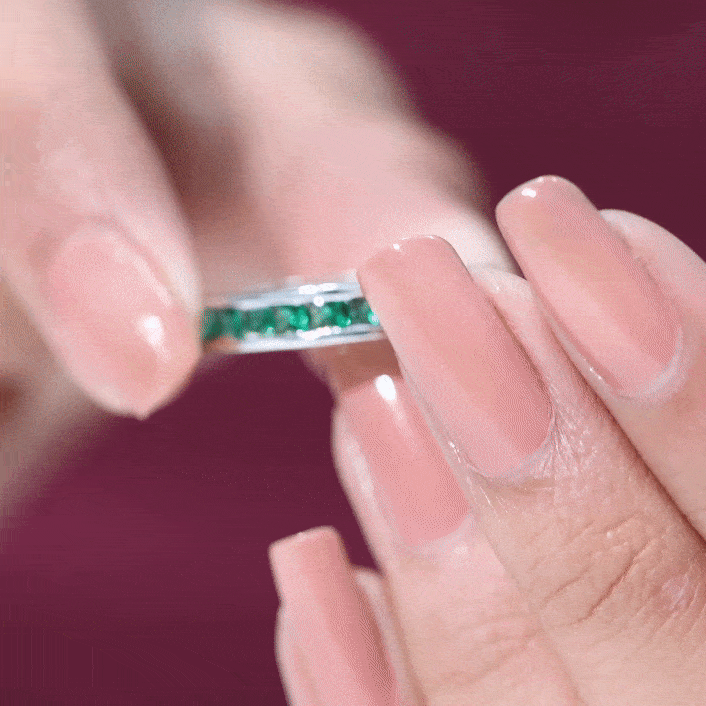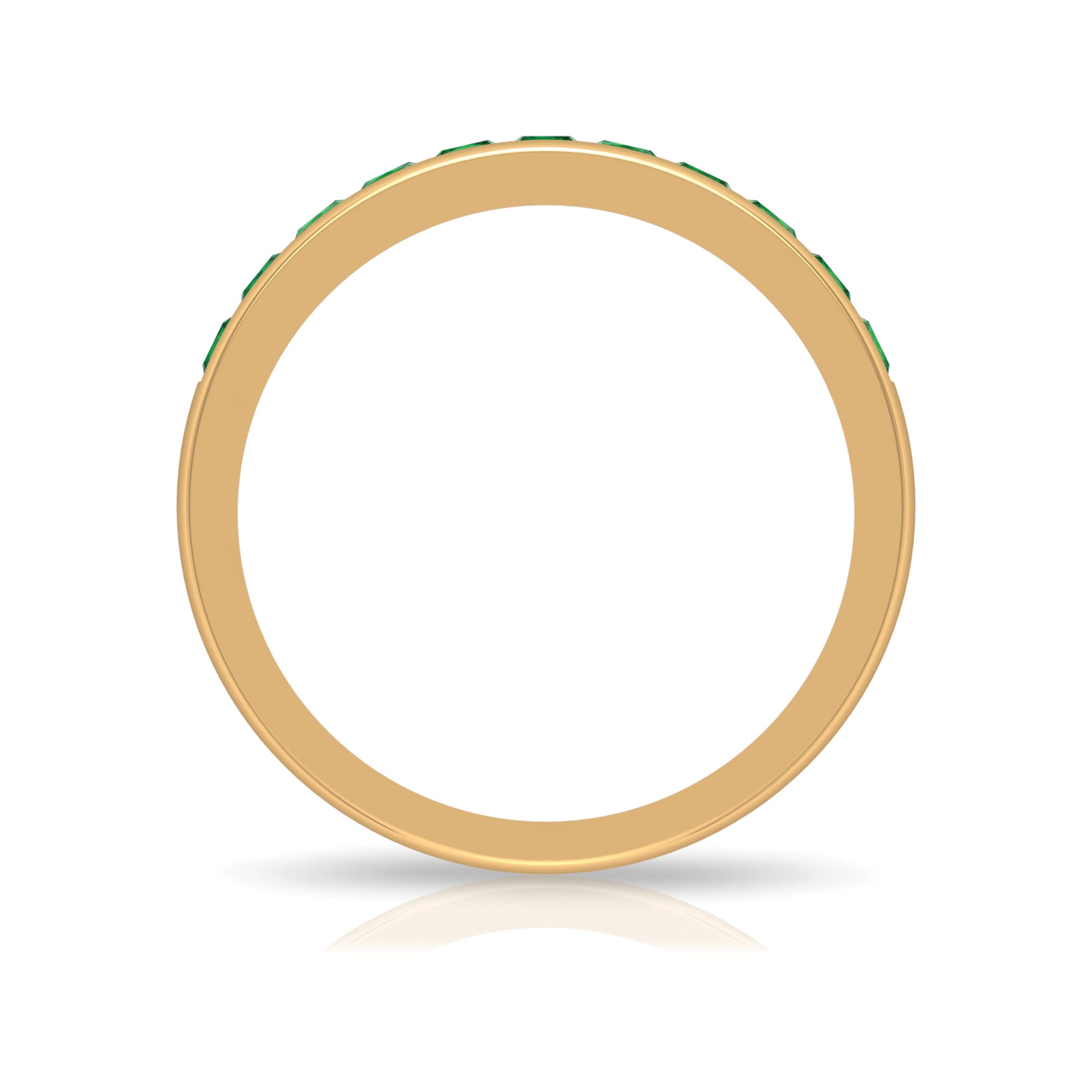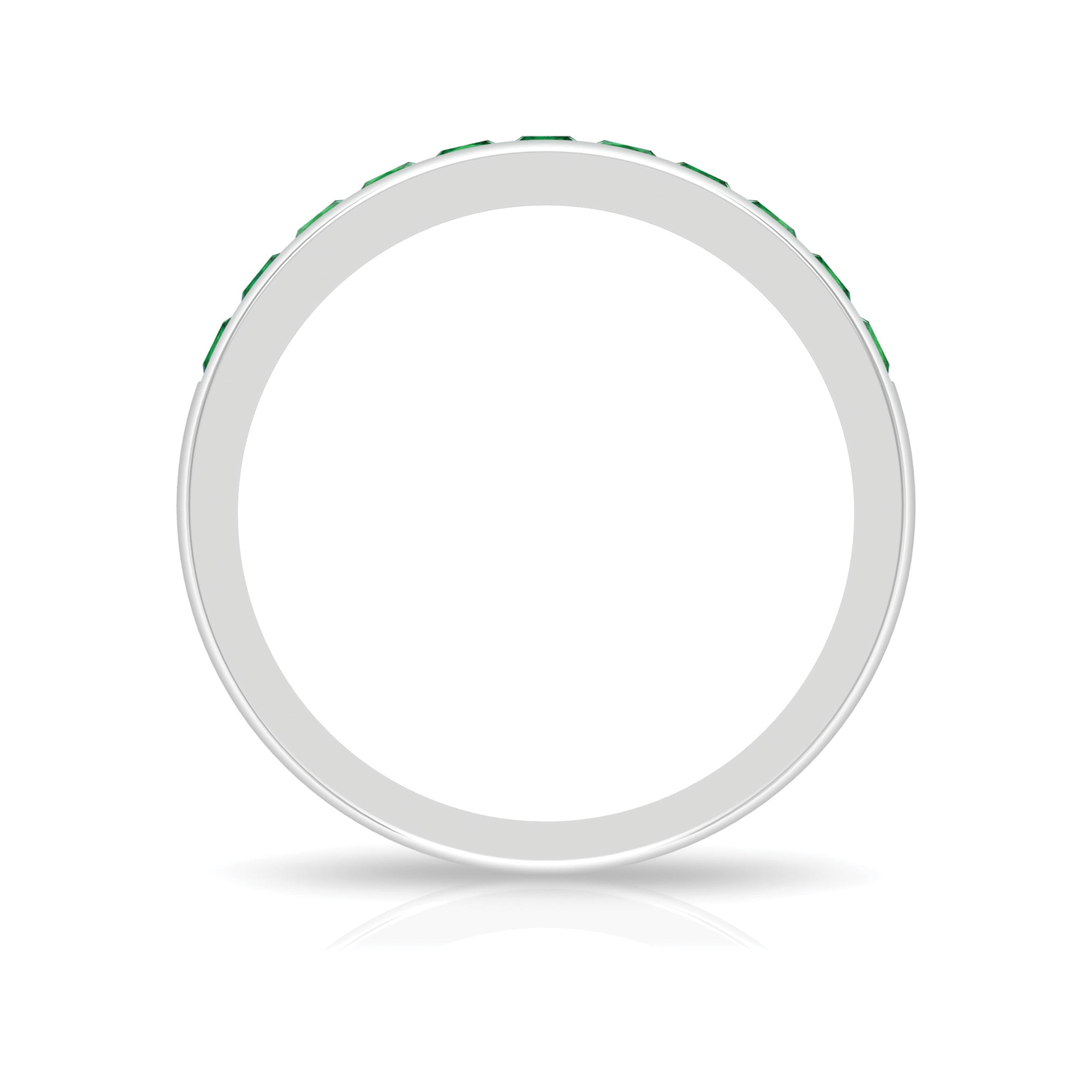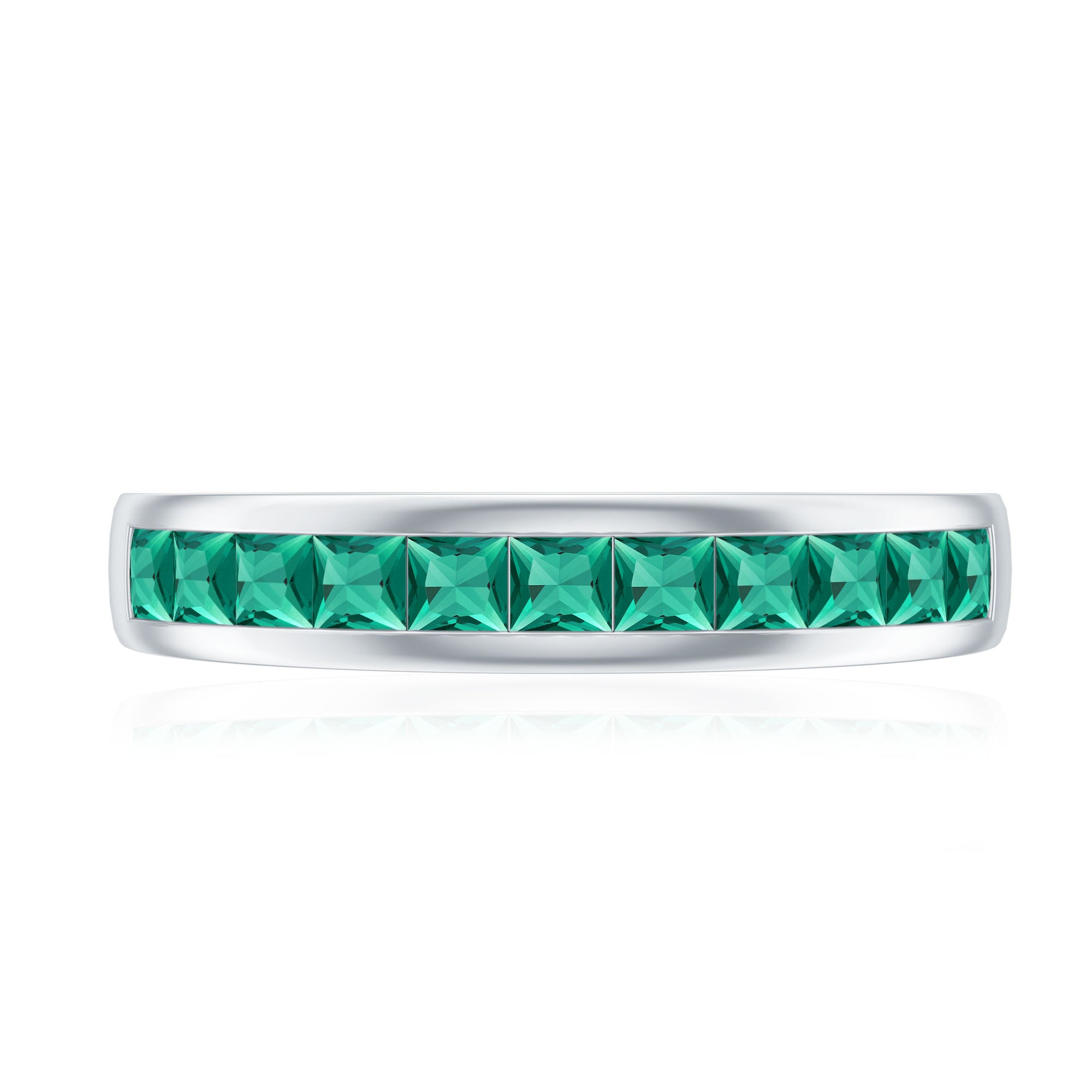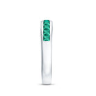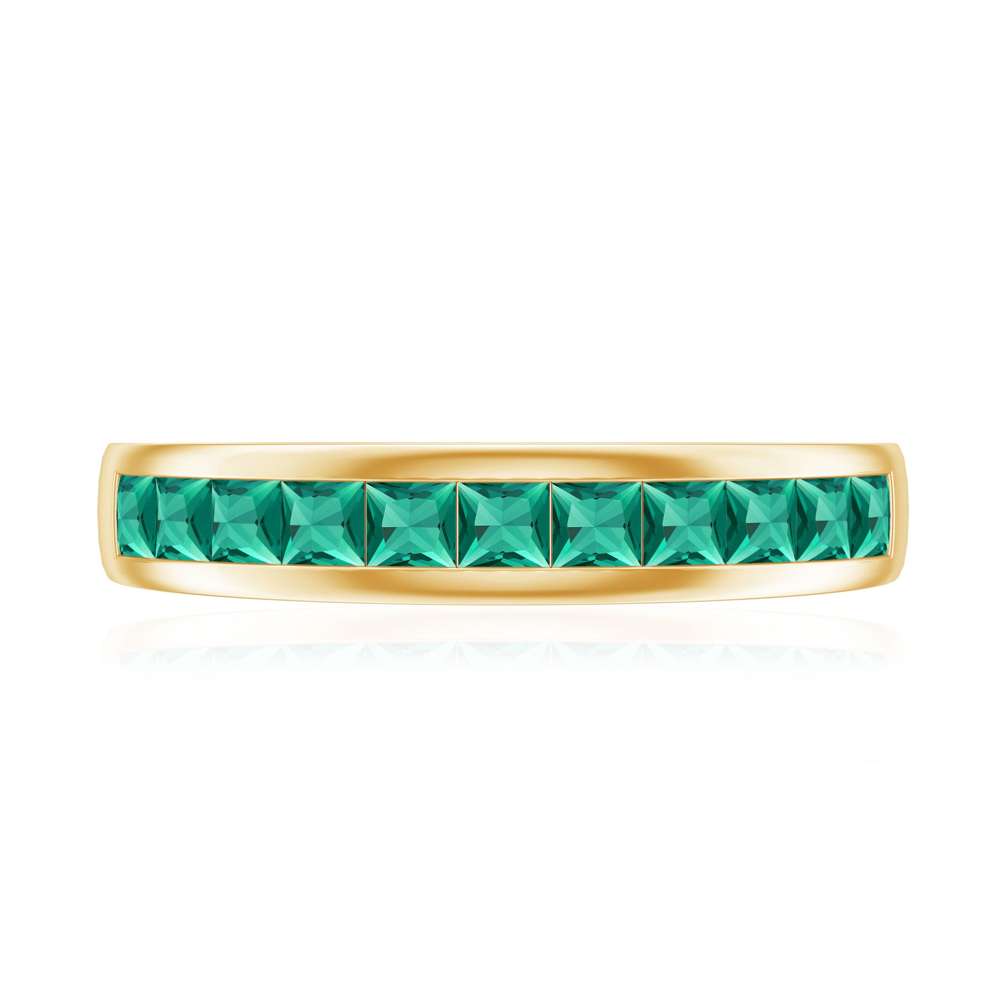 This half eternity band features princess cut lab grown emeralds arranged in a structured channel setting. The gemstones form a continuous line of vibrant green color along the band, creating a refined design that highlights symmetry and clean geometry.