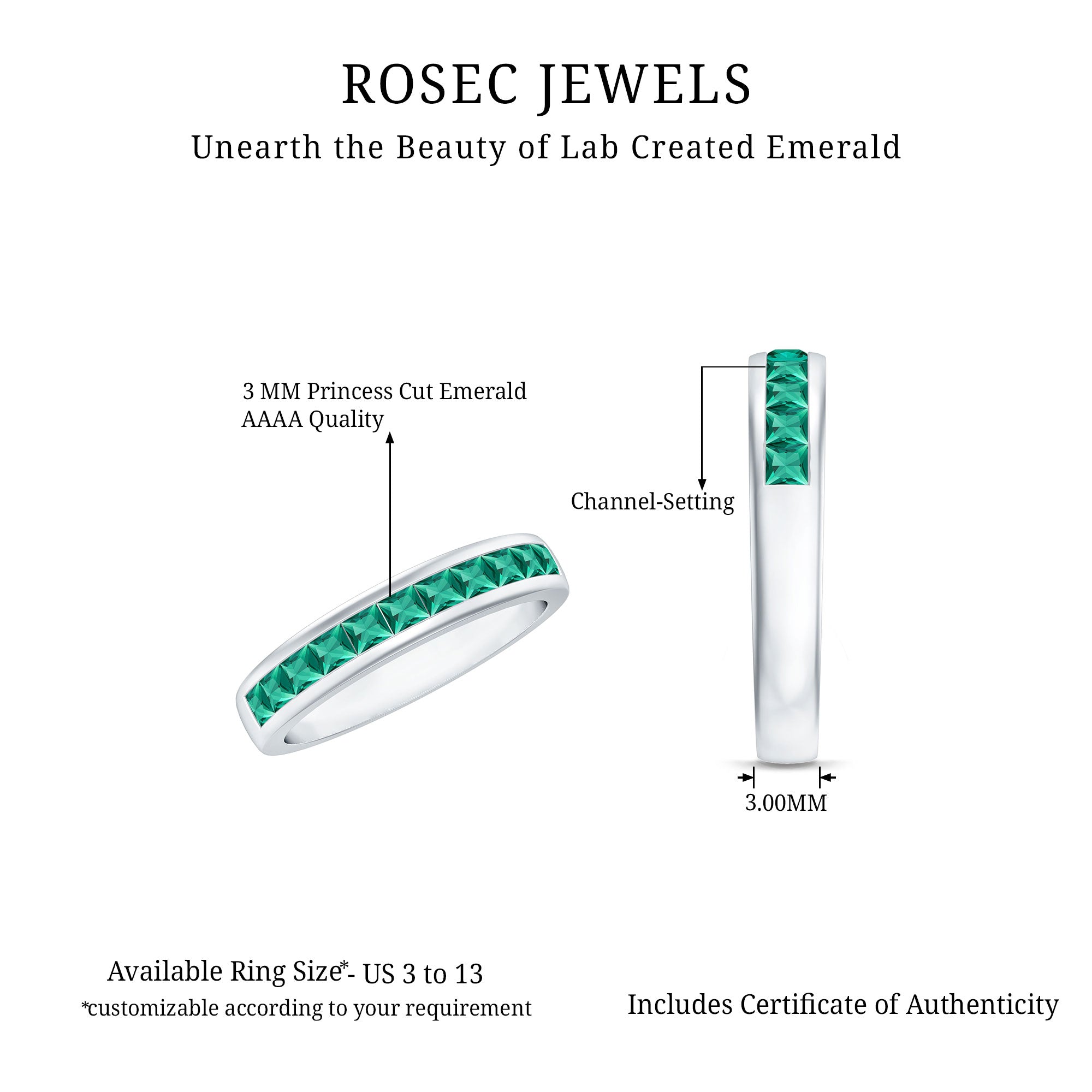 Channel Set Princess Cut Lab Grown Emerald Half Eternity Band with Certificate
