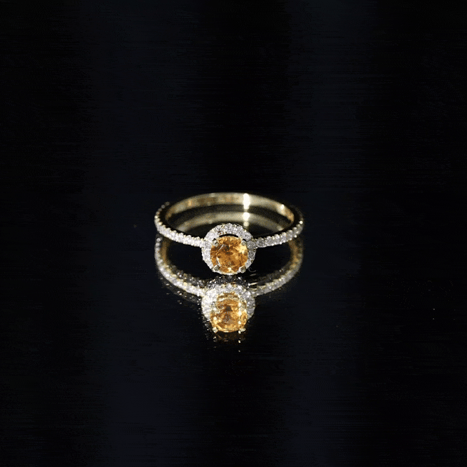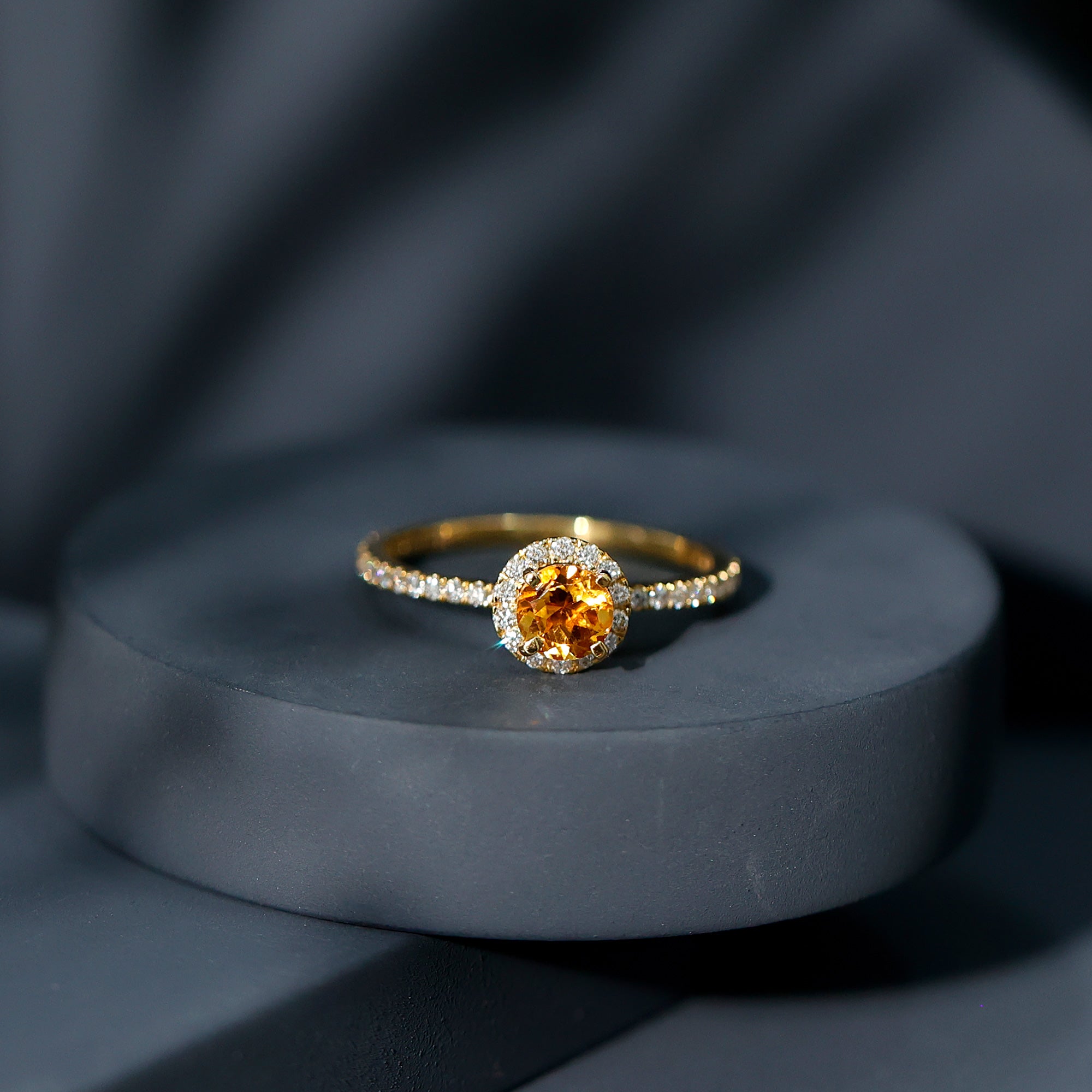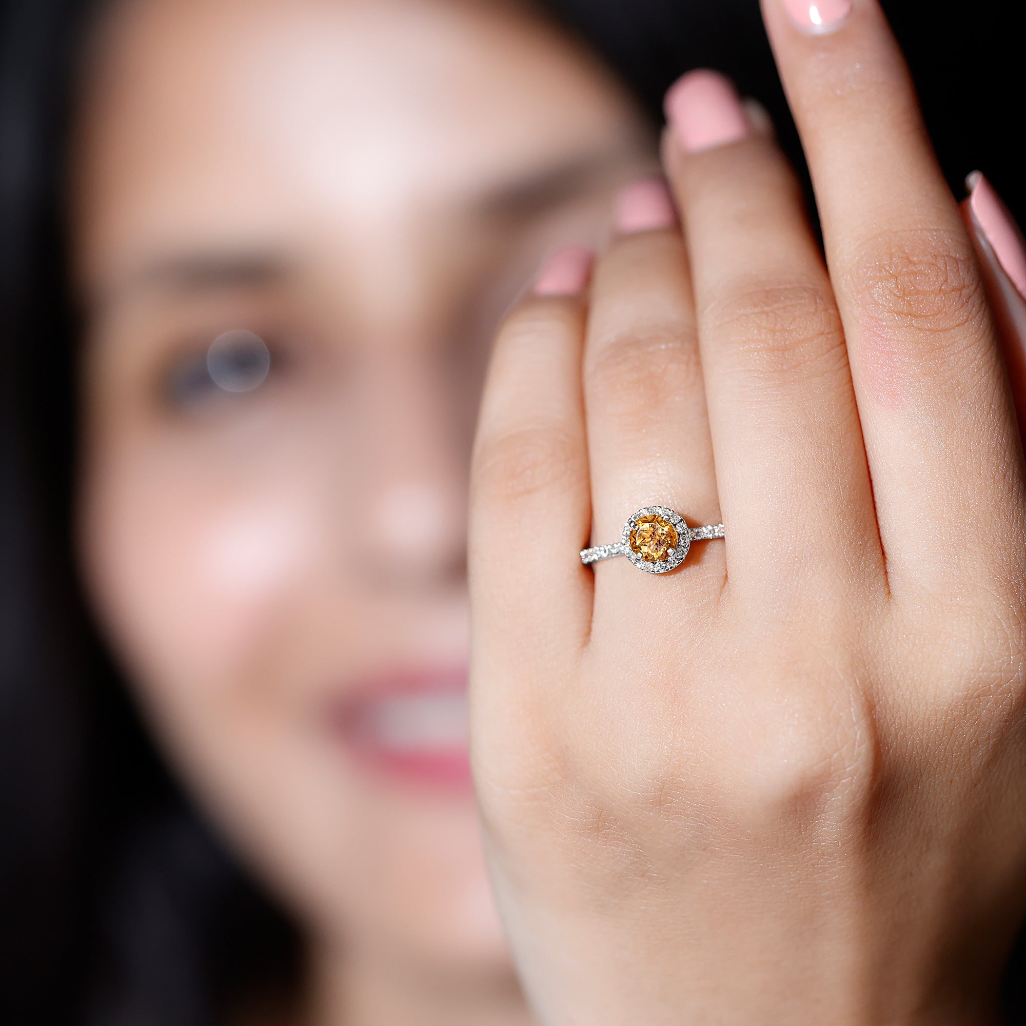 Dazzle everyone when you flaunt this Solitaire Ring studded with a Citrine set in the center accentuated by a Round Brilliant Diamond Halo and Side Stones making this ring as unique as you.