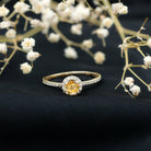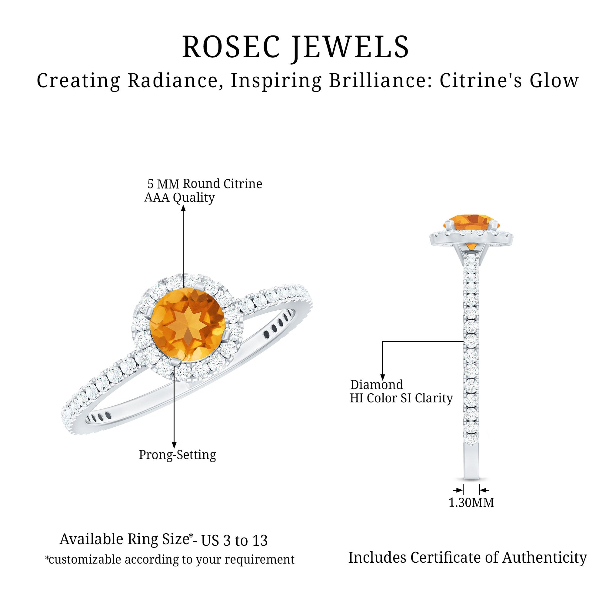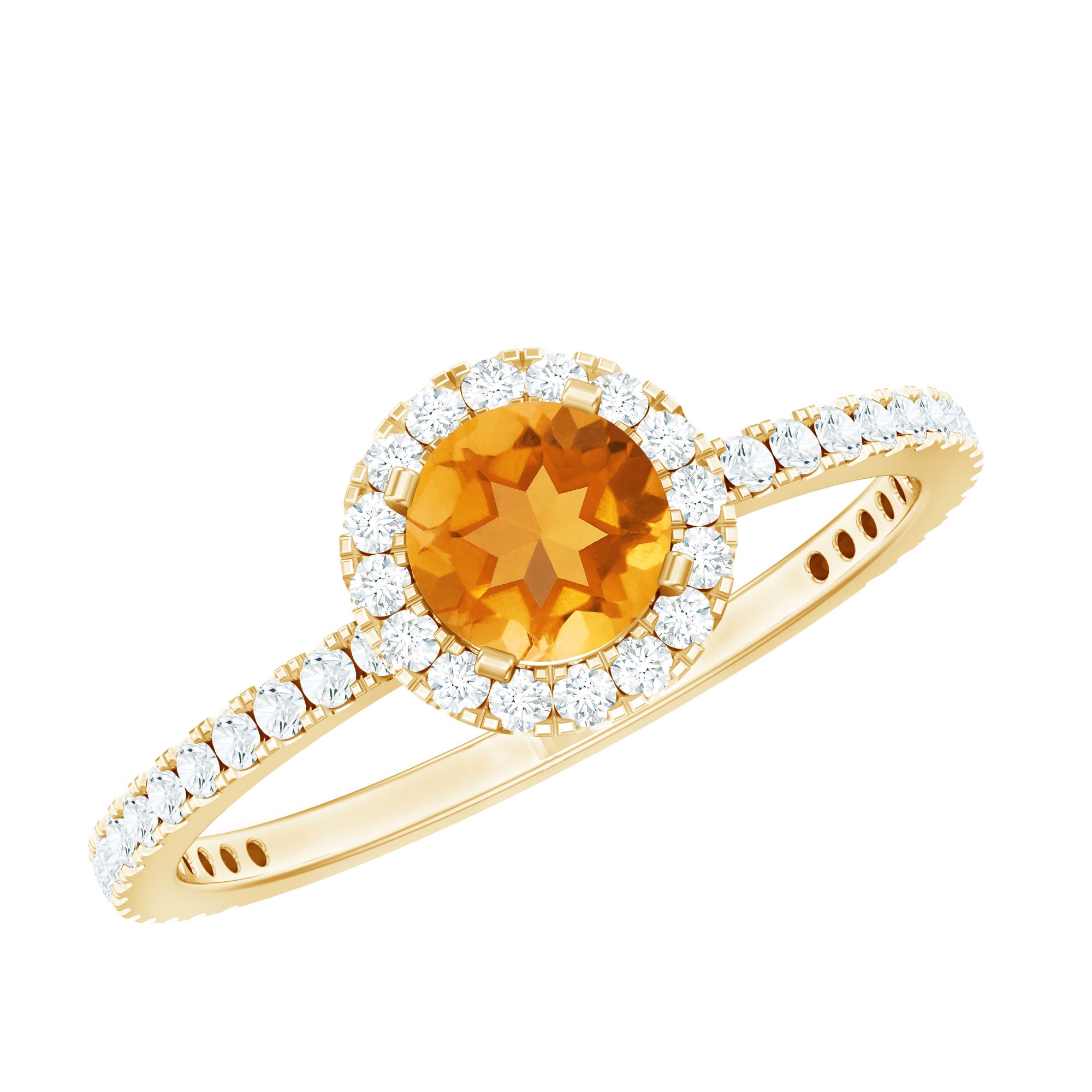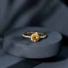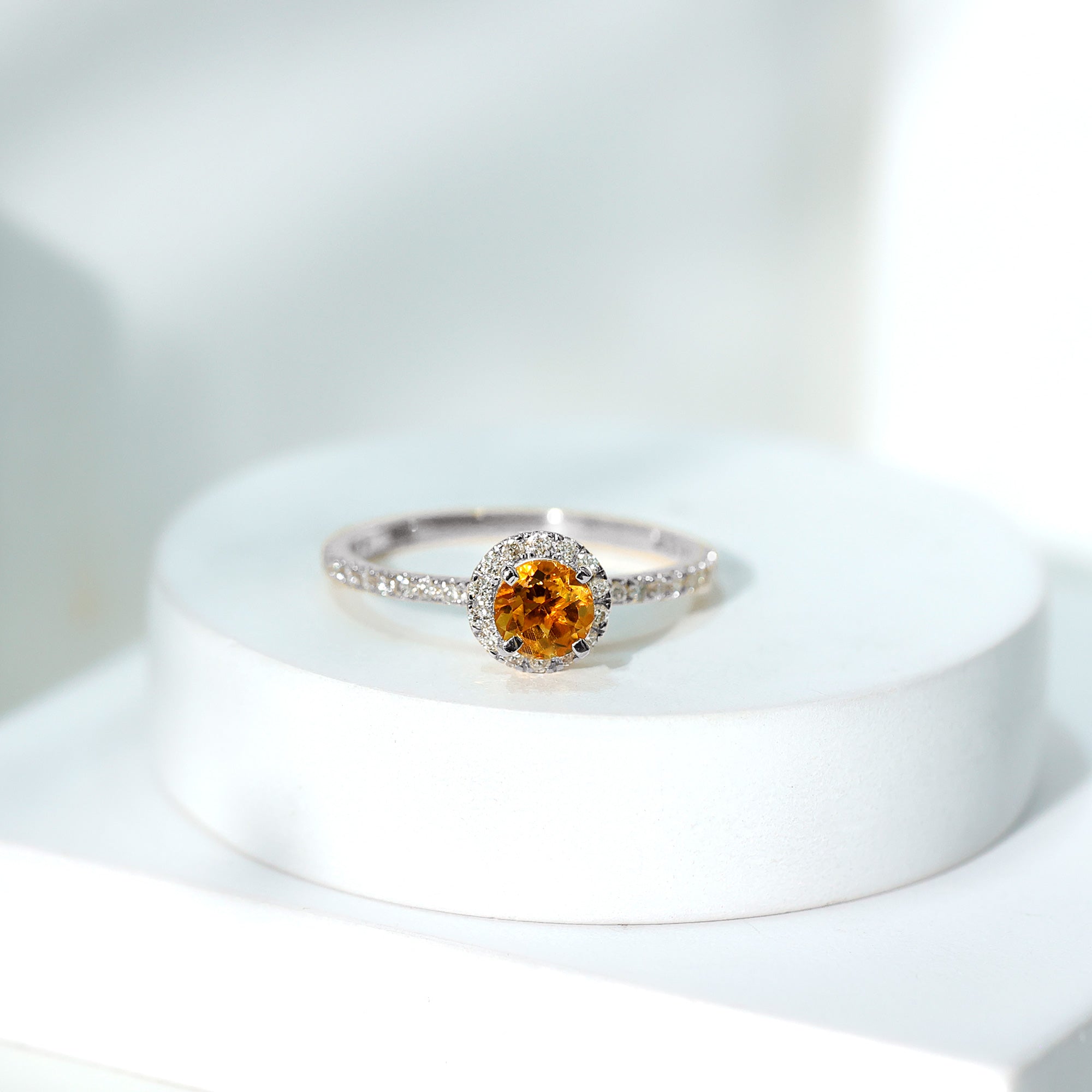 Dazzle everyone when you flaunt this Solitaire Ring studded with a Citrine set in the center accentuated by a Round Brilliant Diamond Halo and Side Stones making this ring as unique as you.