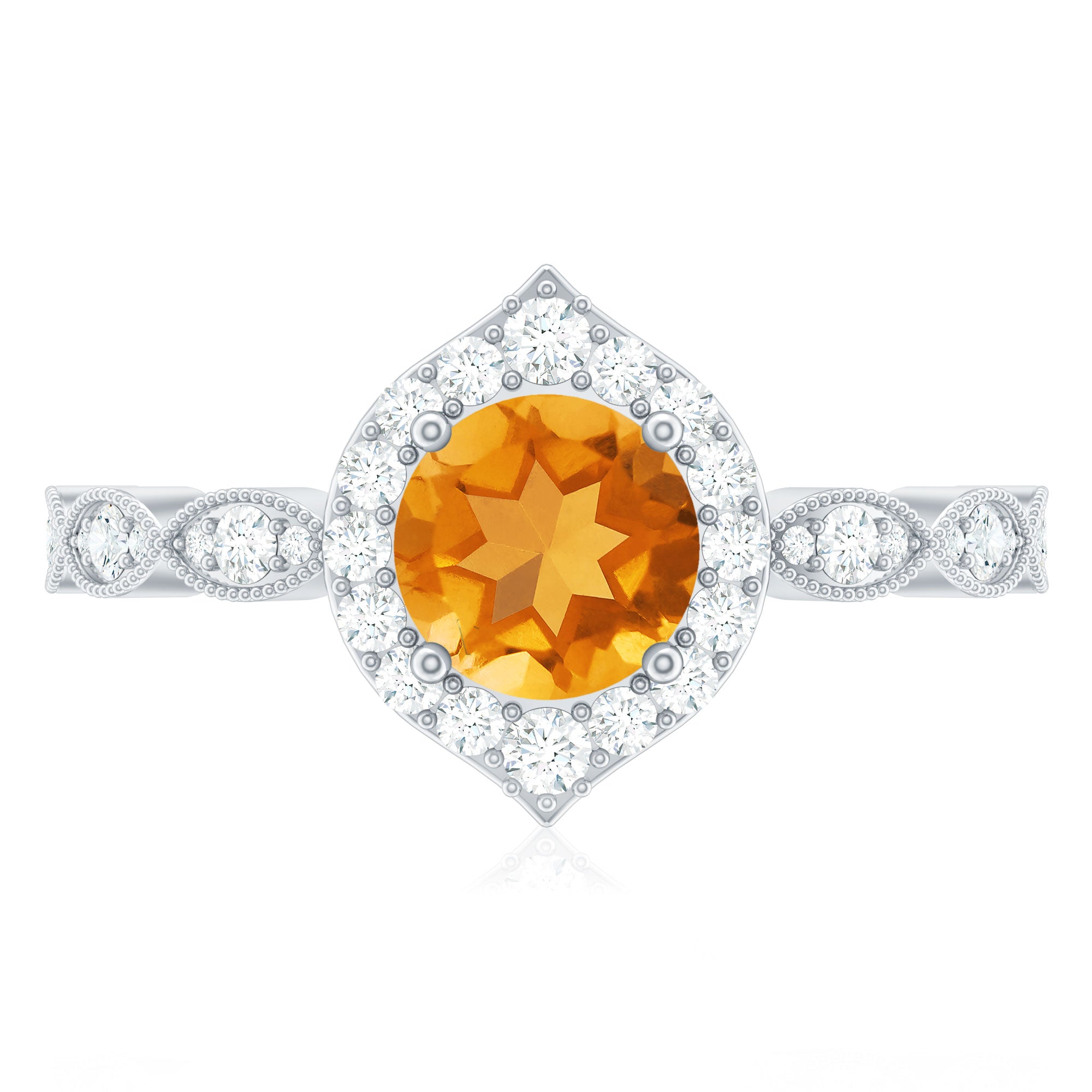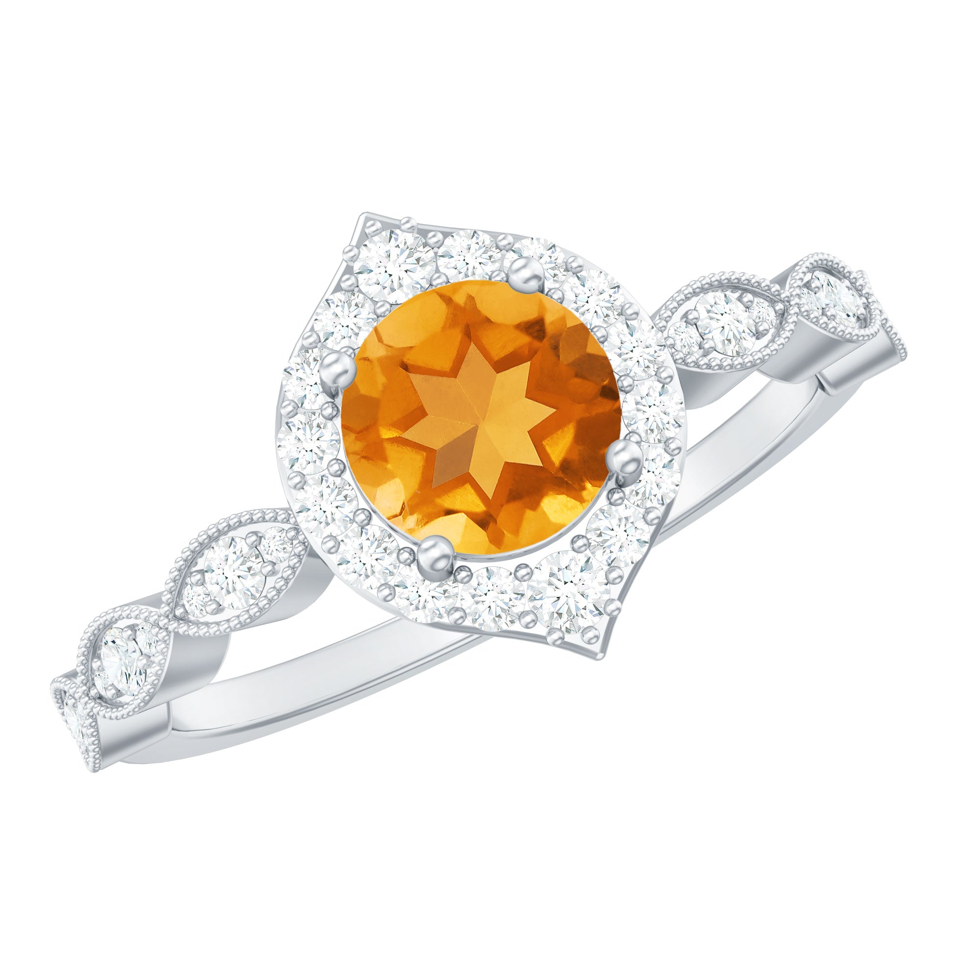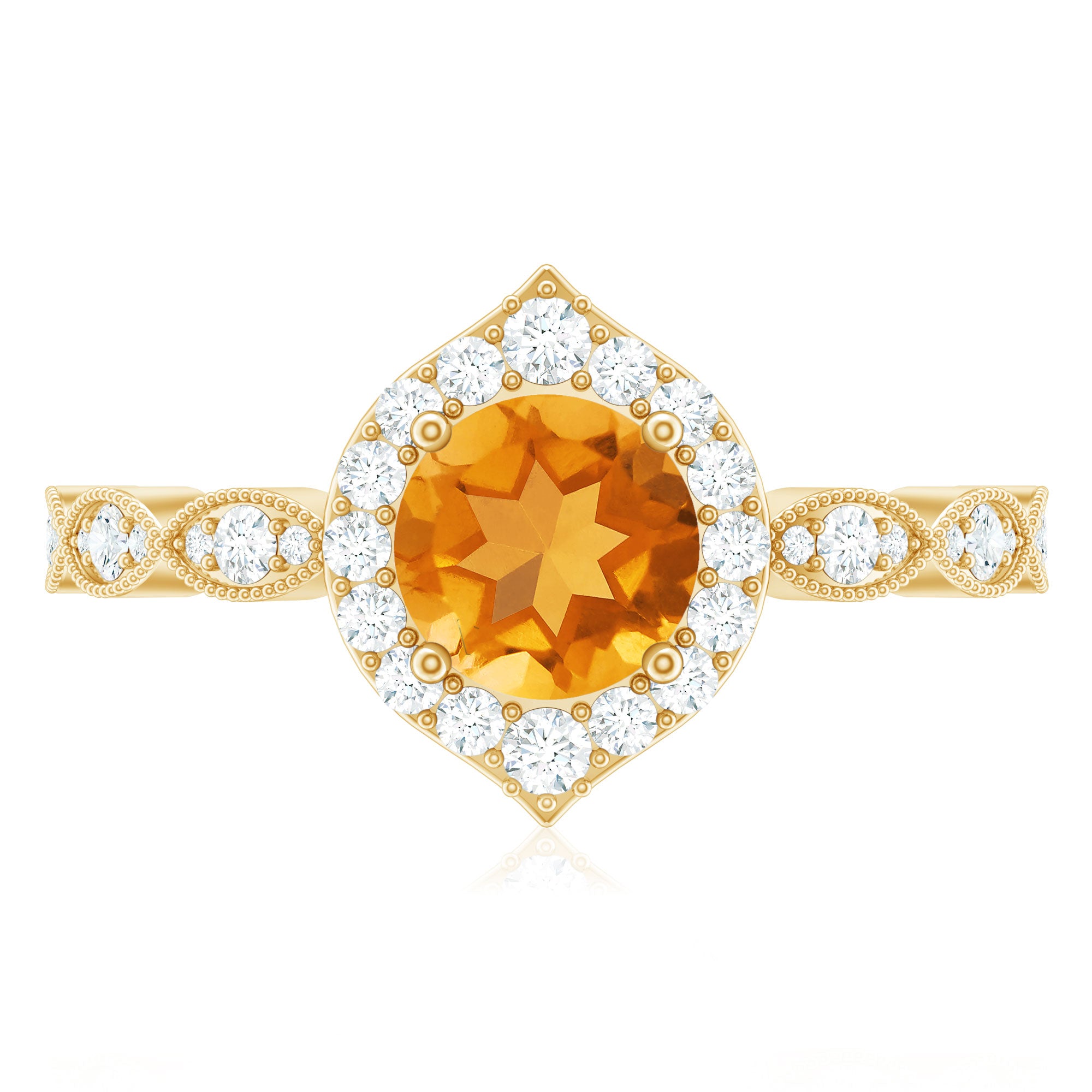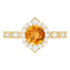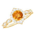 Embrace your regal side with this vintage-inspired citrine engagement ring. A radiant round-cut citrine is set in the center, surrounded by a halo of Diamond gems. Crafted in gold, this ring is perfect for those who love antique and artistic jewelry pieces.