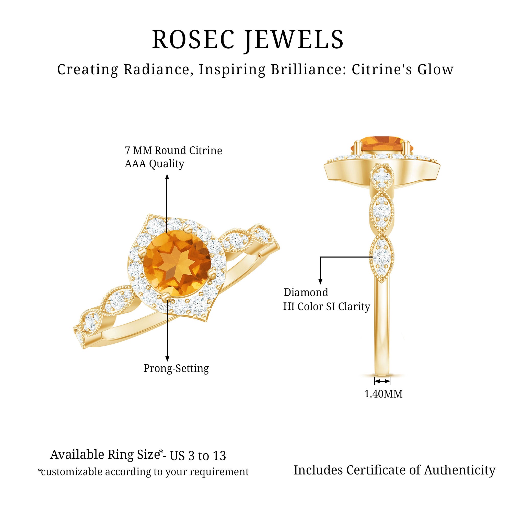 Embrace your regal side with this vintage-inspired citrine engagement ring. A radiant round-cut citrine is set in the center, surrounded by a halo of Diamond gems. Crafted in gold, this ring is perfect for those who love antique and artistic jewelry pieces.