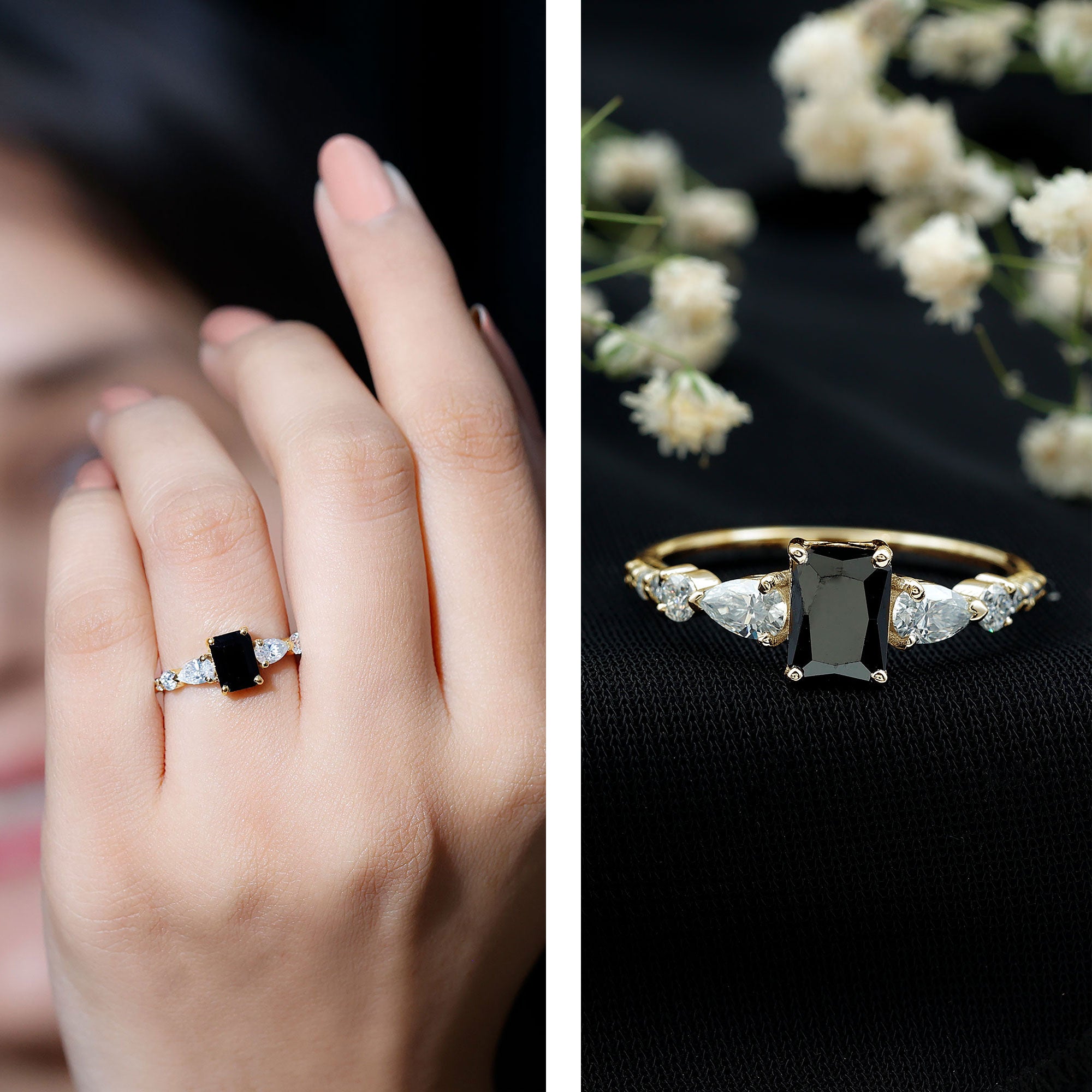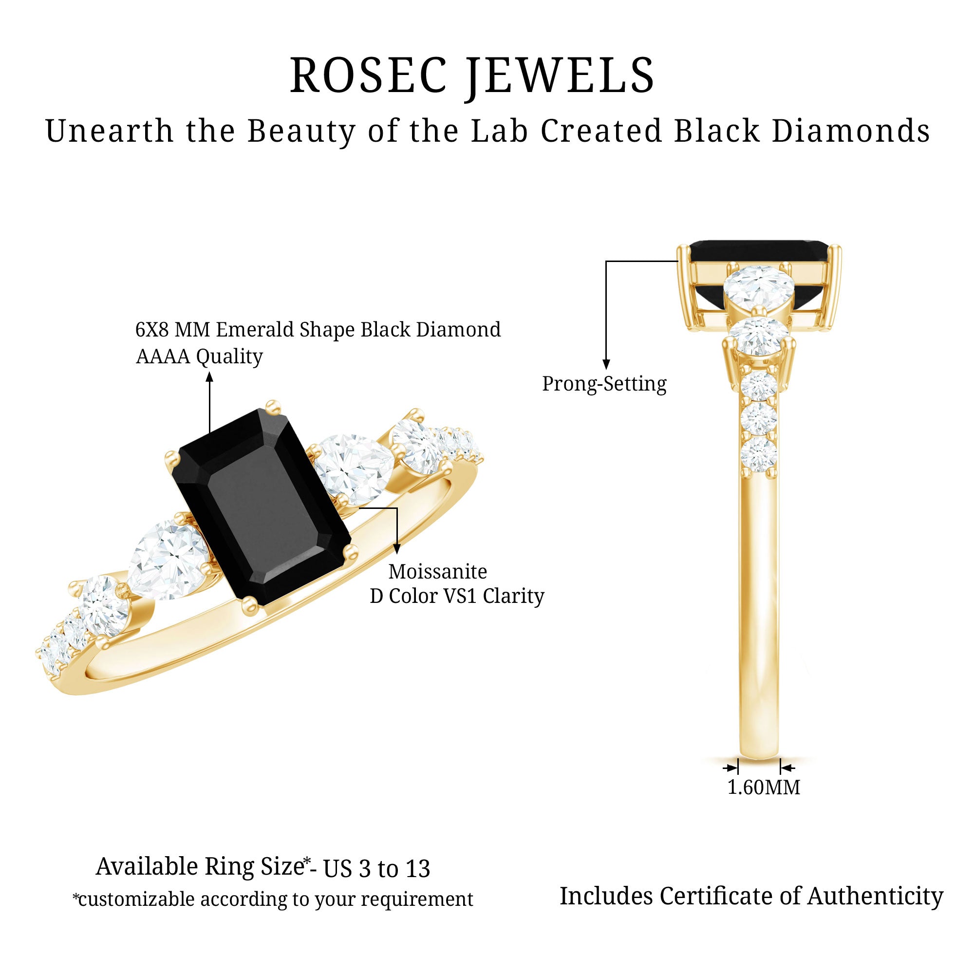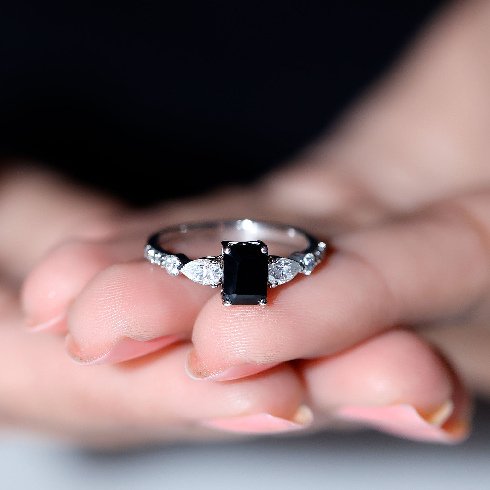 Heres an elegant Engagement Ring for your lady love. Showcasing Emerald Cut Created Black Diamond secured in 4 Prong Setting while Pear and Round Shape Moissanite studded on its shank. The Created Black Diamond Ring will enhance her style and fill her day with sweet and pleasant compliments. A charming wedding ring for your partner, something she would never like to keep away from herself.