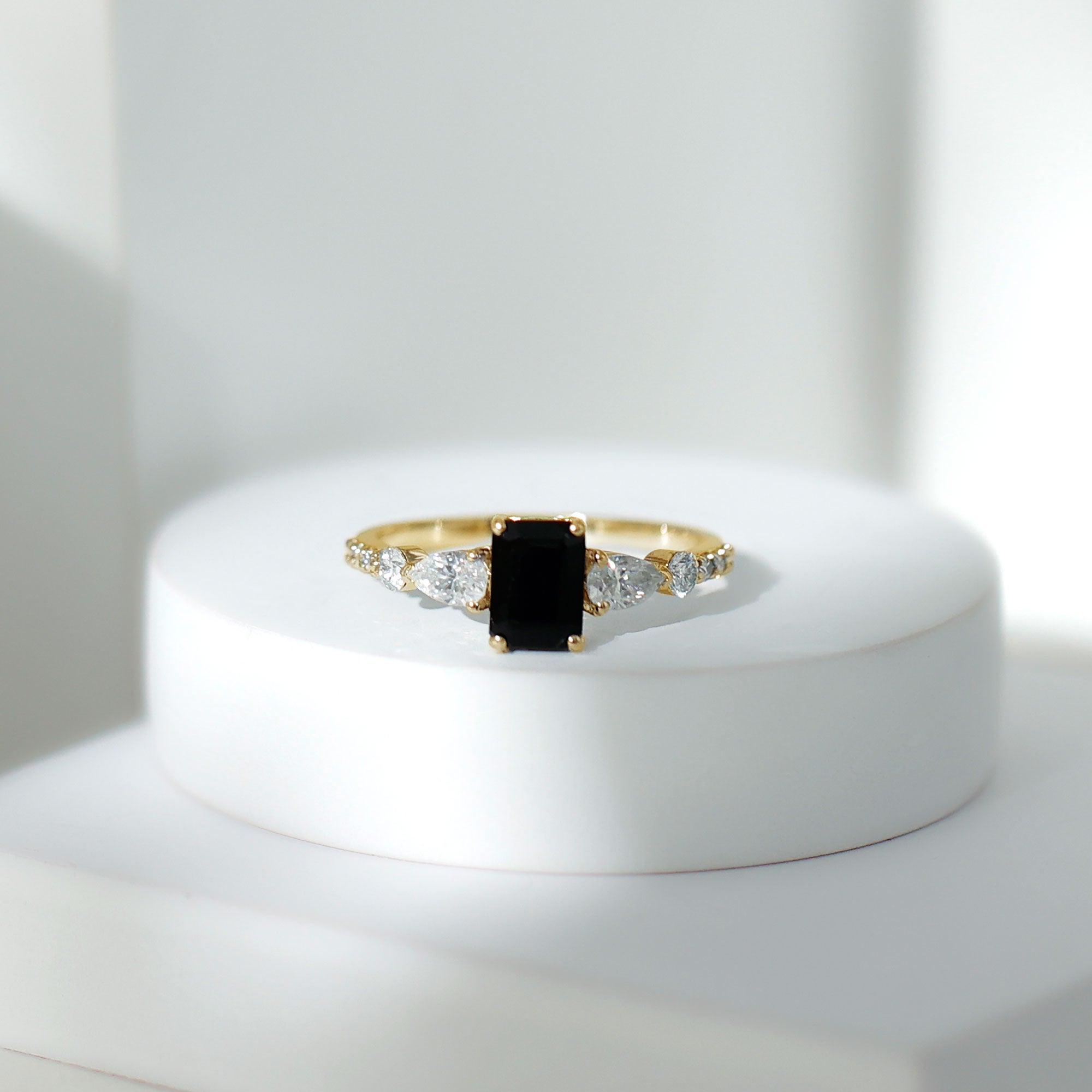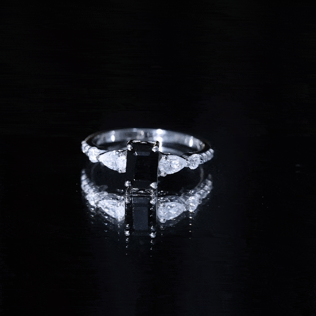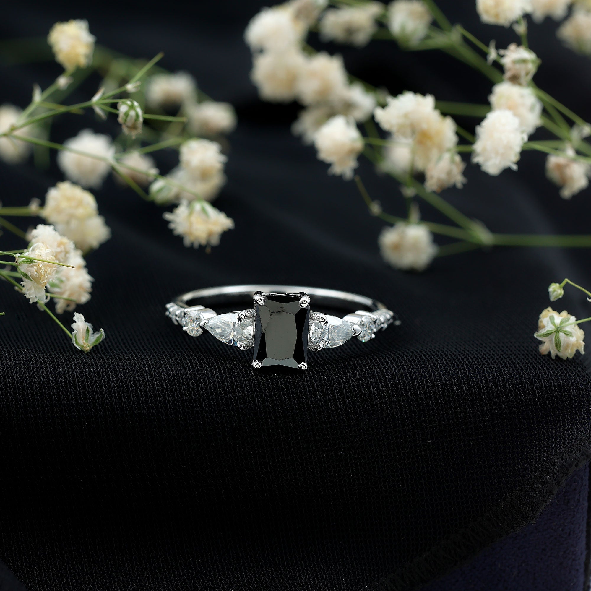 Heres an elegant Engagement Ring for your lady love. Showcasing Emerald Cut Created Black Diamond secured in 4 Prong Setting while Pear and Round Shape Moissanite studded on its shank. The Created Black Diamond Ring will enhance her style and fill her day with sweet and pleasant compliments. A charming wedding ring for your partner, something she would never like to keep away from herself.