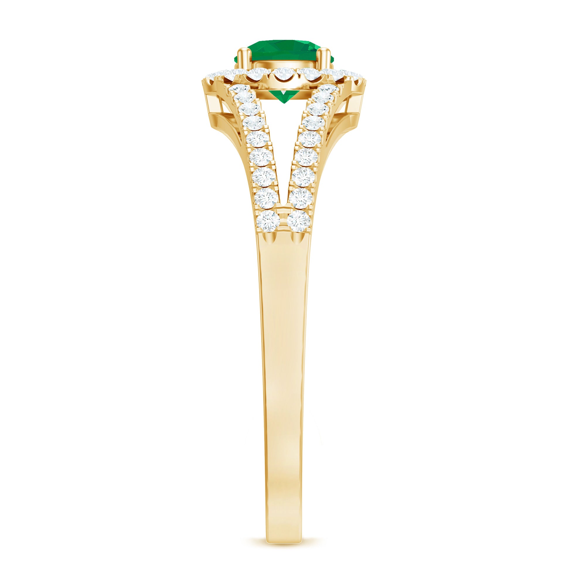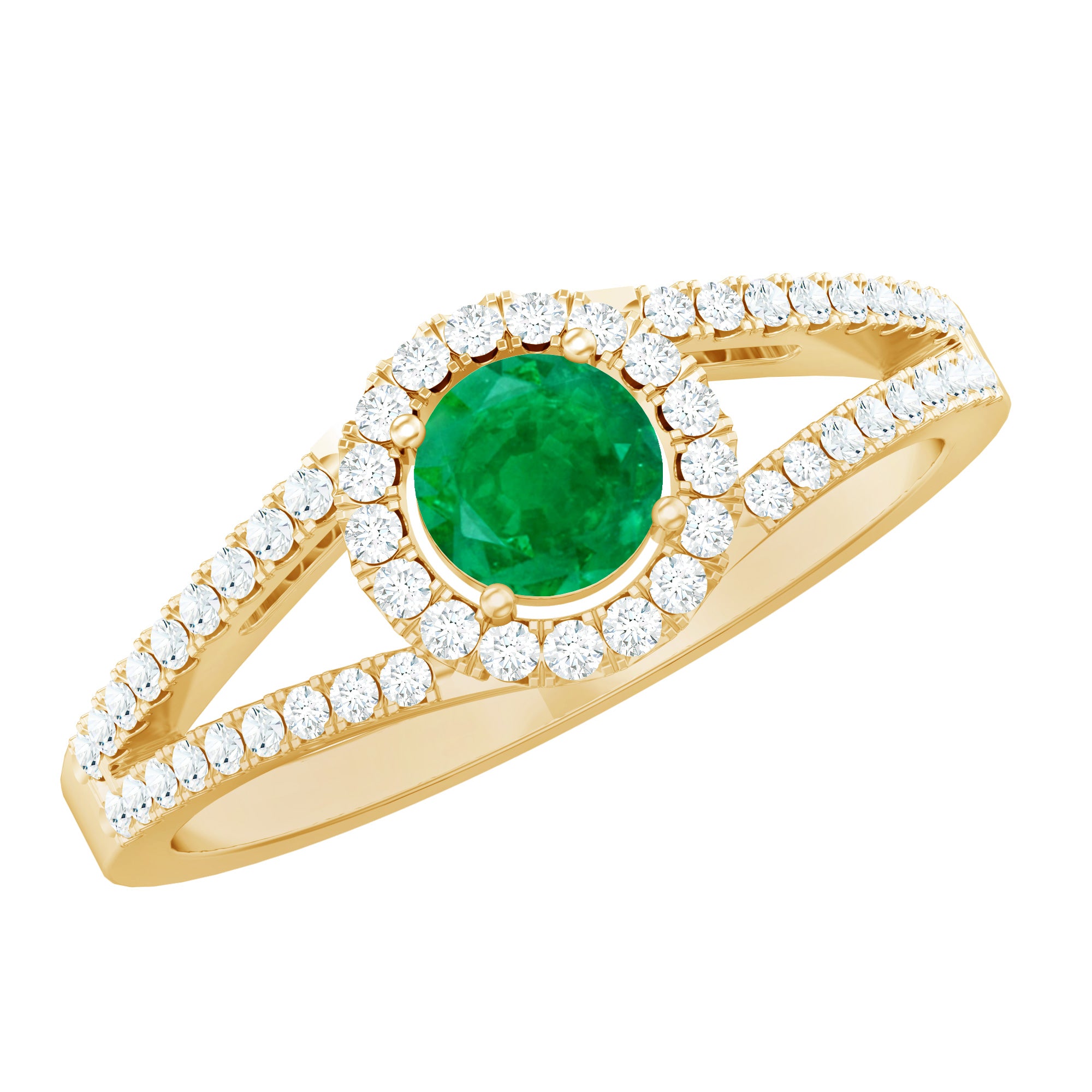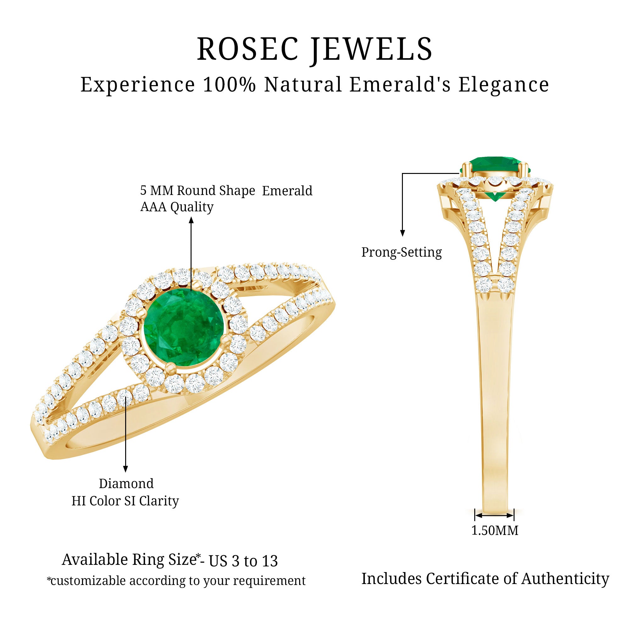 Unveil the magic of everlasting love with this Classic Engagement Ring, a stunning fusion of elegance and modern romance. This Fine Engagement Ring features a 5 mm Round Shape Emerald set in Prong Setting, captivated with a rich, enchanting green, while a Halo of sparkling Diamond stones elevates its brilliance, creating a radiant frame that dazzles from every angle. The Diamond accented Split Shank adds a touch of sophistication and contemporary flair, gracefully guiding the eye toward the mesmerizing center stone. Available in a variety of sizes for the perfect fit, this Emerald Diamond Engagement Ring arrives in a signature jewelry box, ready to transform celebrations into unforgettable memories. This Split Shank Engagement Ring is a symbol of commitment, a reflection of shared passion and a timeless keepsake that will be cherished for generations. With its luminous sparkle and meticulous craftsmanship, this Emerald Engagement Ring embodies romance, elegance and the promise of forever.