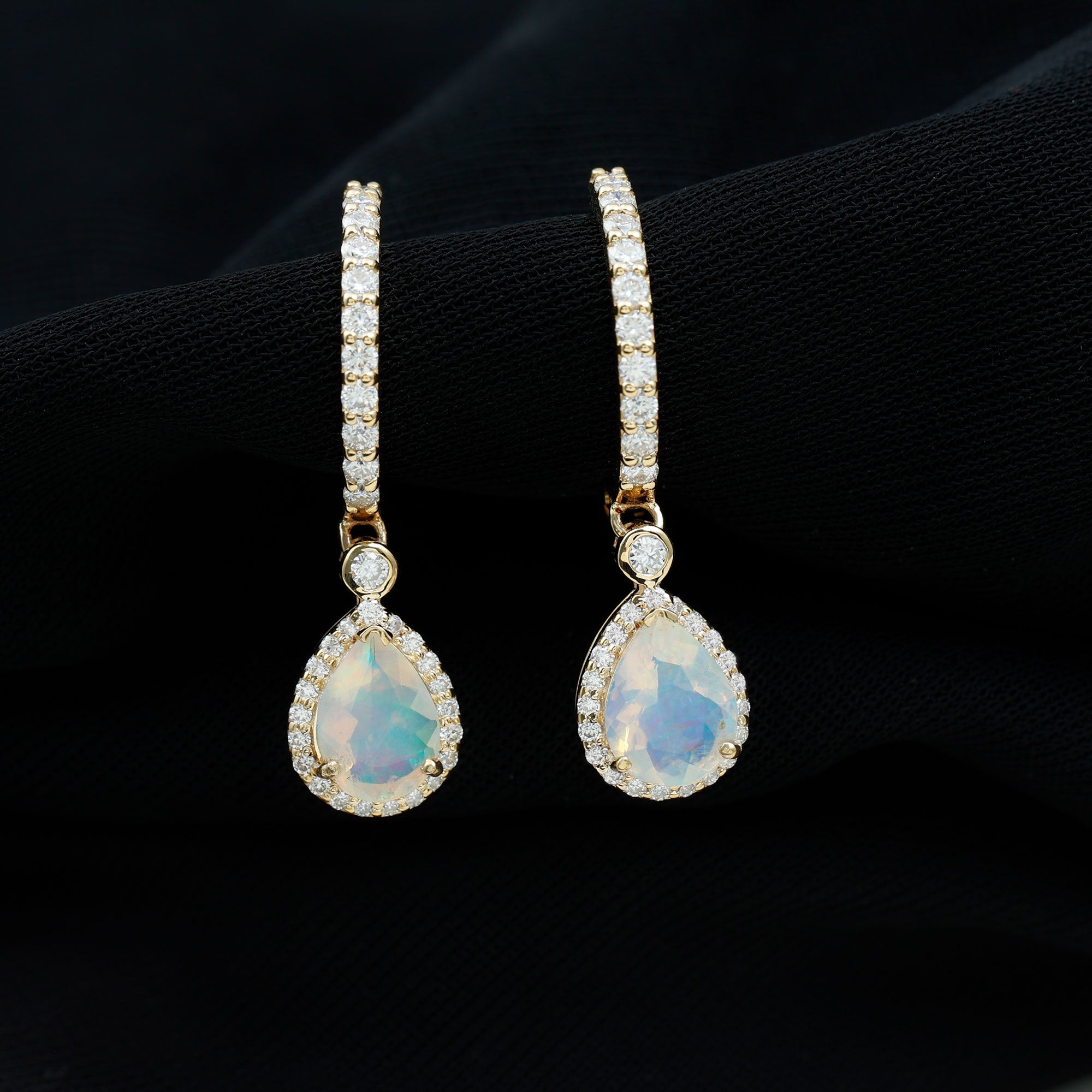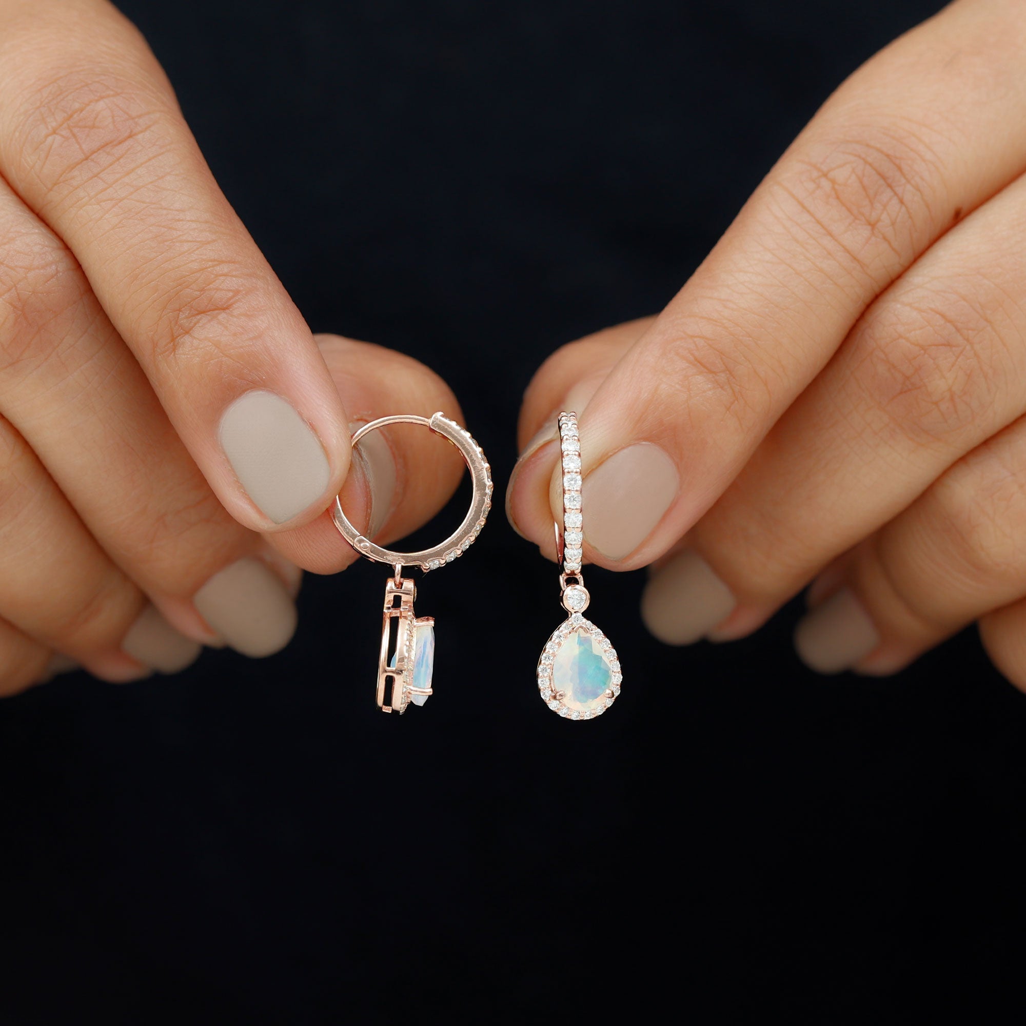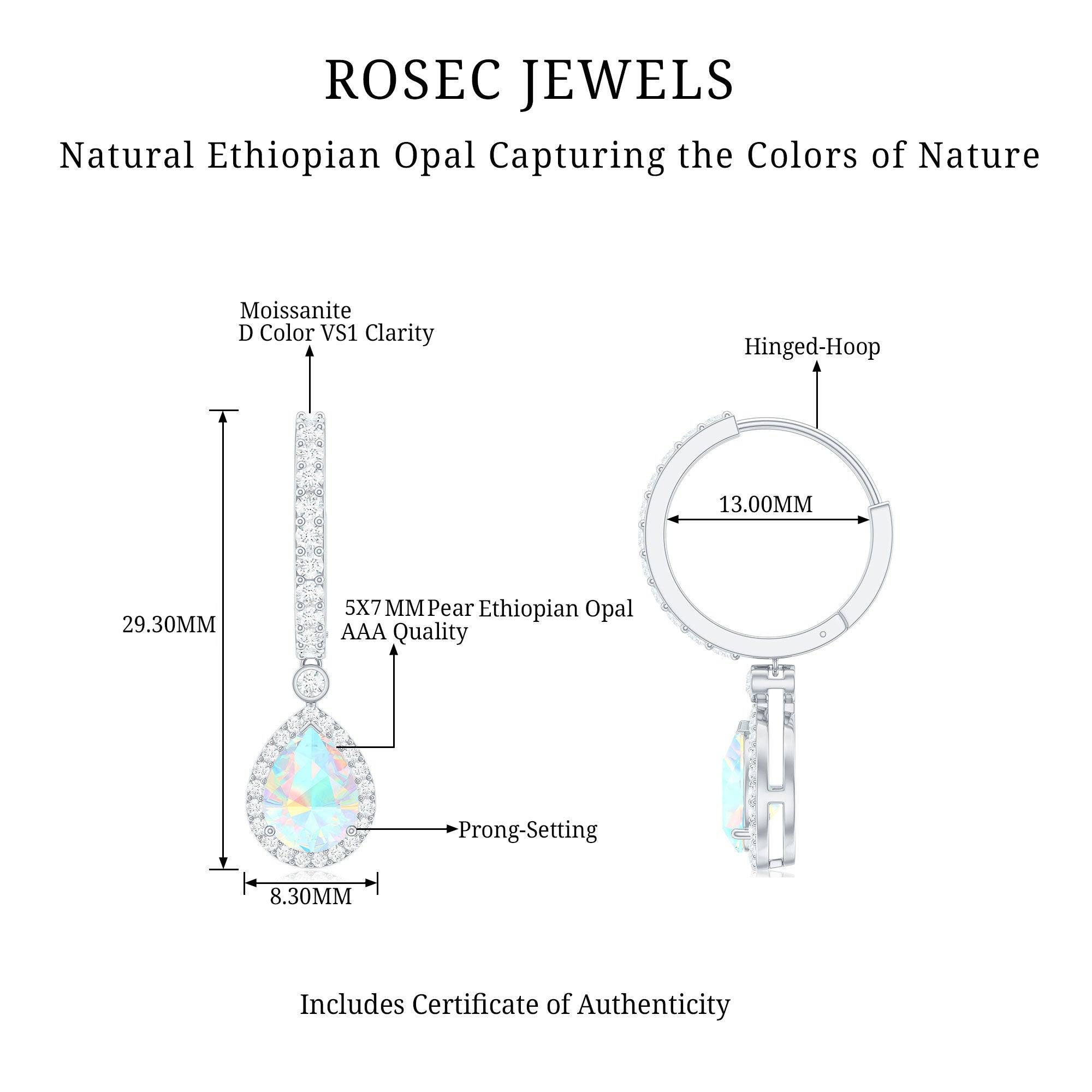 Enhance your party look and captivate everyones attention with these exquisite Classic Hoop Drop Earrings. These earrings feature a stunning 5X7 MM Pear Shape Ethiopian Opal Gemstone as the central drop, encircled by a dazzling Moissanite Halo. To further enhance their brilliance, similar Moissanite gemstones are meticulously studded over the front face of the Hoop Earrings.