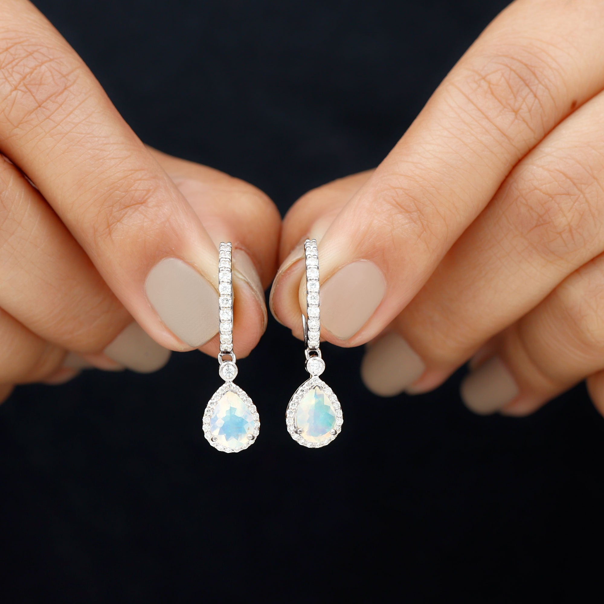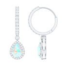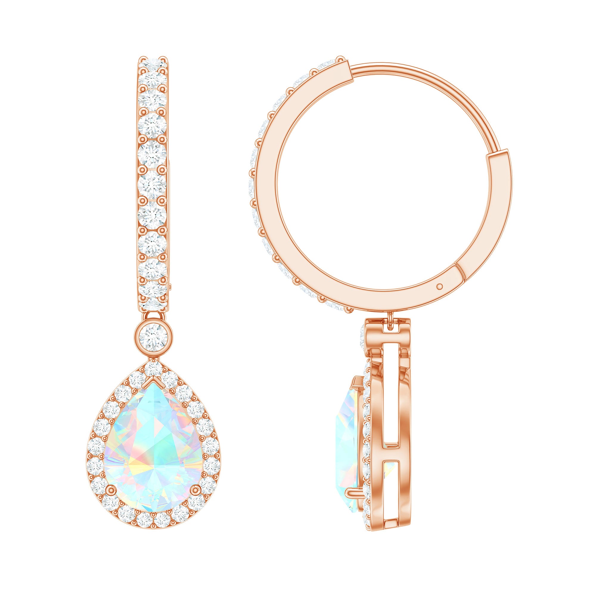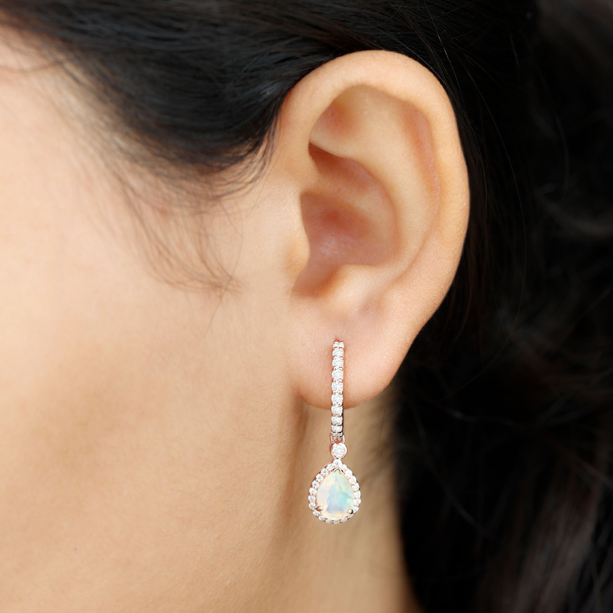 Enhance your party look and captivate everyones attention with these exquisite Classic Hoop Drop Earrings. These earrings feature a stunning 5X7 MM Pear Shape Ethiopian Opal Gemstone as the central drop, encircled by a dazzling Moissanite Halo. To further enhance their brilliance, similar Moissanite gemstones are meticulously studded over the front face of the Hoop Earrings.
