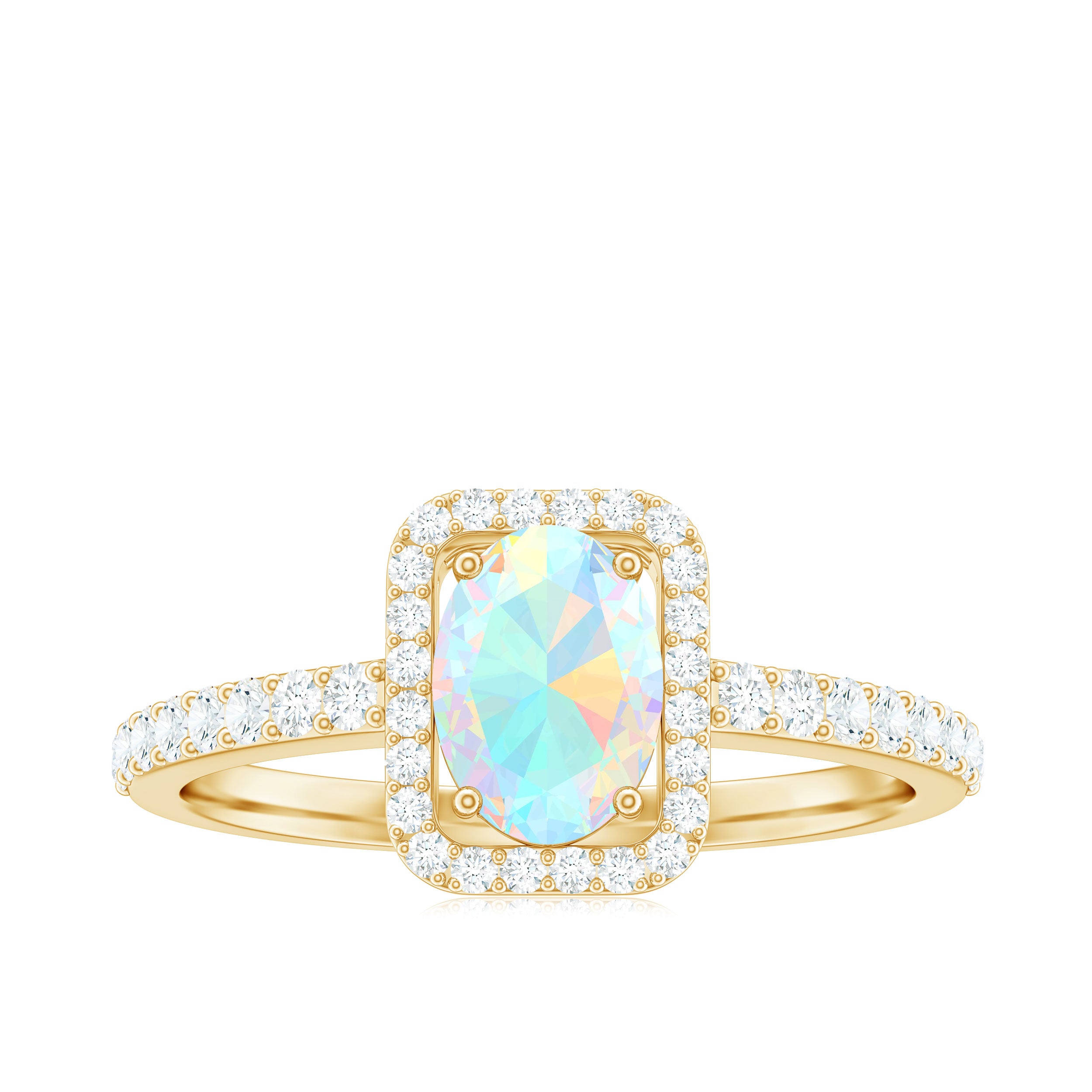 A breathtaking expression of love and luxury, this Ethiopian Opal Engagement Ring is a true masterpiece. At its center lies an enchanting 5X7 mm Oval Shape Ethiopian Opal of AAA Quality in Prong Setting. Set within a sleek rectangular frame, the Opal is beautifully complemented by a shimmering Halo of Diamond stones, casting a mesmerizing sparkle from every angle. The Side Stones over the band further enhance the natural allure of Opal, adding a touch of elegance and sophistication to the design. With its timeless design and captivating beauty, this Oval Engagement Ring is a reflection of the bond you share. Available in various sizes and presented in an elegant jewelry box, this Classic Engagement Ring with Opal is ready to accompany you on the most important journey of your life. This Opal and Diamond Ring is a testament to your eternal love, crafted to shine as brightly as your shared dreams.