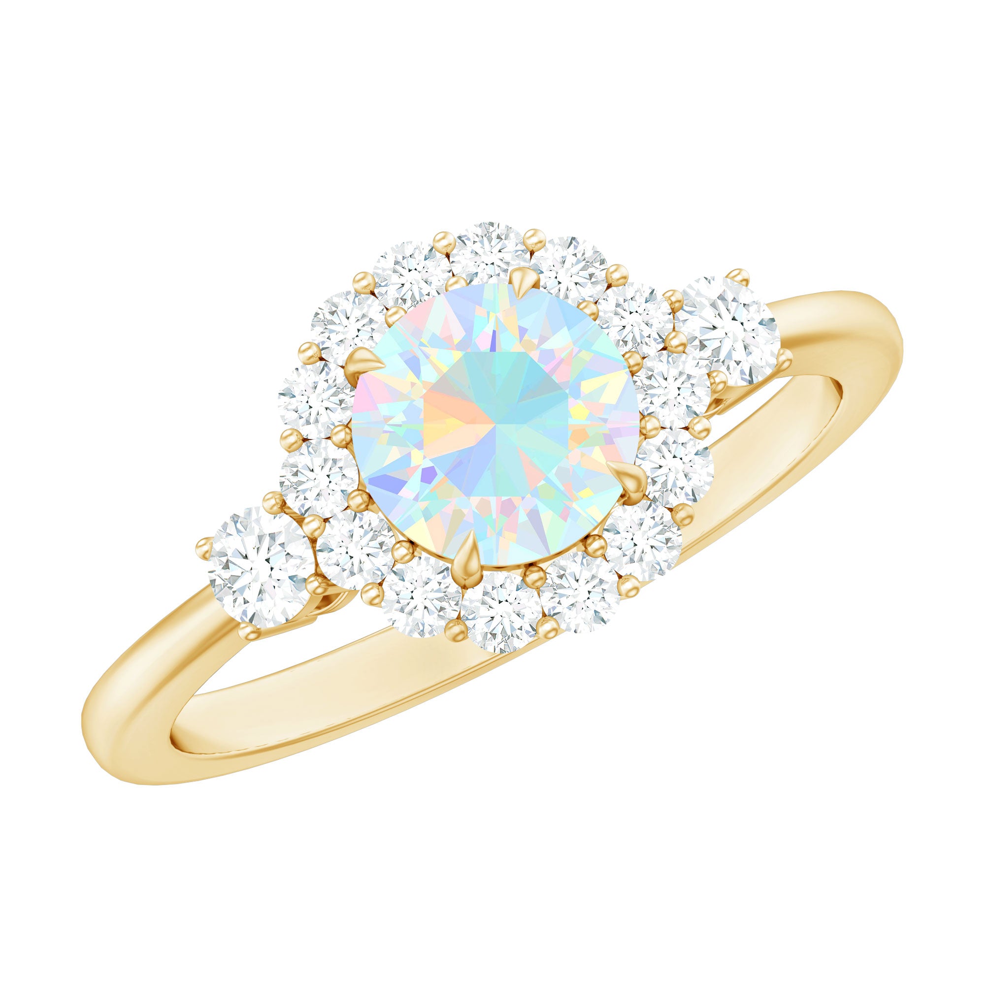 Dreamy and mesmerizing, this Classic Engagement Ring is made for the kind of love that feels both effortless and eternal. This Fine Engagement Ring features a glowing 6 mm Round Shape Ethiopian Opal that catches the light with every movement, revealing a soft rainbow of hues. Framed by a sparkling Diamond halo, the centerpiece is elevated to pure magic. On each side, a dainty Diamond adds just the right touch of elegance, like two stars guiding your forever journey. The design of this Opal and Diamond Ring is graceful yet unforgettable, blending classic beauty with a hint of whimsy, perfect for someone romantic at heart. Whether you are planning a surprise or choosing a ring together, this Halo Engagement Ring with Opal is a heartfelt symbol of strength and the lasting glow of love. Packaged in a beautiful jewelry box and available in a range of sizes, this Real Opal Engagement Ring is ready to fit perfectly into your most unforgettable moment.