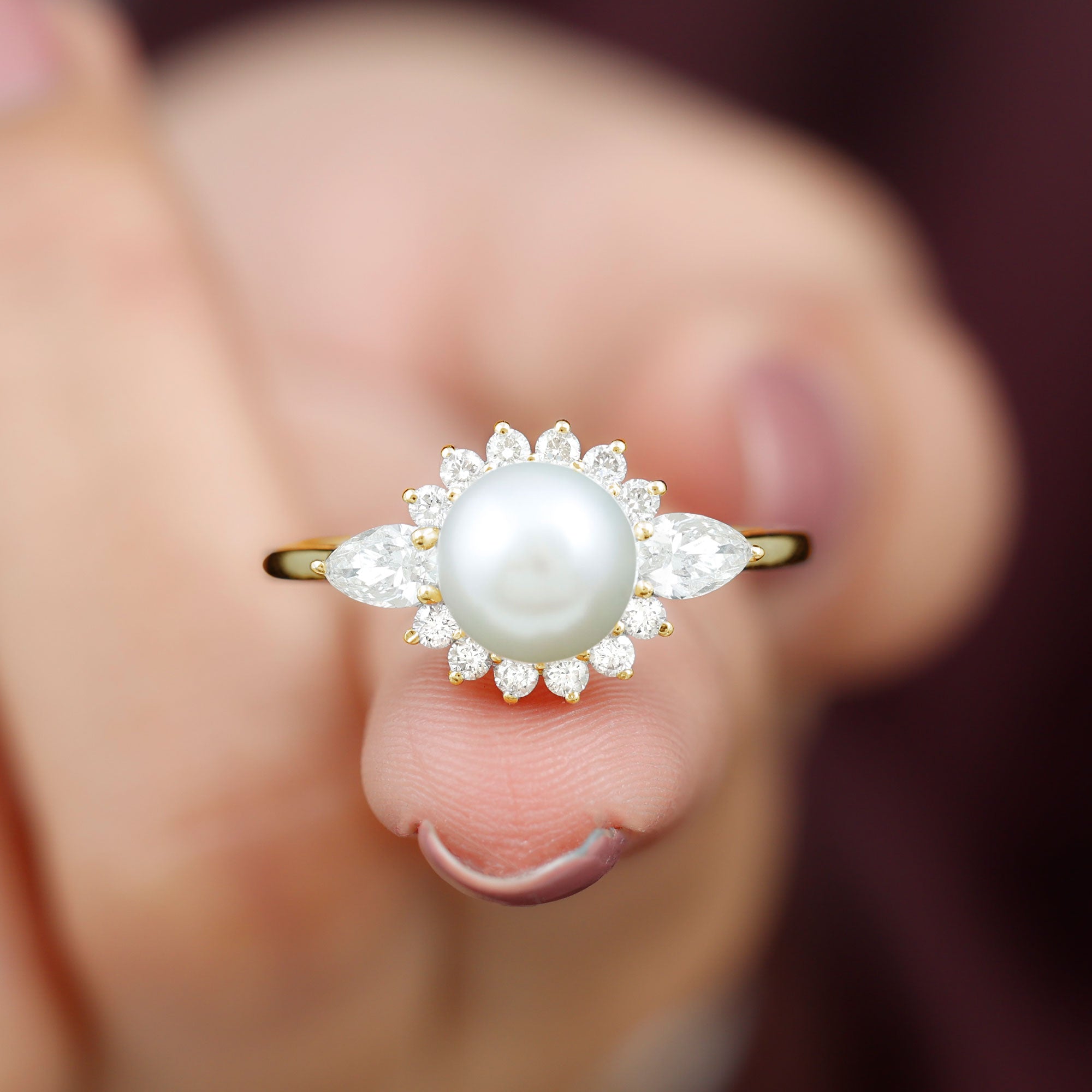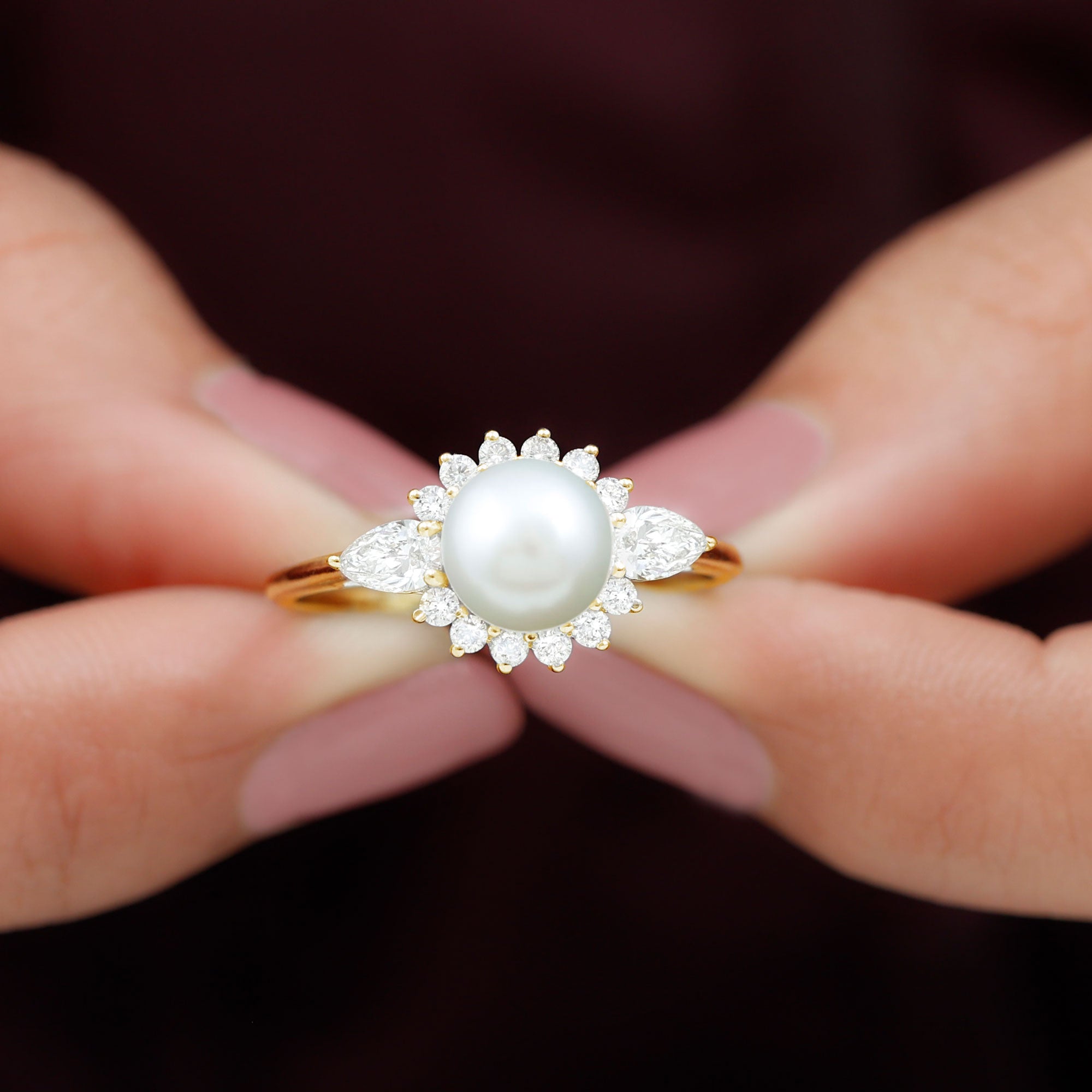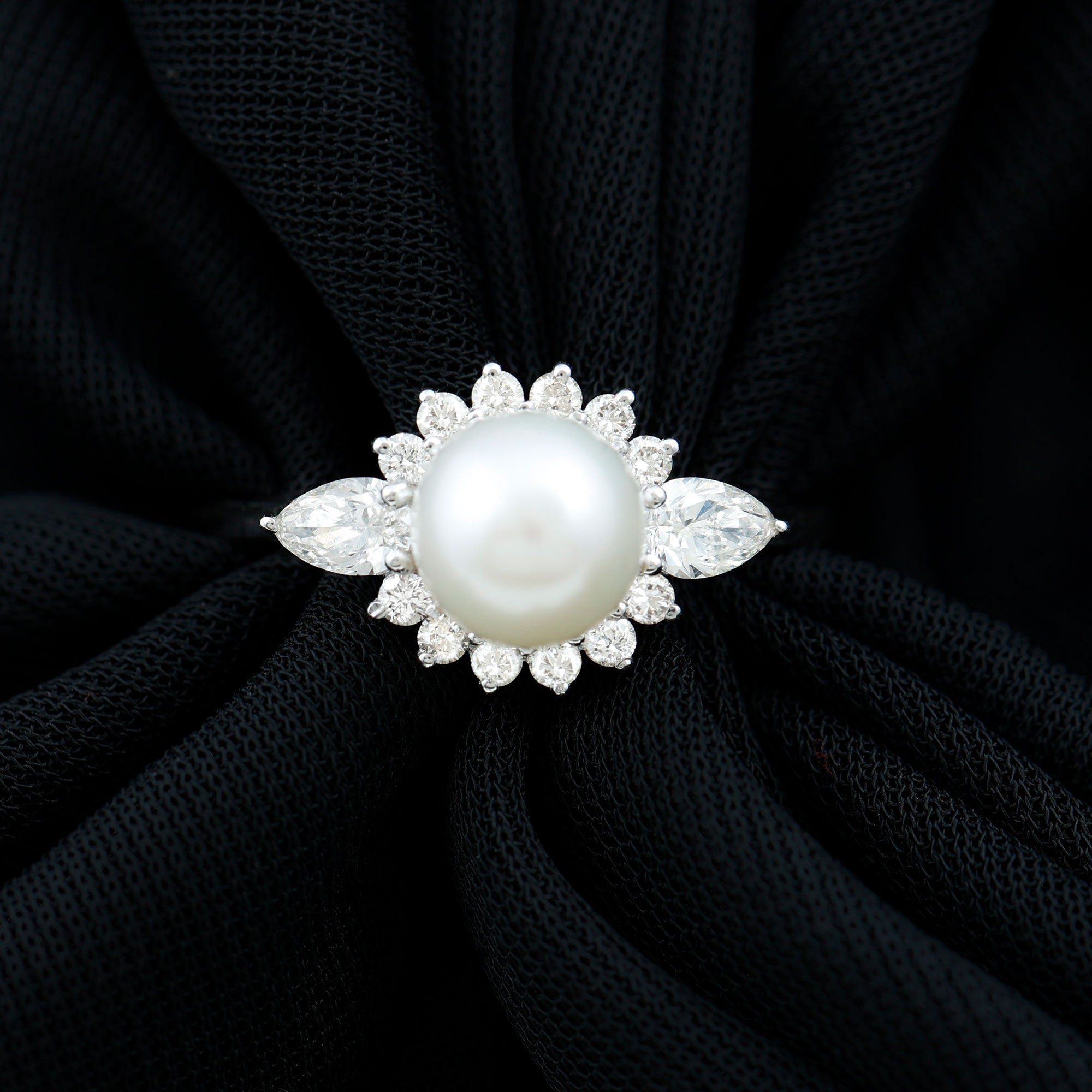 This Freshwater Pearl Halo Engagement Ring is a beautiful addition to any jewelry collection. Featuring a round-shape freshwater pearl as the centerpiece, surrounded by a halo of pear and Round Shape Diamond in a prong setting. The freshwater pearl displays AAA quality and is believed to bring faith, innocence, and personal integrity to the wearer. The durability and luster of this gem make it highly desirable.