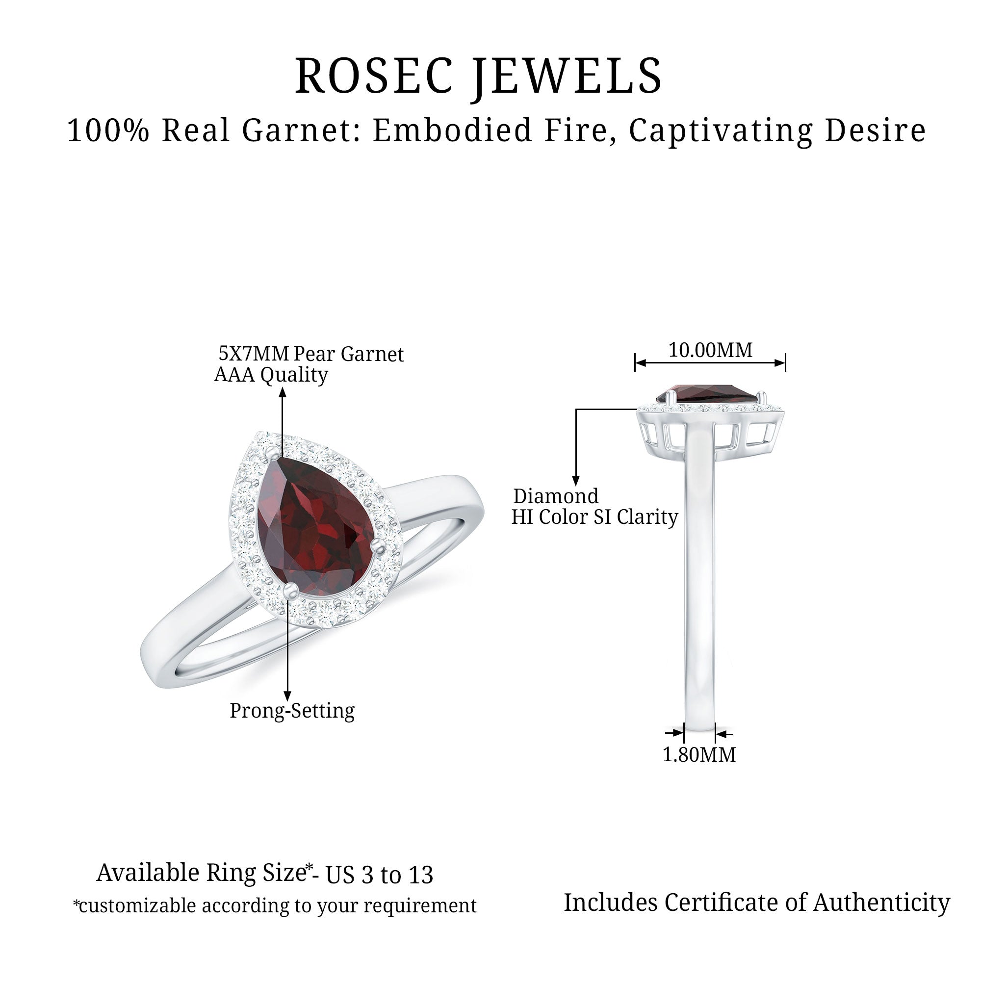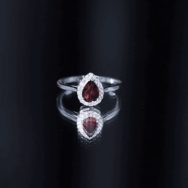 This engagement ring features a teardrop-shaped garnet as the centerpiece, surrounded by a halo of diamonds that enhance the gemstone’s rich color and brilliance. The combination of the deep red garnet and sparkling diamond accents creates a visually striking ring design.