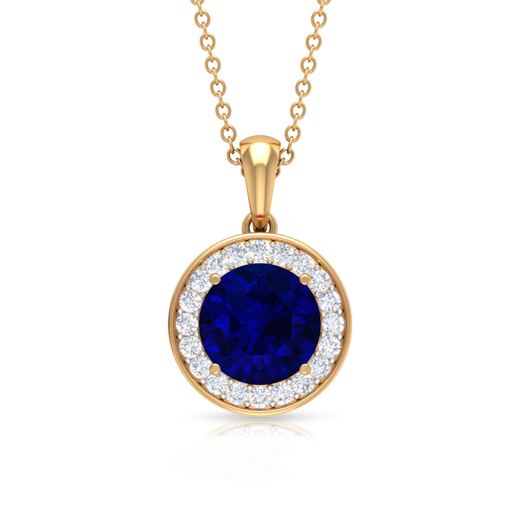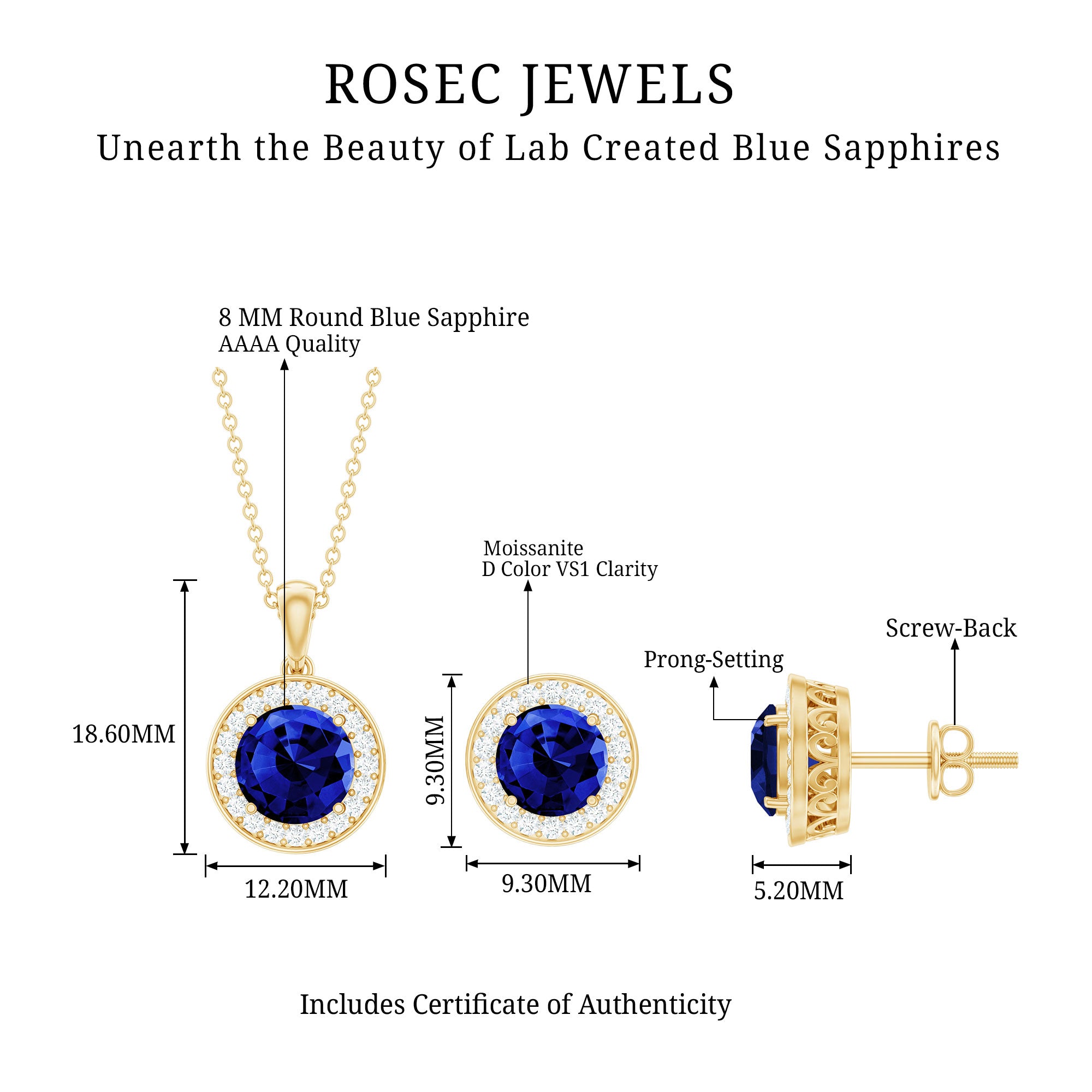 Get ready to dazzle with our Halo Pendant and Earring Set, embellished with round lab grown blue sapphire wrapped in a halo frame of moissanite, creating a sparkling contrast. Embrace your appearance with this sapphire jewelry set a versatile piece that elevates every style and any occasion. The elegant blue hue and eternal shine of moissanite make this halo jewelry a symbol of sophistication you must wear.