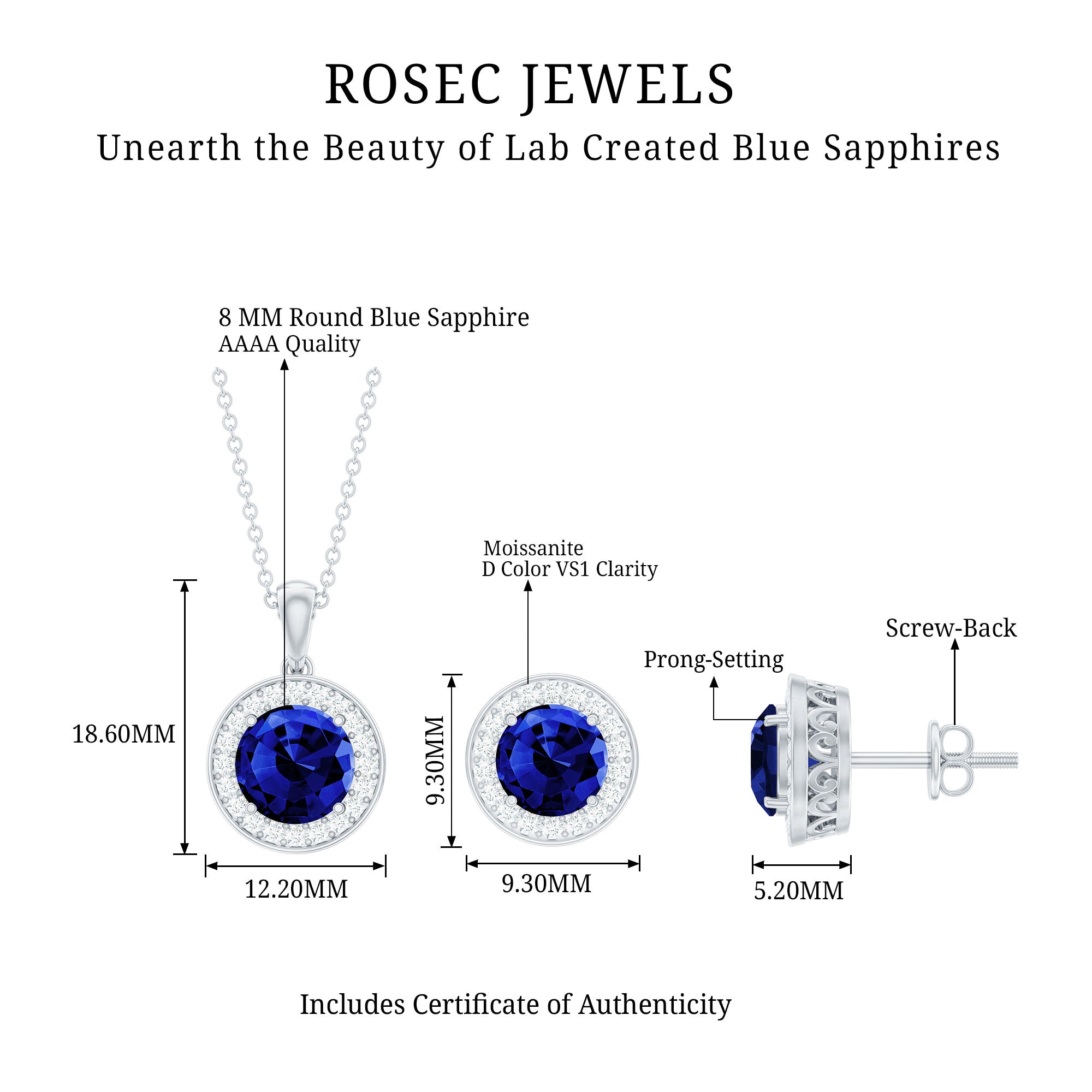 Get ready to dazzle with our Pendant and Earring Set, embellished with round lab grown blue sapphire wrapped in a halo frame of moissanite, creating a sparkling contrast. Embrace your appearance with this Sapphire Jewelry Set, a versatile piece that elevates every style and any occasion. The elegant blue hue and eternal shine of moissanite make this Halo Jewelry Set a symbol of sophistication you must wear. The Stud Earrings come with a secure Screw Back Closure for your peace of mind and everyday convenience, while the Pendant flows elegantly on a sleek chain that complements virtually any outfit in your wardrobe. Whether it is for a coffee date or your wedding day, this Blue Sapphire Necklace Set transitions effortlessly and adds a glow that is sure to catch attention. This Sapphire and Moissanite Necklace Set is beautifully presented in a signature jewelry box, making it a thoughtful and personal surprise that is ready to gift.