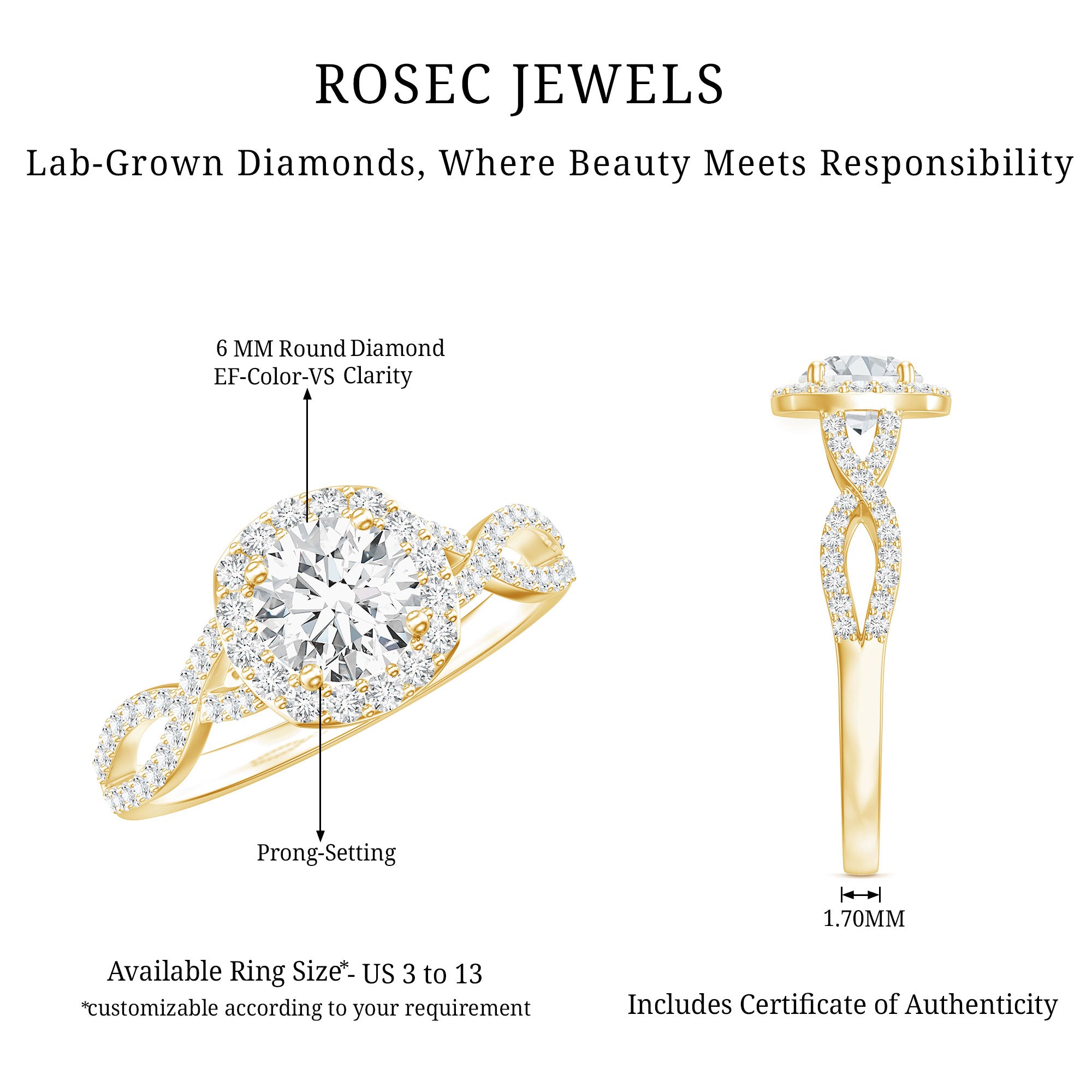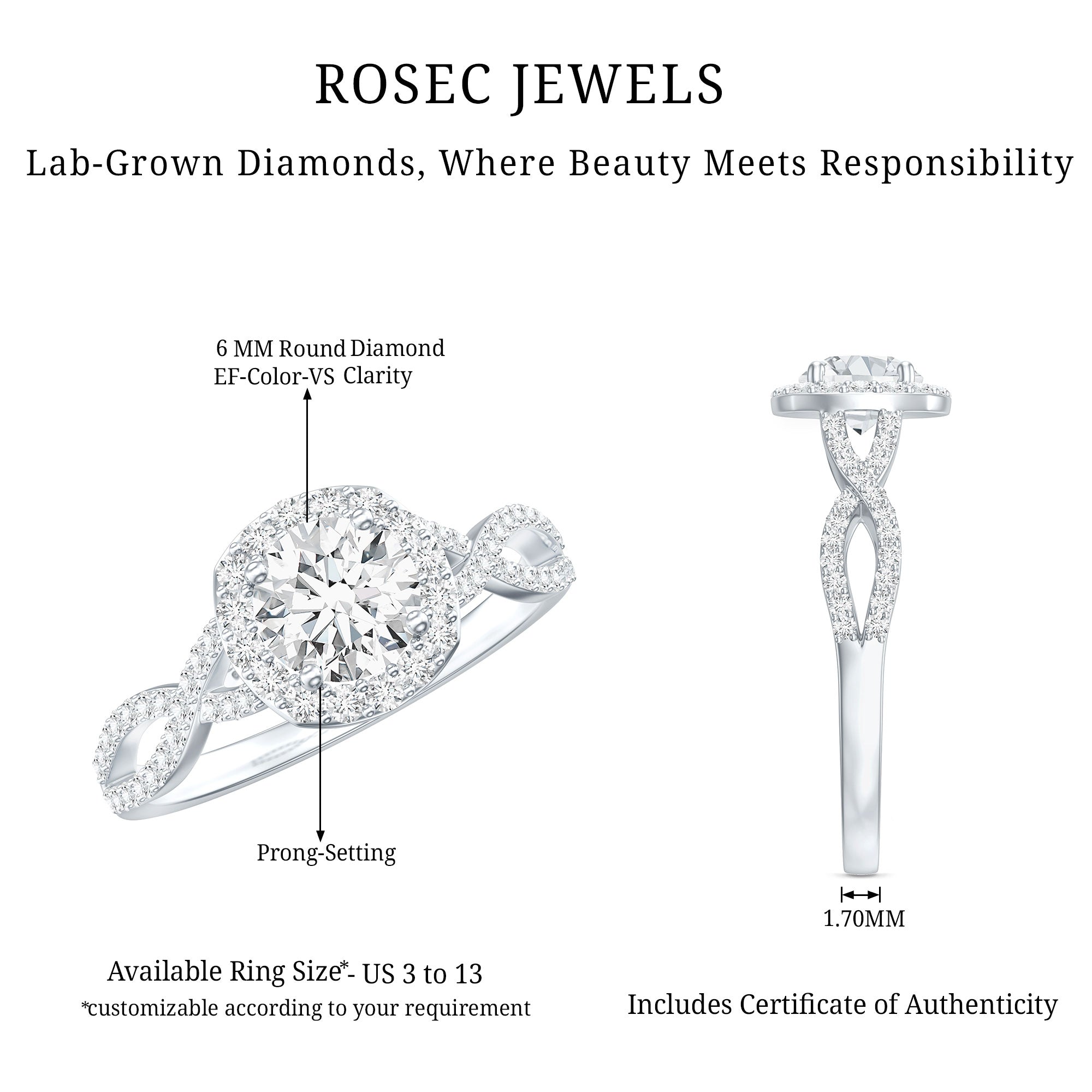 Presenting this exquisite Lab Grown Diamond Engagement Ring, which beautifully blends classic elegance with contemporary charm. The band of this Crossover Ring features two strands embellished with round cut diamonds that intertwine gracefully, creating a stunning criss cross effect. This classic design captures attention with a central 6 MM round cut unnatural diamond (EF-VS quality), nestled in delicate prong setting and encircled by a diamond halo. Both charming and fashionable, this 1 Carat Diamond Ring represents everlasting love and reflects refined taste. Its distinctive twist in design adds a hint of sophistication to this timeless piece. This Diamond Halo Engagement Ring makes for a thoughtful and budget-friendly gift for your beloved. Crafted with ethically sourced, lab grown diamonds, it provides the luxury of fine jewelry while being kind to the environment. Whether you are proposing or treating yourself to something special, this Criss Cross Diamond Ring comes in a signature jewelry box and is available in US sizes 3 to 13, ensuring every hand gets a perfect sparkle. It is ideal for marking a new chapter or simply expressing that you mean everything.