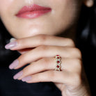 Mark your significant milestone with the sophistication of our Half Eternity Band Ring. This eternity ring boasts round-cut lab created ruby gems securely nestled in a prong setting, accentuated by a Diamond Halo, making it a captivating choice for your beloved. Meticulously crafted in a variety of metal options, it radiates a luxurious charm that contributes to its overall allure and elegance.