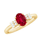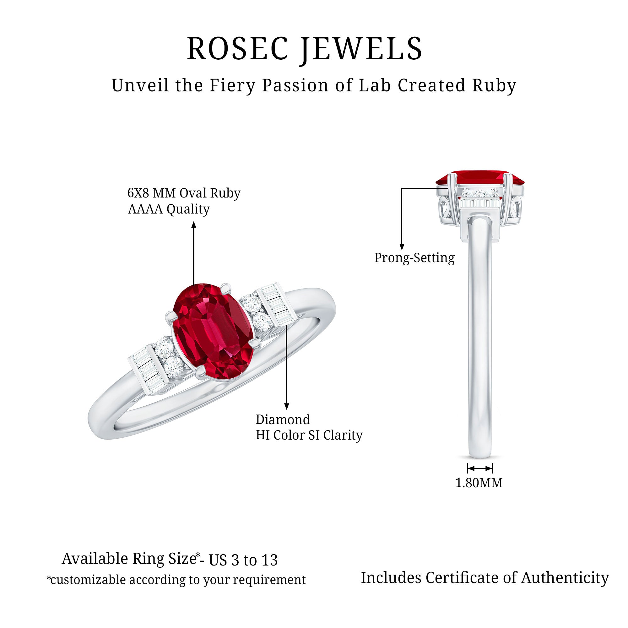Surprise her with this Lab Grown Ruby Engagement Ring that speaks louder than words, elegant, vibrant, and full of meaning. The gorgeous design centers around a 6X8 MM oval cut lab created ruby. Its deep color instantly draws attention, making it a piece that feels both powerful and graceful at the same time. On each side of the ruby, baguette and round cut diamonds are carefully set, adding the right amount of sparkle and sophistication. The contrast between the AAAA quality lab grown ruby and HI color and SI clarity diamonds creates a breathtaking effect that is hard to miss. Every detail, from the smooth band to the perfectly aligned stones, reflects quality craftsmanship and thoughtful design. What makes this Ruby and Diamond Ring special is its perfect mix of classic charm and modern flair. Together, they create a balance that is elegant, ideal for women who love jewelry with personality and style. Whether it is for an engagement, an anniversary, or just because she deserves something beautiful, this Oval Cut Engagement Ring is a true showstopper. Comfortable for everyday wear yet dazzling enough for special occasions.