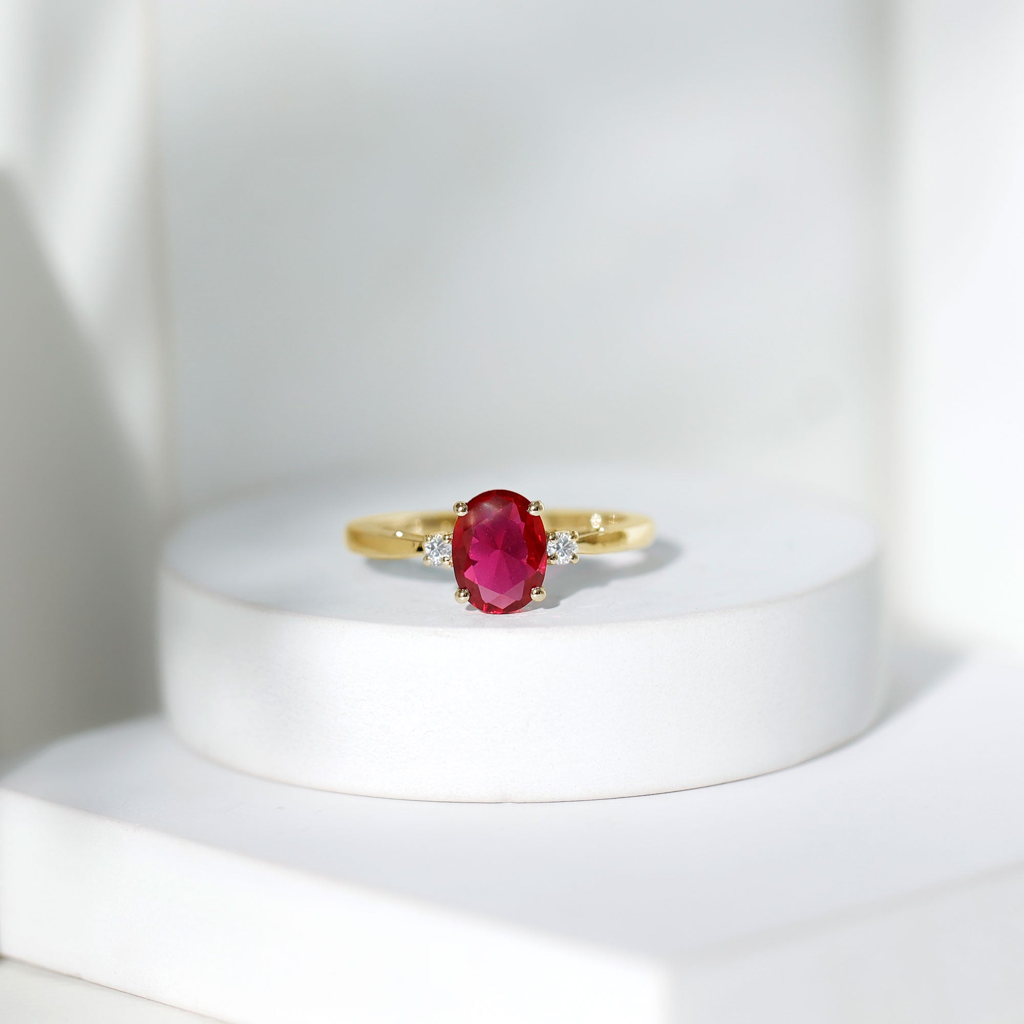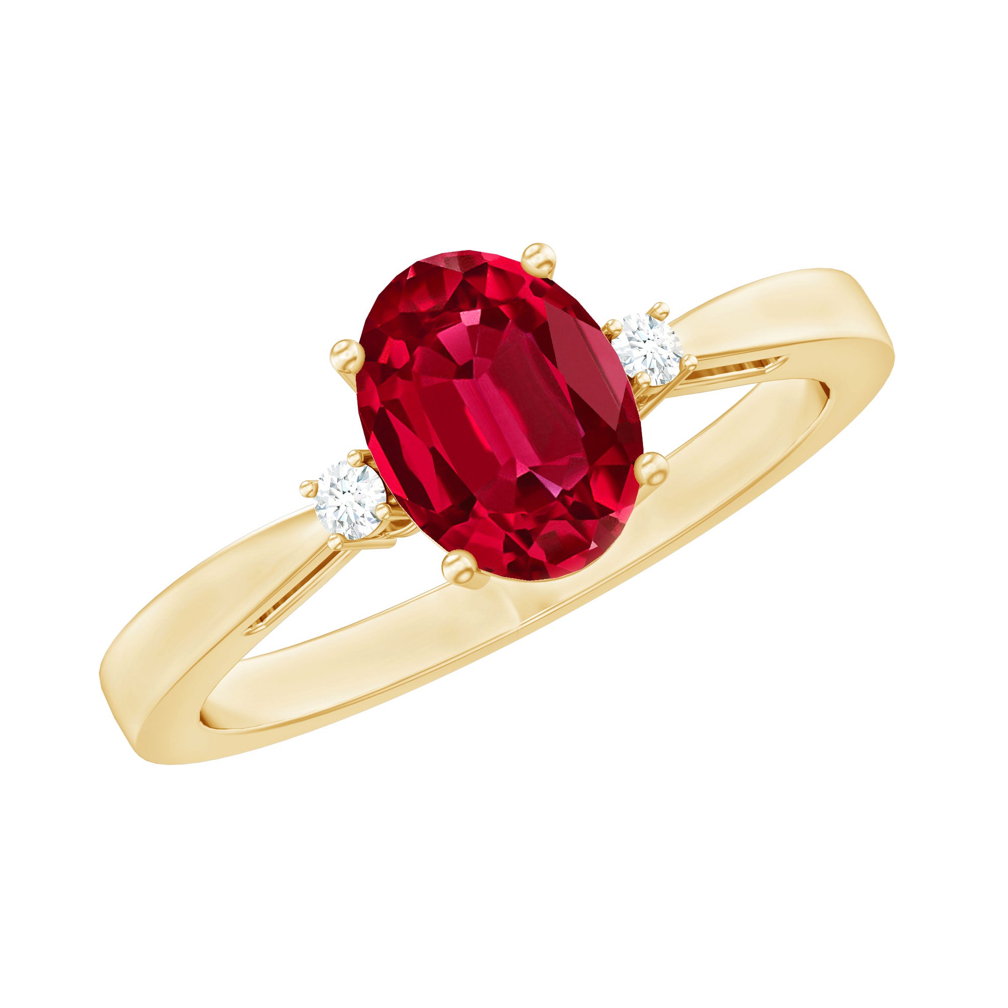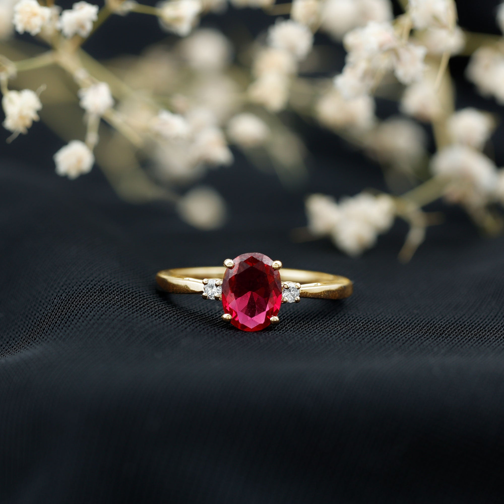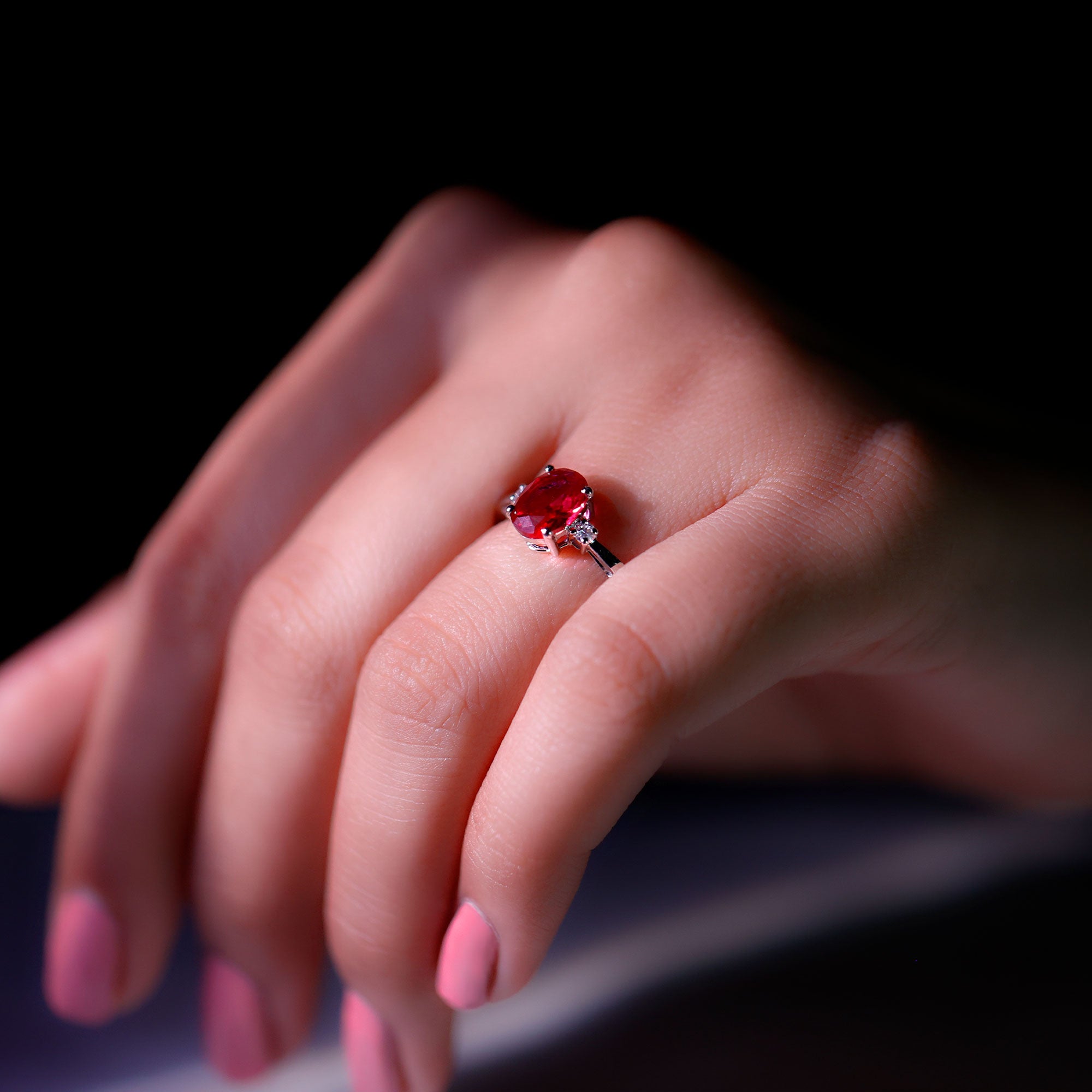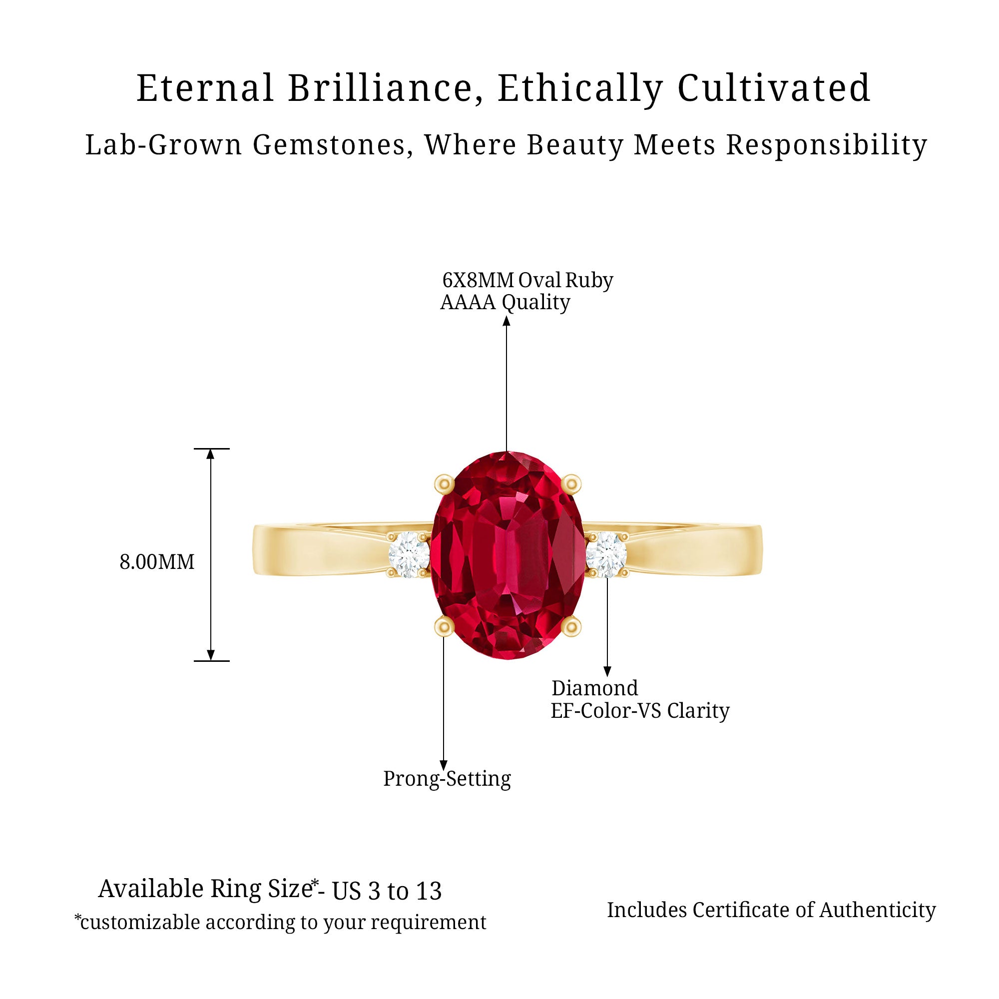 Begin your happily ever after with this Solitaire Engagement Ring, which features a 6x8 mm Oval Shaped Ruby (Lab Grown) set in a prong setting in the center, accentuated with round cut Lab Grown Diamond side stones. The radiance of red rubies is sure to leave a lasting impression on her heart. This Aaaa quality Oval Ruby Ring is not just an engagement ring, its a reflection of your everlasting bond. This Ruby and Diamond Ring become a treasured piece in her jewelry collection that she will admire for a lifetime. Enjoy every moment with the sustainable and unique jewelry by Rosec Jewels, where each piece defines timeless elegance and exquisite detailing.