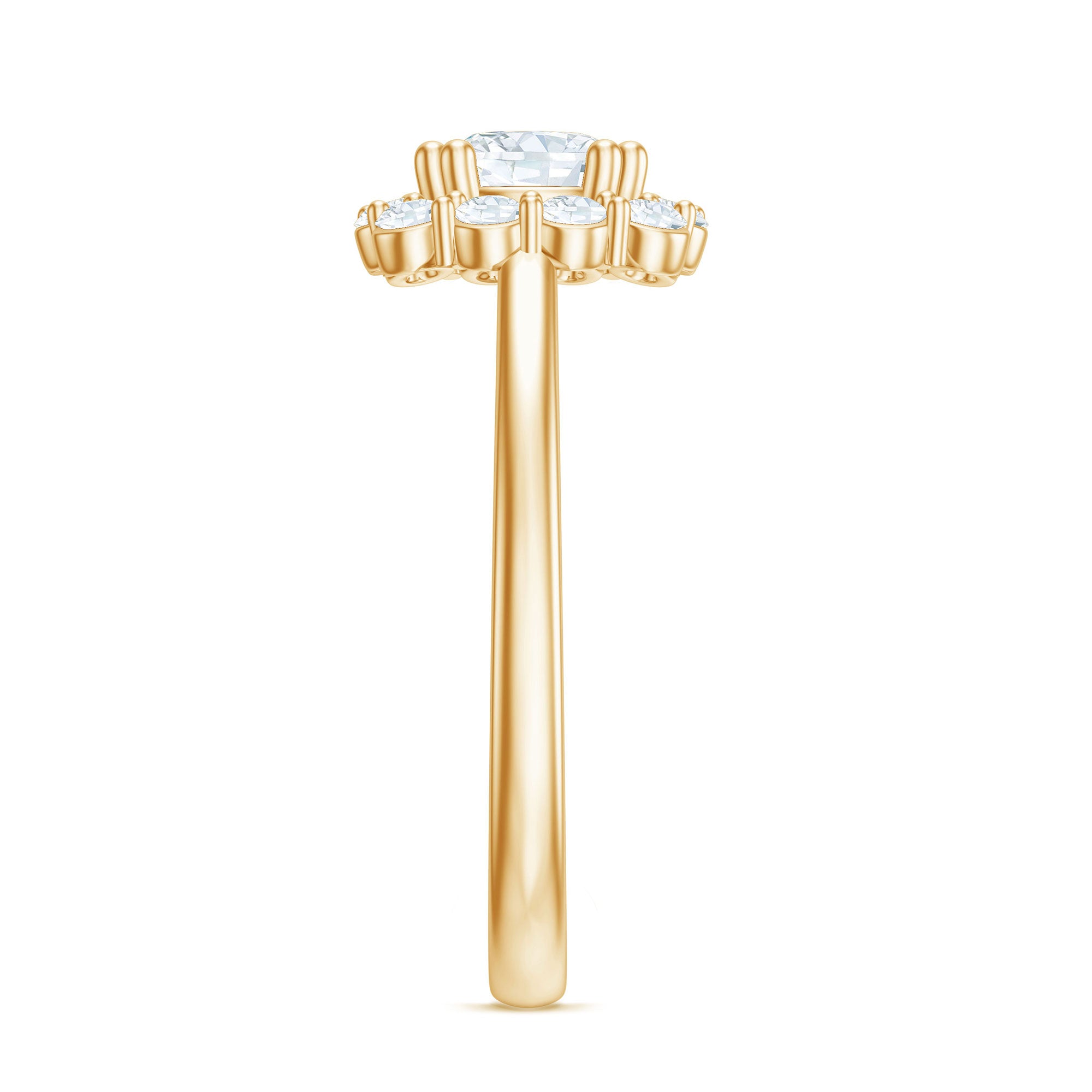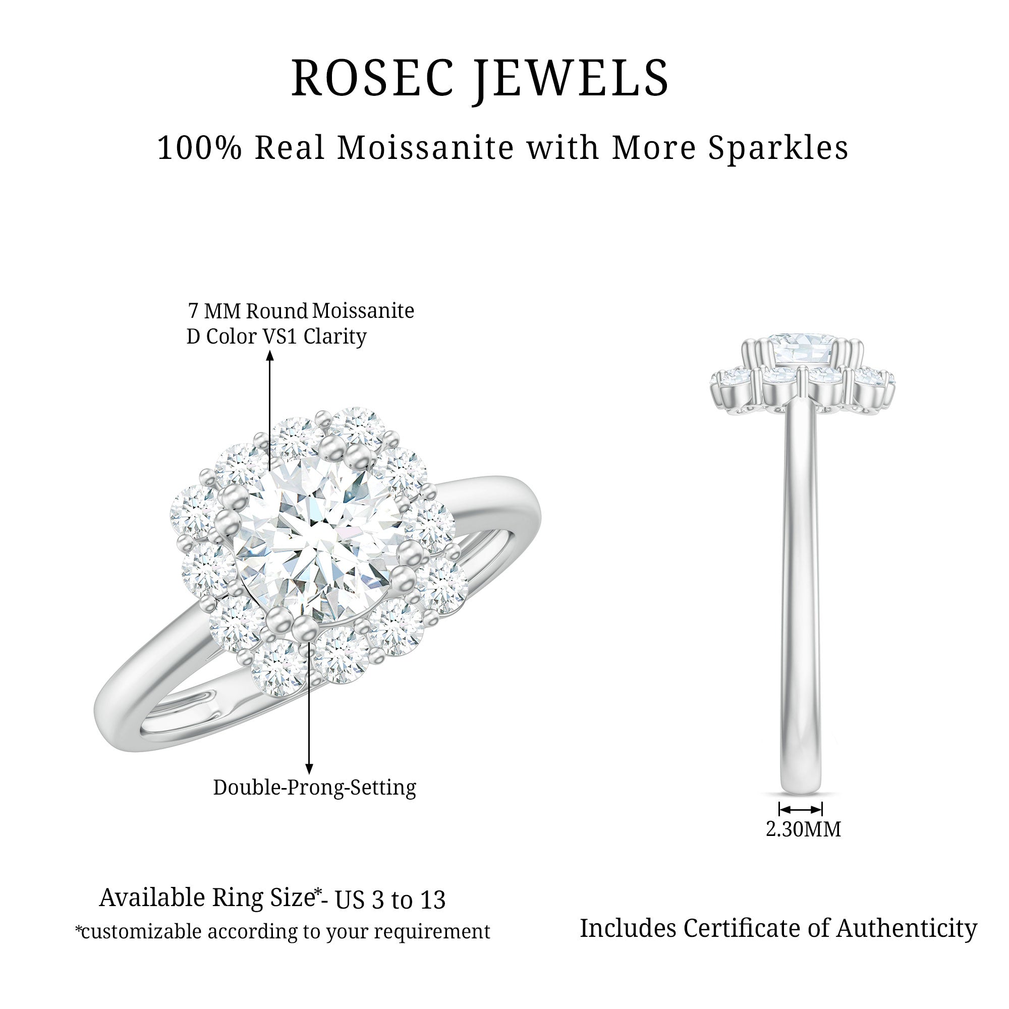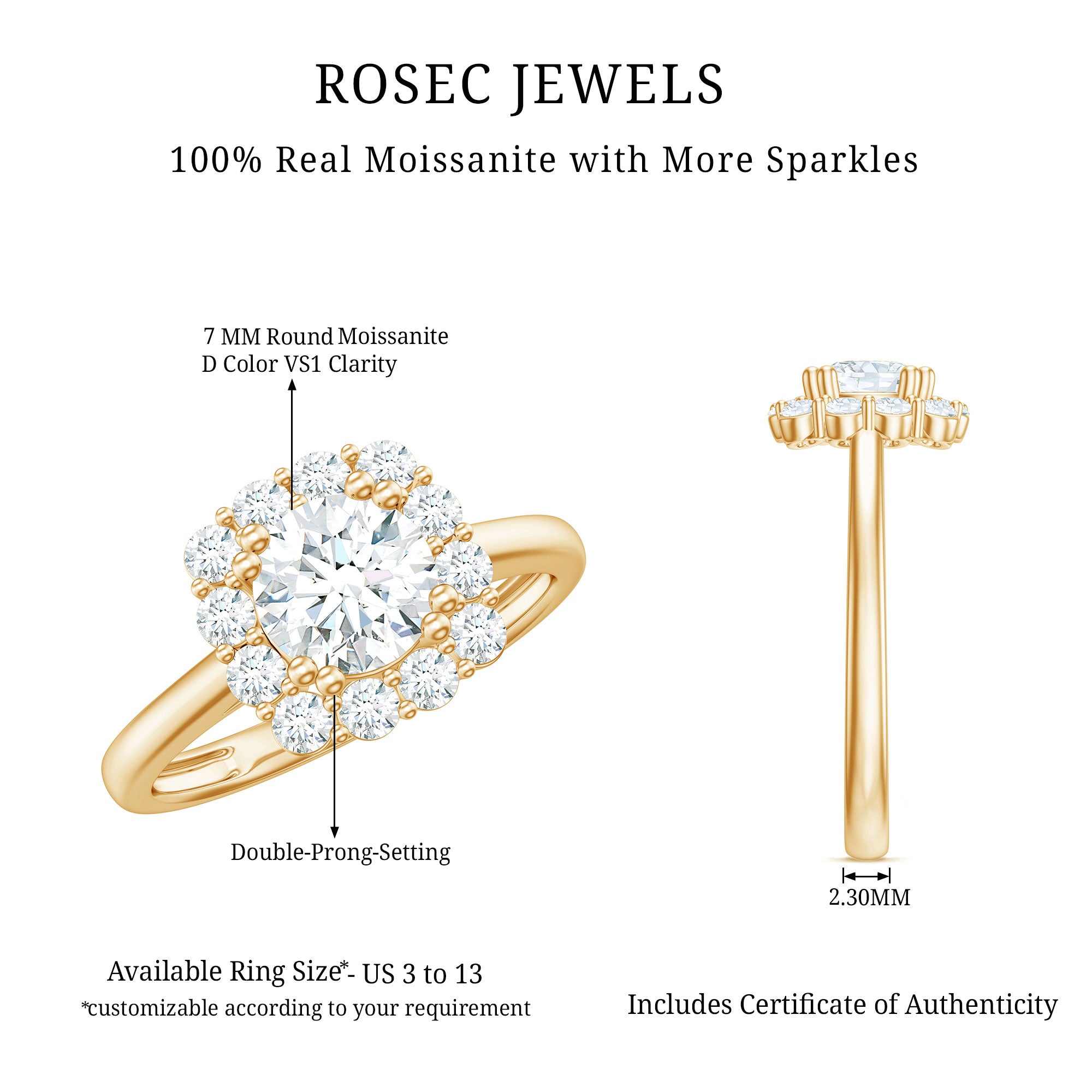 Start your forever with the stunning Moissanite Halo Engagement Ring, a beautiful piece made to celebrate your love in its purest form. At the center of this classic design is a 7 MM round cut moissanite, securely held in a double prong setting and surrounded by a glowing halo of smaller moissanite stones. This halo not only enhances the center stones sparkle and brilliance but also brings an extra touch of elegance, making this Round Engagement Ring a memorable symbol of commitment. Designed for those who appreciate elegance with a purpose, this Moissanite Engagement Ring merges the allure of traditional design with the shine of sustainable gemstones. The band’s sleek profile allows the halo and center stone to shine, while still providing a comfy fit for daily wear. Whether you are planning a heartfelt proposal or wanting to upgrade a beloved piece, this Halo Ring delivers a significant message, elegant, radiant, and responsibly made. Available in US ring sizes 3 to 13, this piece guarantees a perfect fit for every bride-to-be. Packaged in a luxurious jewelry box, it’s ready to make the moment unforgettable. Let this 1 Carat Moissanite Ring be the promise you cherish every day - brilliant, eternal, and filled with love.