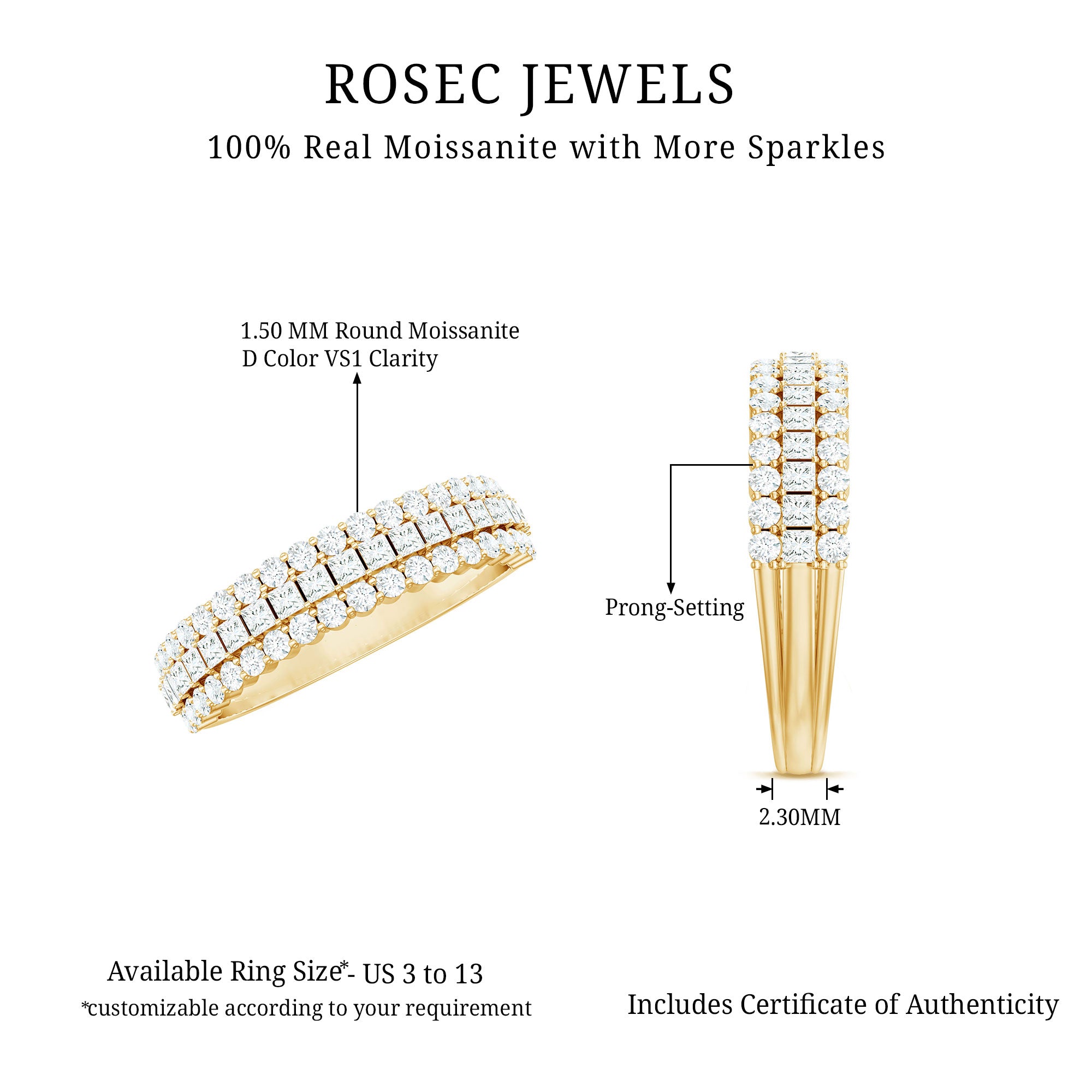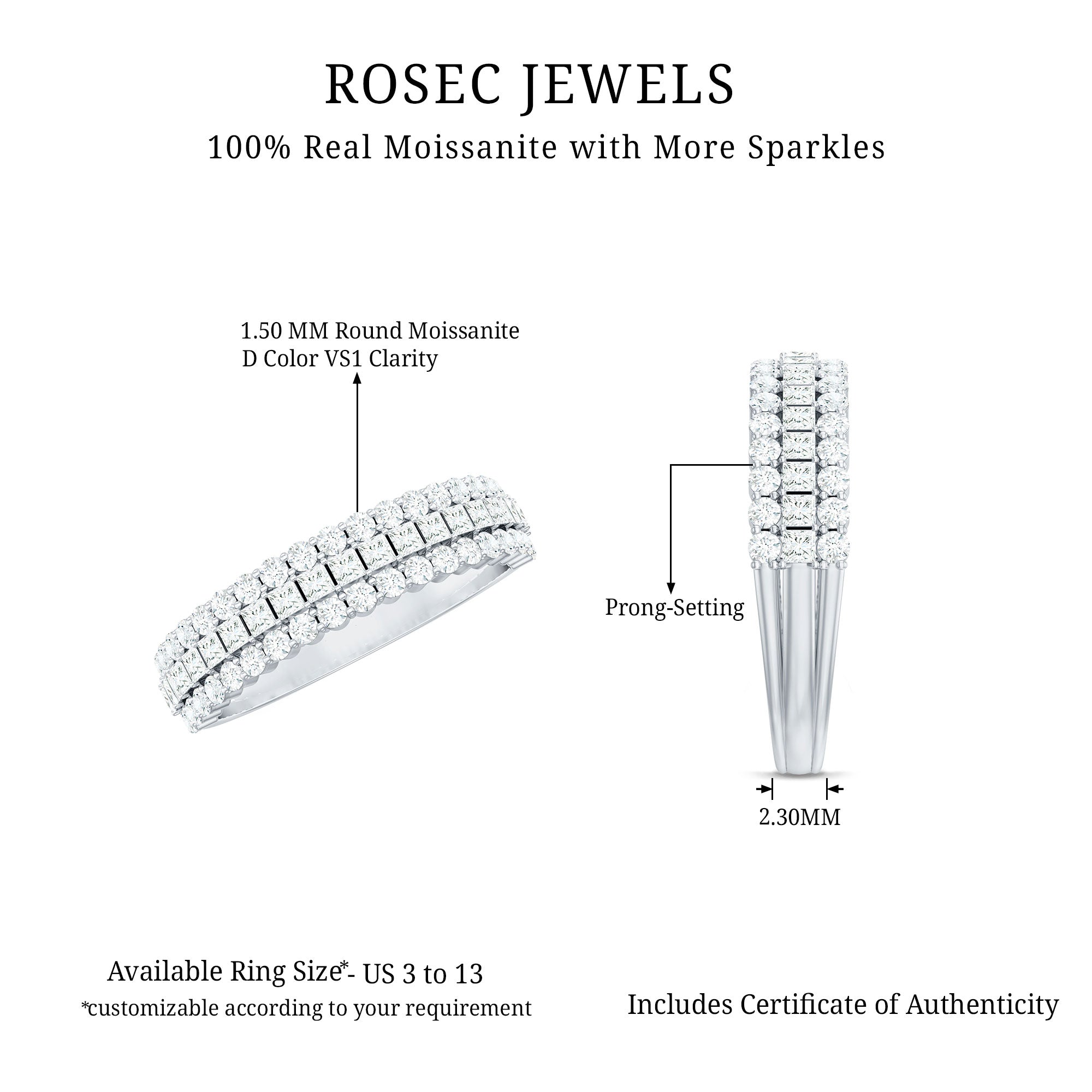 Embrace timeless elegance with our Classic Wedding Band Ring, featuring three rows of brilliant Moissanite stones. The middle row dazzles with princess-cut Moissanite gems, while the upper and lower rows shimmer with round Moissanite stones, each securely set in a prong setting. This ring is a perfect symbol of your enduring love and commitment, radiating sophistication and brilliance on your special day.