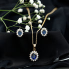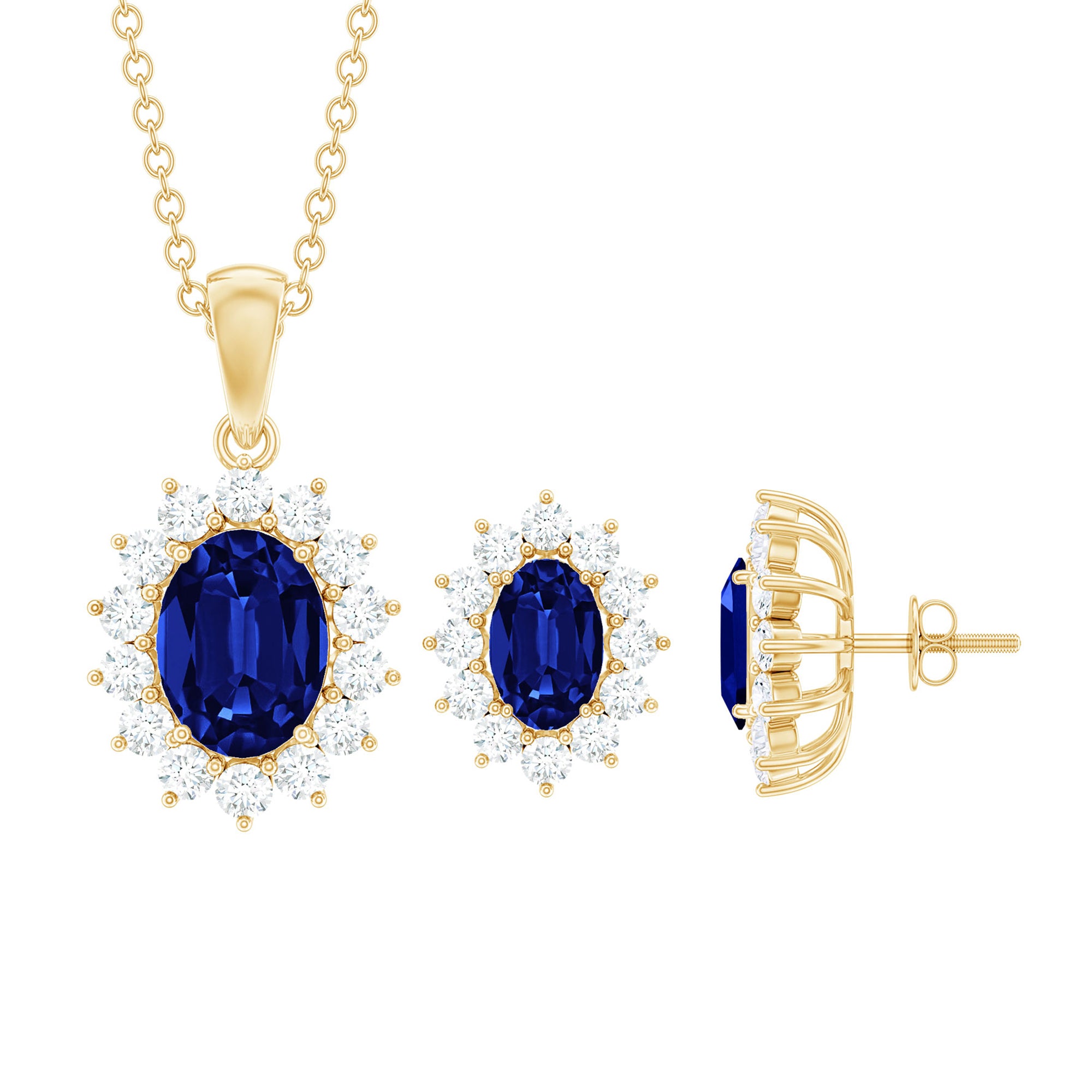 Crafted in solid gold, this Halo Pendant and Earring Set features an oval-cut lab-created blue sapphire, surrounded by a halo of moissanite, making it a timeless and elegant piece of jewelry that will make you stand out. Its classic design and high-quality materials ensure that this created blue sapphire jewelry set is a statement piece that you can cherish for years to come.