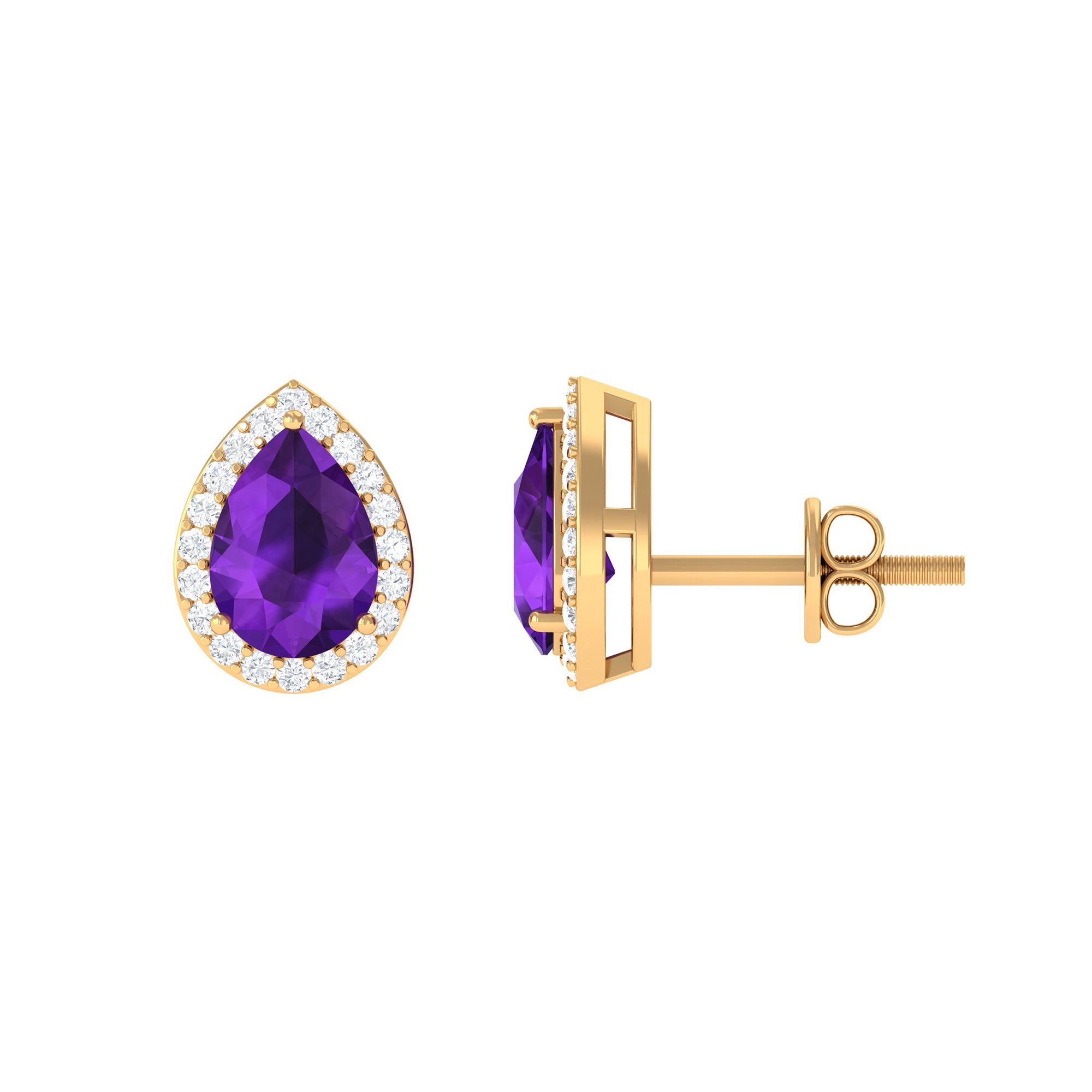 Add more charm and elegance to every moment with these Amethyst Stud Earrings, a radiant blend of sophistication and romance. Each earring showcases a vivid 6X8 mm Pear Shape Amethyst set in 3 Prong Setting, its deep purple hue exuding passion, creativity and timeless allure. Encircling the gemstone, a Halo of sparkling Diamond stones enhances its brilliance, creating a dazzling frame that catches light from every angle. Secured with Screw Back Closure, these Pear Shaped Stud Earrings promise both comfort and confidence, allowing you to shine effortlessly all day long. Beautifully packaged in a signature jewelry box, they make a thoughtful gift for birthdays, anniversaries or moments when words are not enough to express love and admiration. Sophisticated yet versatile, these Amethyst Diamond Earrings are a statement of grace, a whisper of romance and a celebration of beauty in every detail. Let these Halo Stud Earrings with Amethyst become your signature sparkle, turning heads and hearts wherever you go.