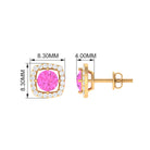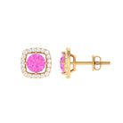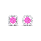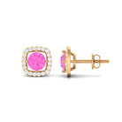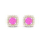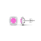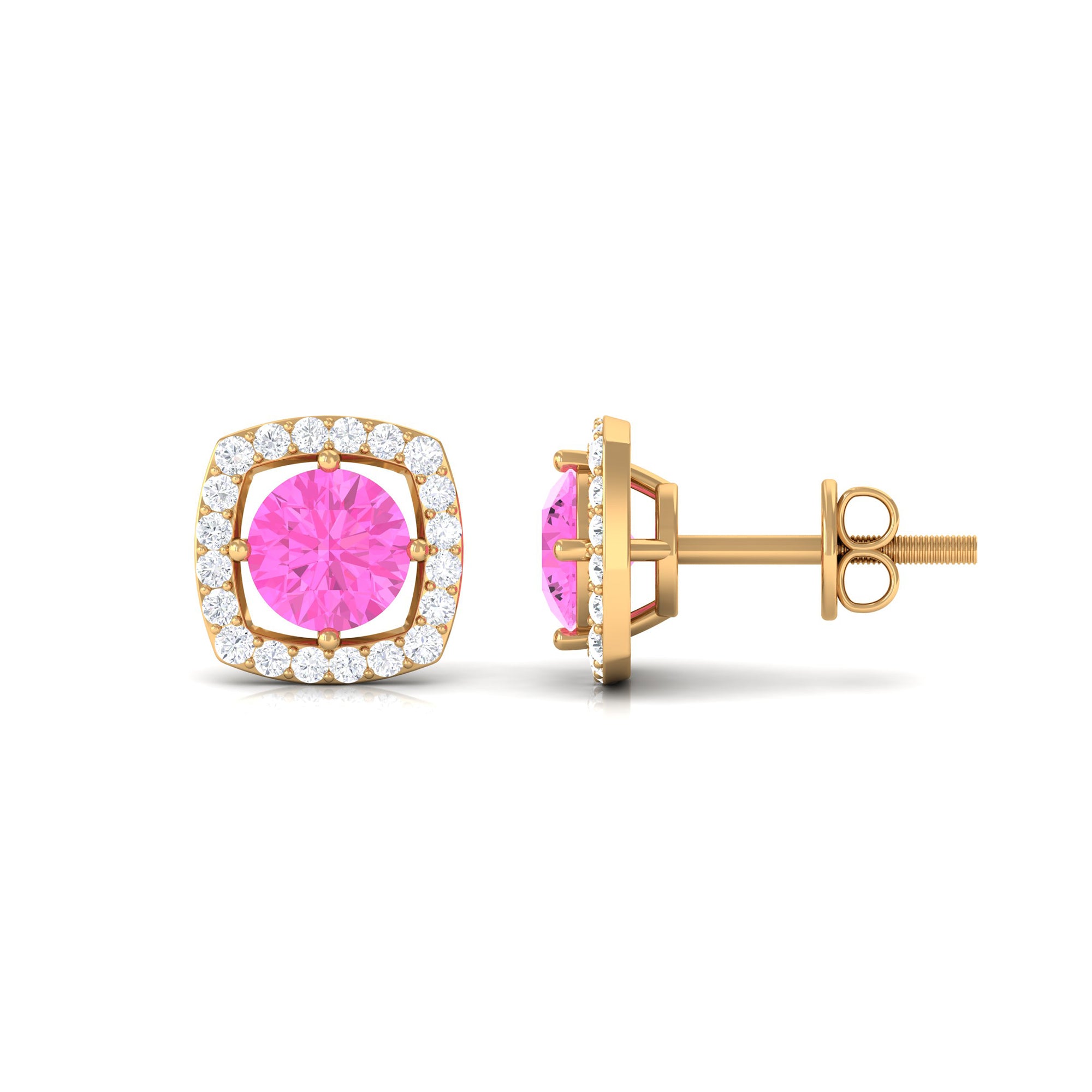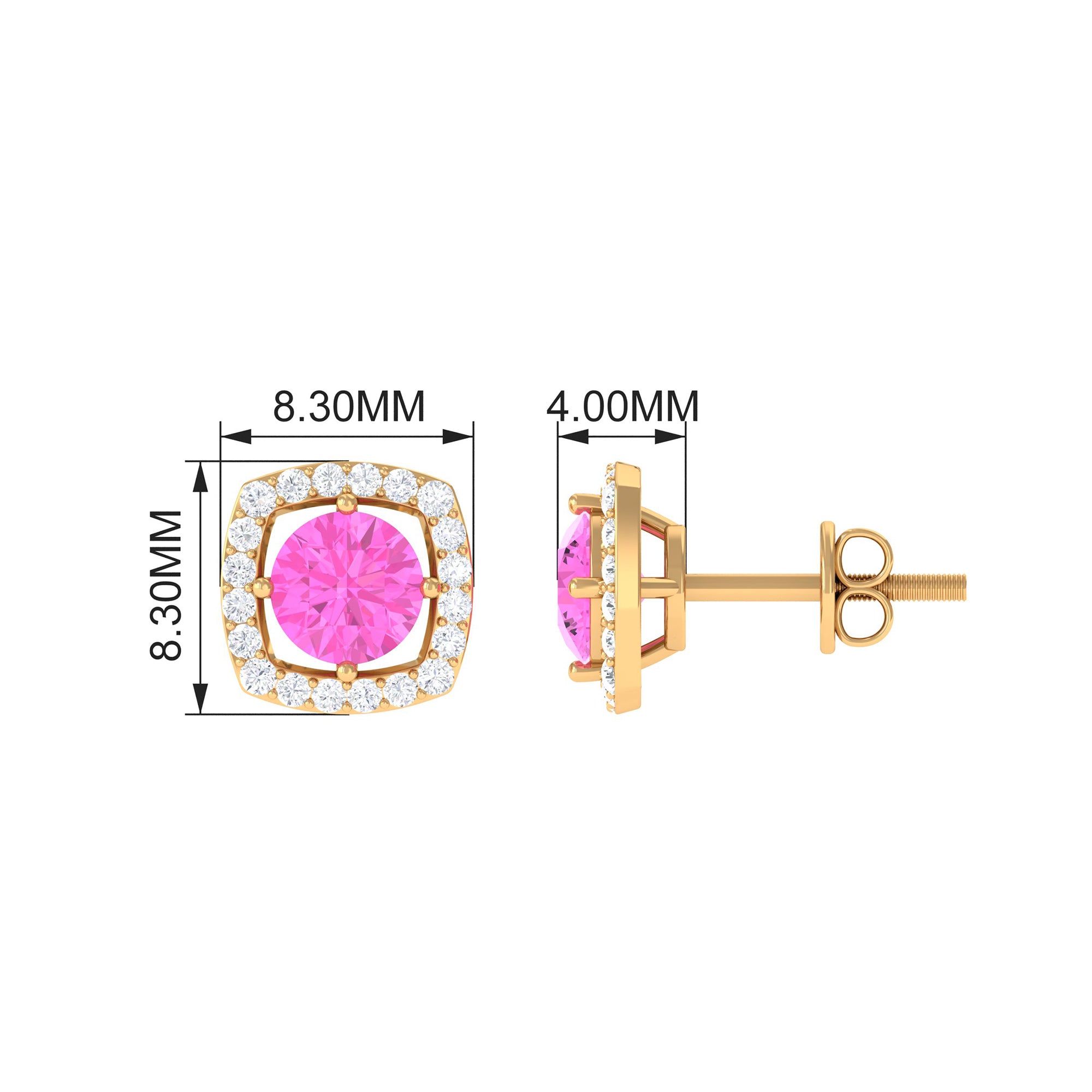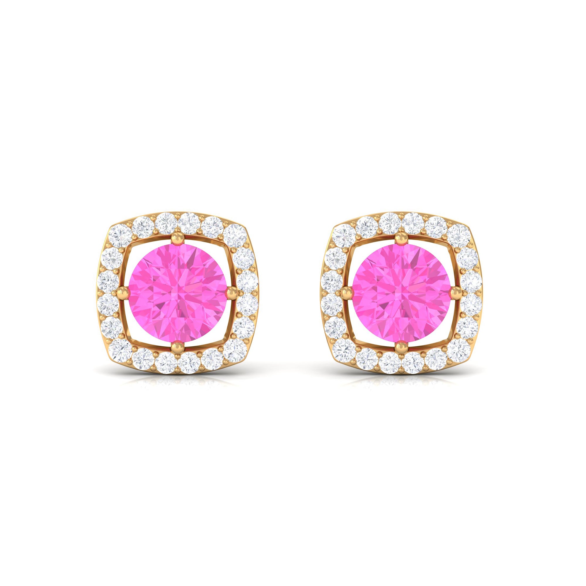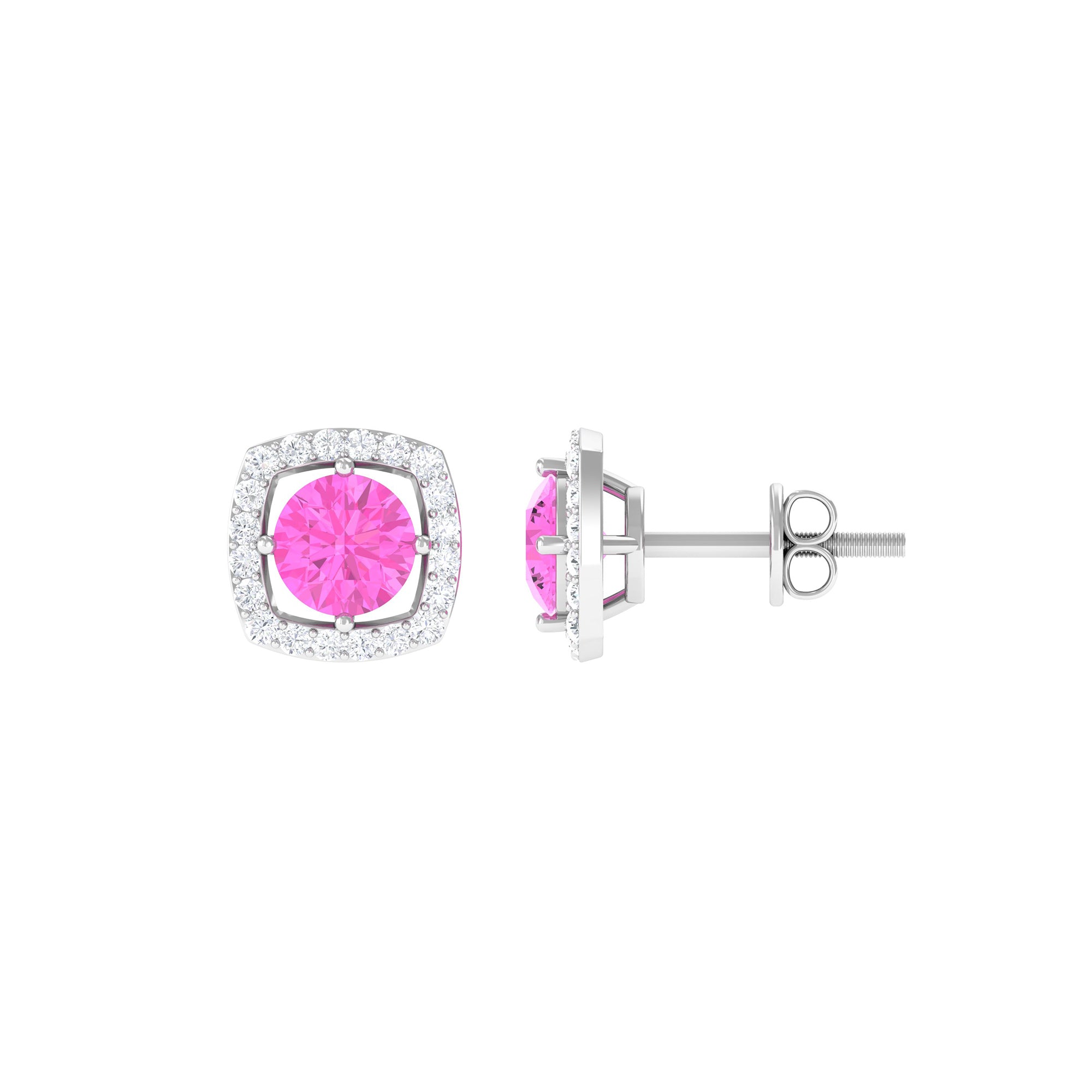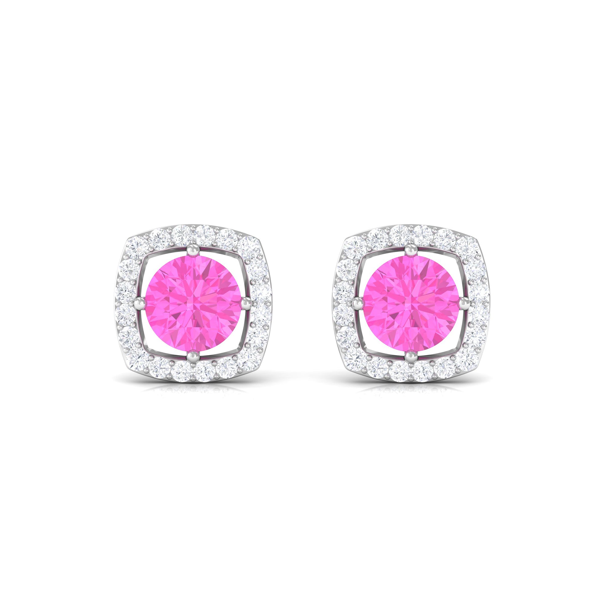 Enhance your elegance with this pair of Stud Earrings. Gracing these earrings is a Round Shape Pink Sapphire, encircled by a halo of Round Diamond stones in a secure Prong Setting. These Halo Stud Earrings are crafted in customizable metal options.