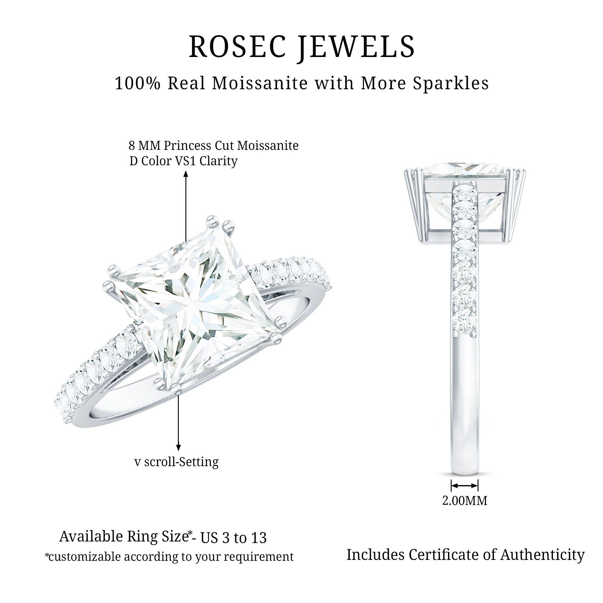 Celebrate the one of a kind love that you two share with a Moissanite Solitaire Ring. Weighing a whopping 3 CT, it highlights the Center Stone of 8 MM Princess Cut Moissanite that is held tightly by Peg head Setting. Lending this Moissanite Engagement Ring more character are the side-stones of Round Cut Moissanite in Double Prong Setting. Grab this Square Engagement Ring which is a perfect blend of timeless and elegant style. Your lady will be astonished by the remarkable shine of D-VS1 quality Moissanites embedded in the ring. Mark the special day memorable forever with this Princess Cut Engagement Ring precisely crafted by Rosec Jewels.