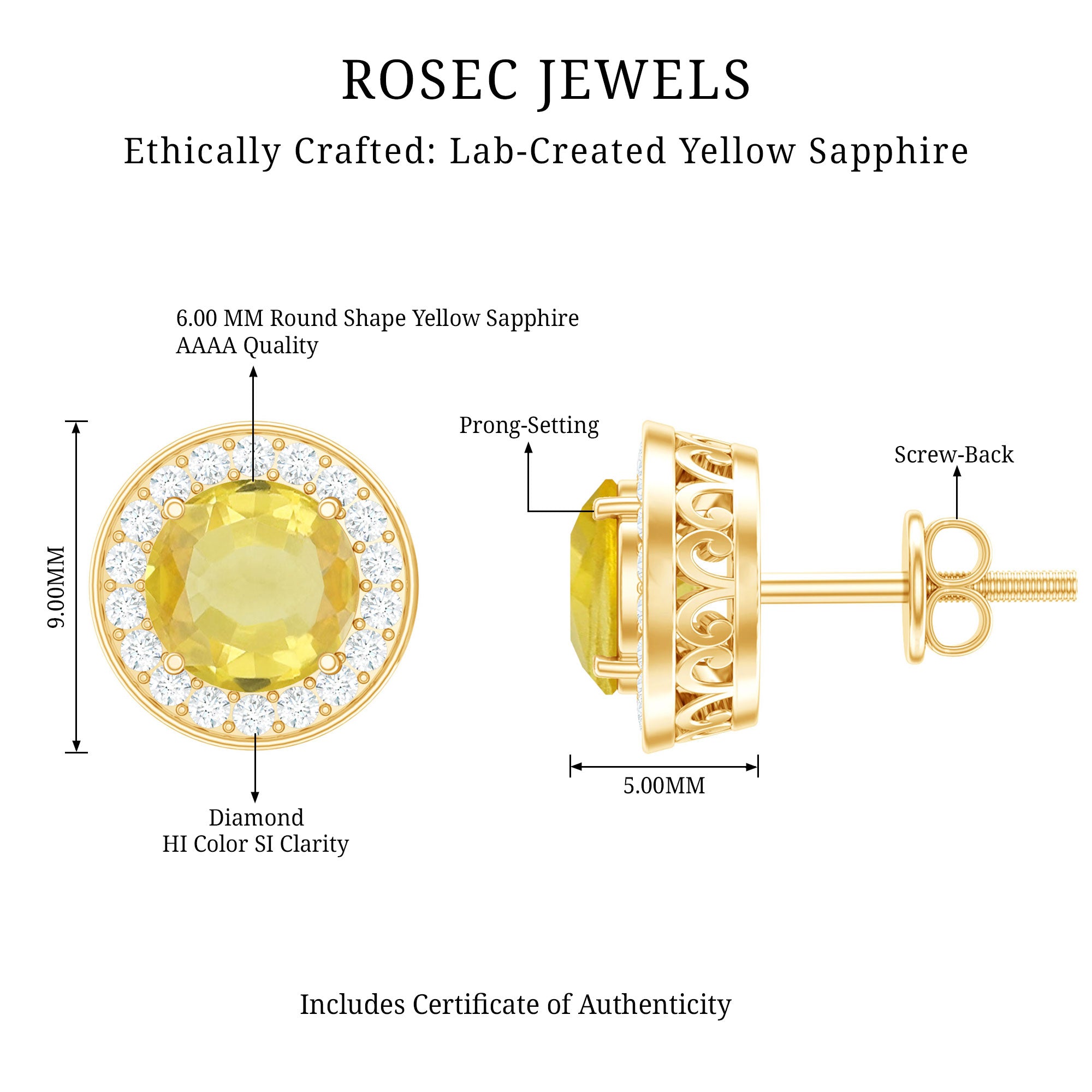 These classic Halo Stud Earrings embellished with Round Shape Created Yellow Sapphire Gemstone are set at the center in a Prong Setting encircled with Round Shape Diamond.