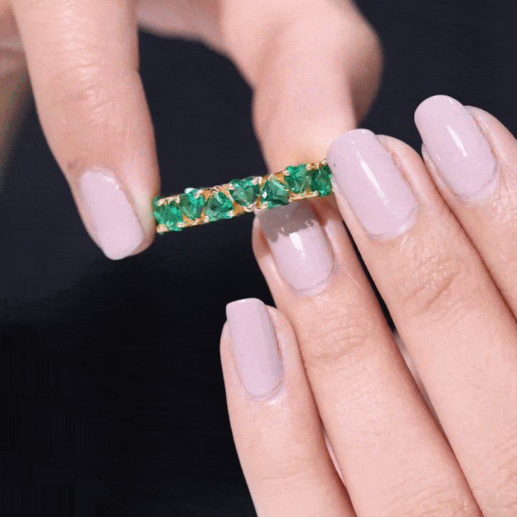 Emerald hearts come together in a seamless circle, creating a band that glows with meaning and timeless charm. This Heart Eternity Ring features vibrant lab created emeralds, each expertly shaped into a delicate heart and set securely in claw setting. The stones are arranged in an alternating pattern, giving the Emerald Wedding Band a graceful rhythm that catches the light from every angle. Designed as a full eternity ring, it forms an unbroken loop of color and brilliance. The rich green of emerald is often connected with renewal, growth, and deep love, making this piece especially meaningful for anniversaries, weddings, promise rings, or personal milestones. Handcrafted with care, the Emerald Anniversary Band is made to feel smooth and comfortable on the finger, allowing everyday wear without compromising elegance. The durable lab created emeralds bring beauty, strength, and ethical craftsmanship together in one design. Whether worn alone for a standout moment or stacked with other rings for a layered style, this Emerald Eternity Band is a heartfelt symbol meant to be cherished.