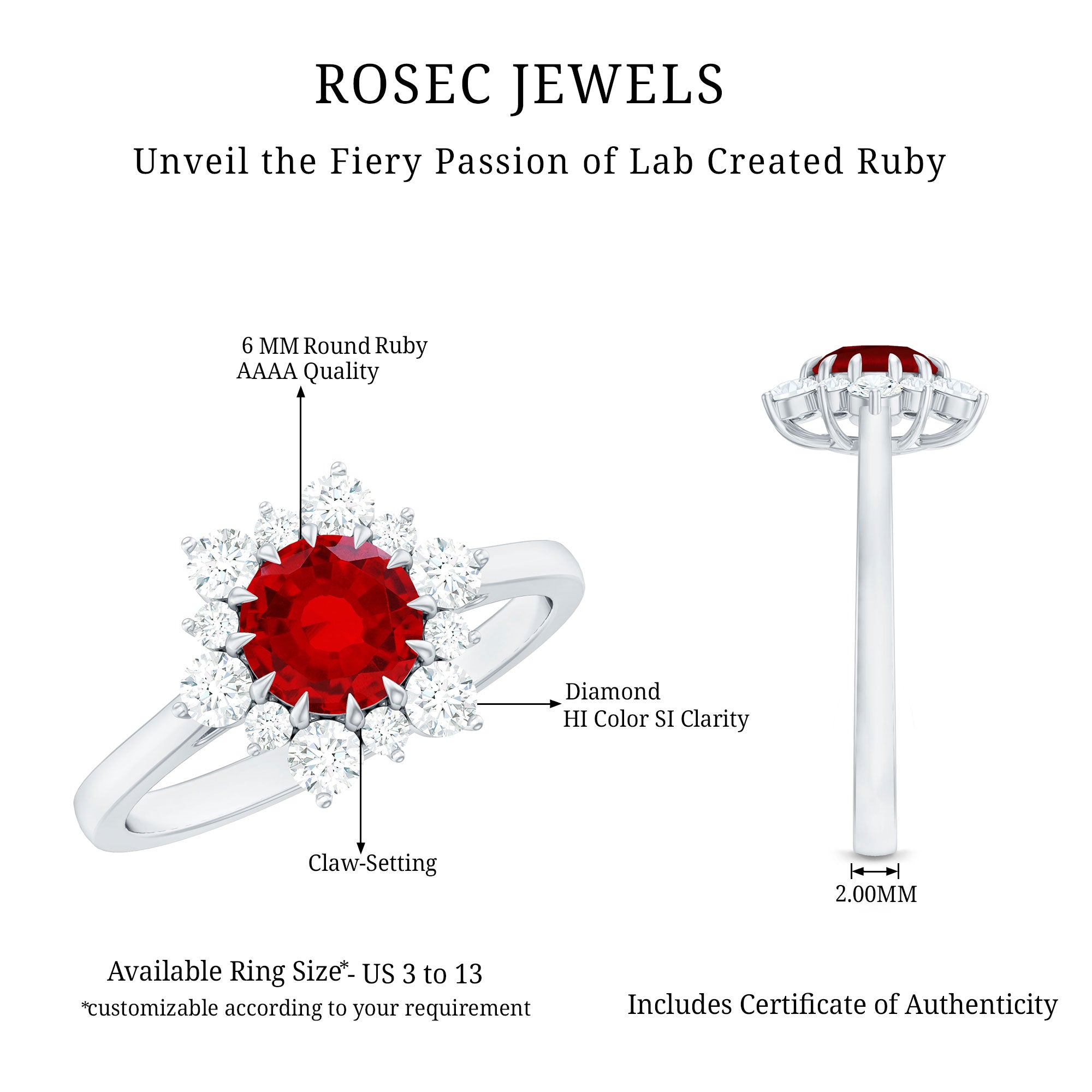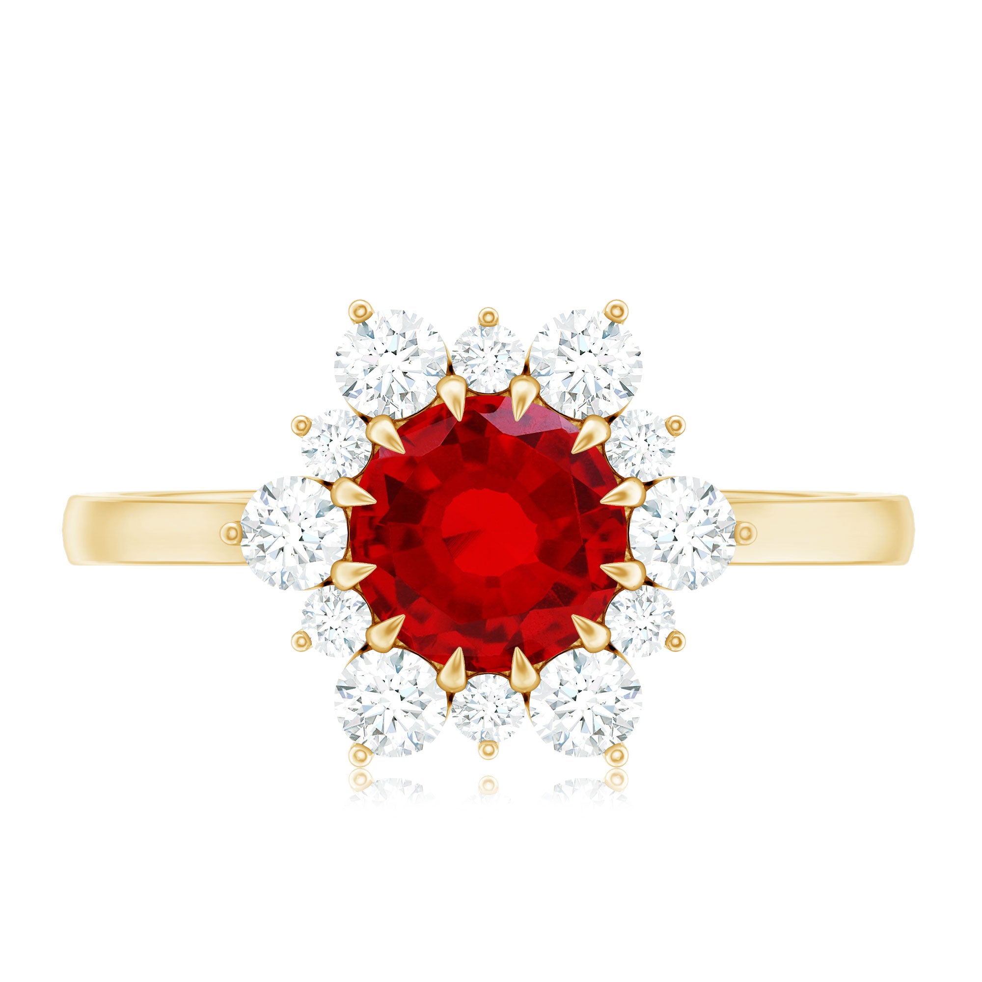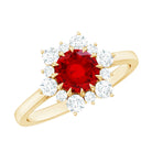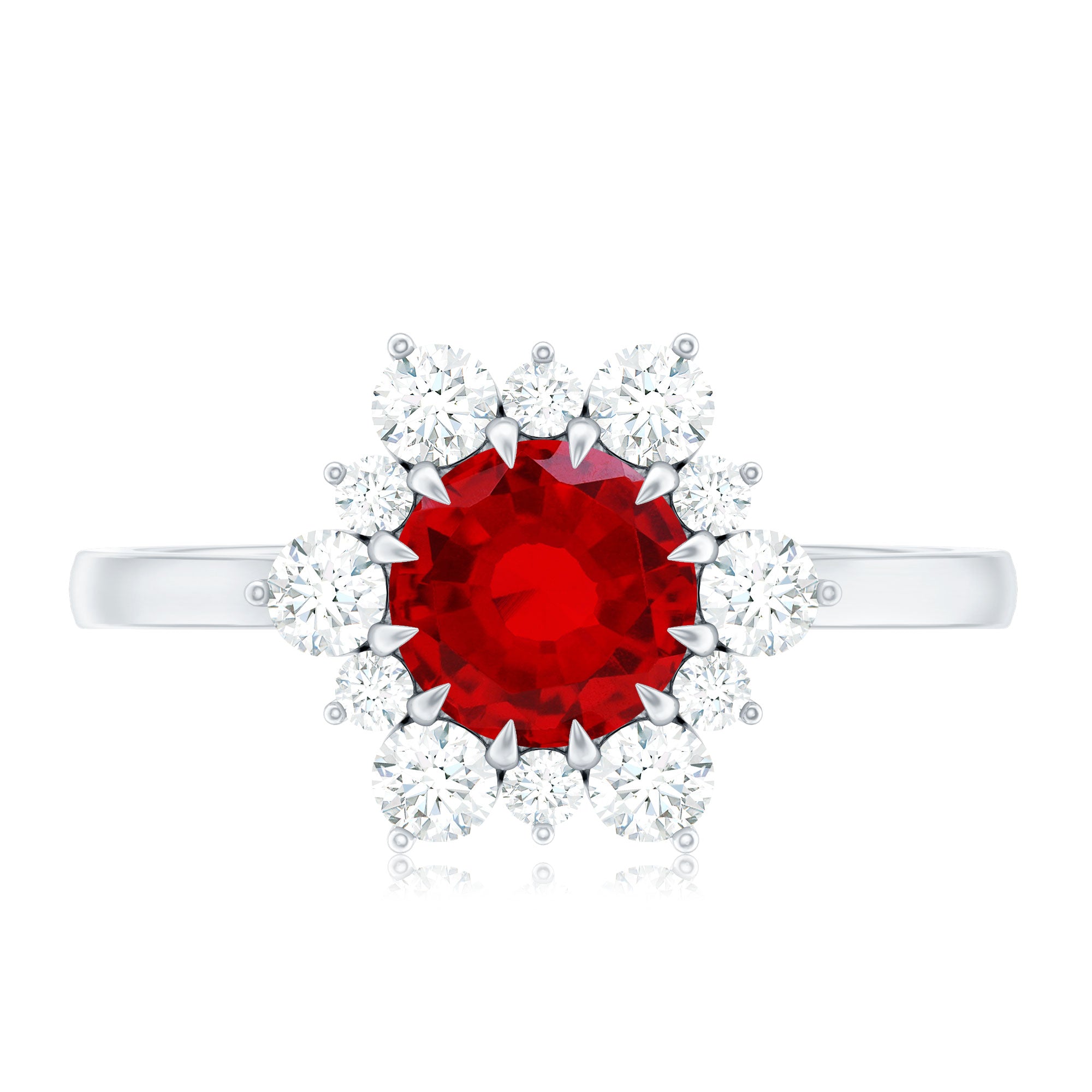 Make a bold statement with our lab created Ruby and Diamond Engagement Ring that blends classic beauty and a little sparkle magic. At the center of this elegant Halo Engagement Ring sits an 8 MM round cut lab created ruby, held securely in claw setting. Surrounding the ruby is a dazzling halo made up of alternating small and large diamonds, arranged to create a sunburst effect that catches the light from every angle. The mix of the AAAA quality ruby and the sparkling HI-SI quality diamonds gives the Classic Engagement Ring a timeless yet eye-catching look that is perfect for someone who loves simple elegance with a touch of wow. Whether it is for a proposal, anniversary, or just a meaningful gift, this Lab Grown Ruby Ring shows love in a way that is both stylish and thoughtful. With its classic design and beautiful details, this Red Ruby Engagement Ring is a great pick for anyone who wants a piece that feels special. It is made to be worn every day or saved for those important moments, a symbol of affection that never goes out of style.