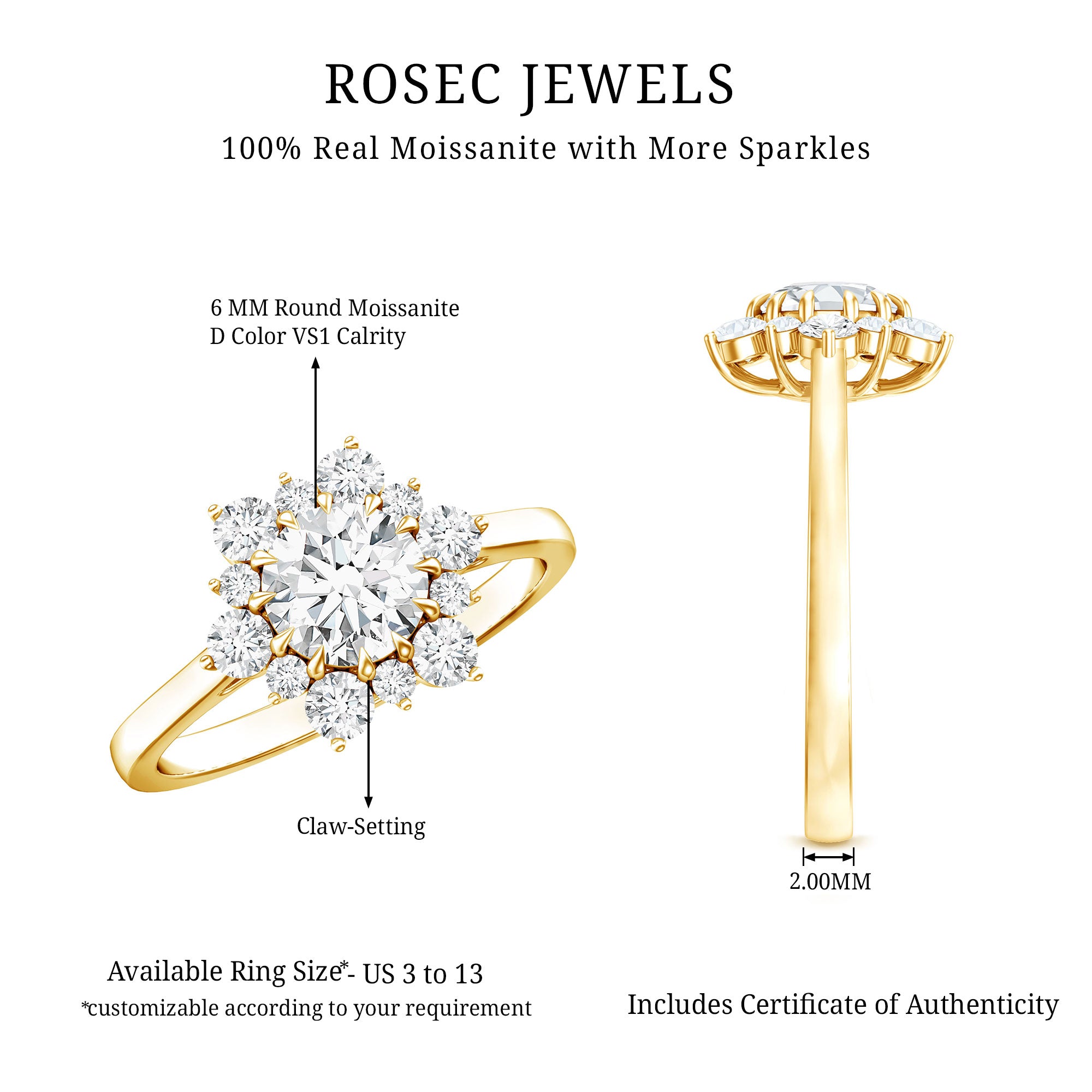 Begin your forever with the breathtaking Moissanite Halo Engagement Ring, a stunning piece crafted to honor your love in its most genuine form. At the heart of this timeless design lies a 6 MM round cut moissanite, securely nestled in claw setting and encircled by a radiant halo of smaller moissanite stones. This halo not only amplifies the center stones sparkle and brilliance but also adds an extra layer of elegance, making this Round Engagement Ring a remarkable emblem of commitment. Tailored for those who value elegance with intention, this Moissanite Engagement Ring beautifully combines the charm of classic design with the brilliance of sustainable gemstones. The sleek band allows the halo and center stone to dazzle, while ensuring a comfortable fit for everyday wear. Whether you are planning a heartfelt proposal or looking to enhance a cherished piece, this Halo Ring conveys a powerful message, elegant, radiant, and responsibly crafted. Delivered in a luxurious jewelry box, it’s prepared to make the moment unforgettable. Let this 1 Carat Moissanite Ring symbolize the promise you hold every day.