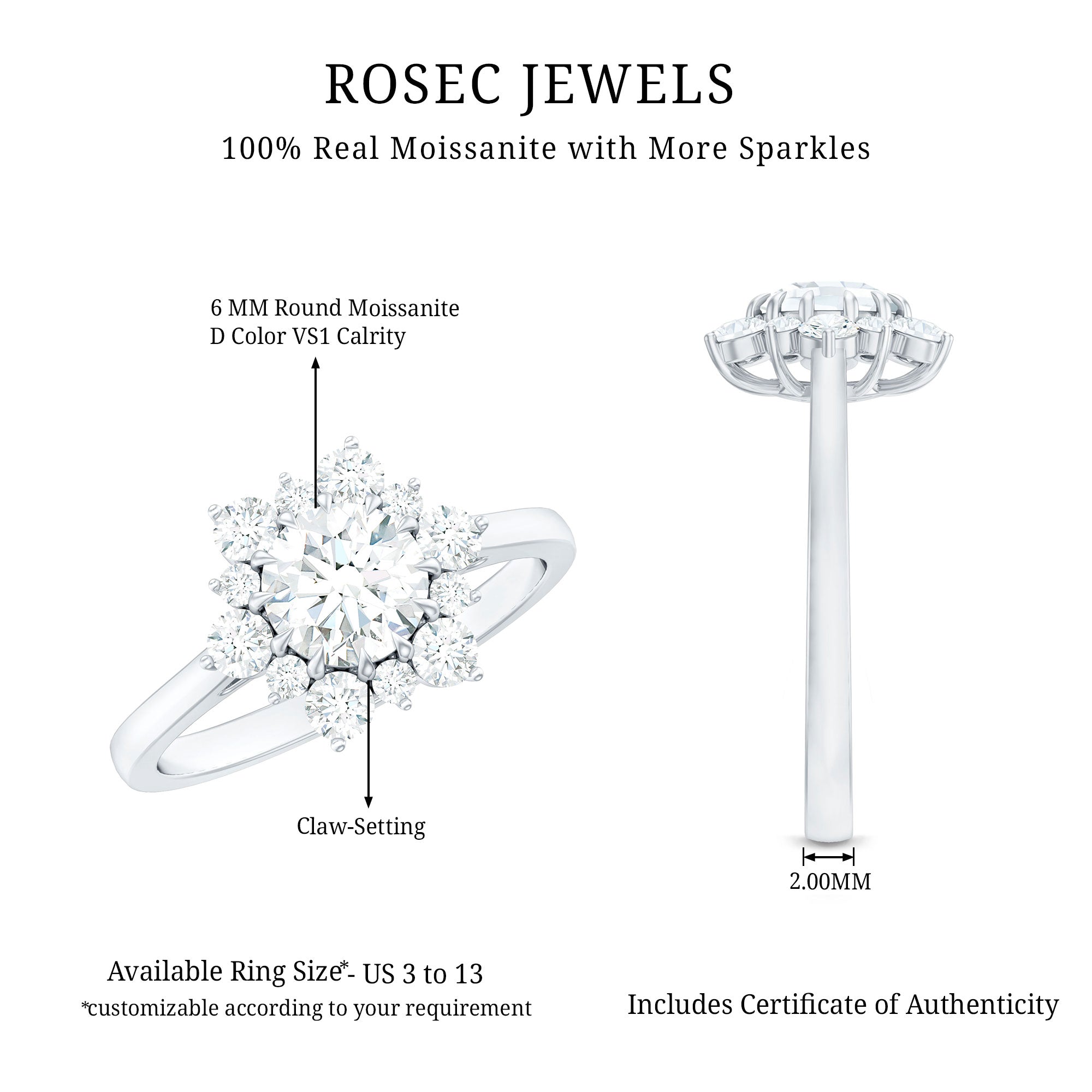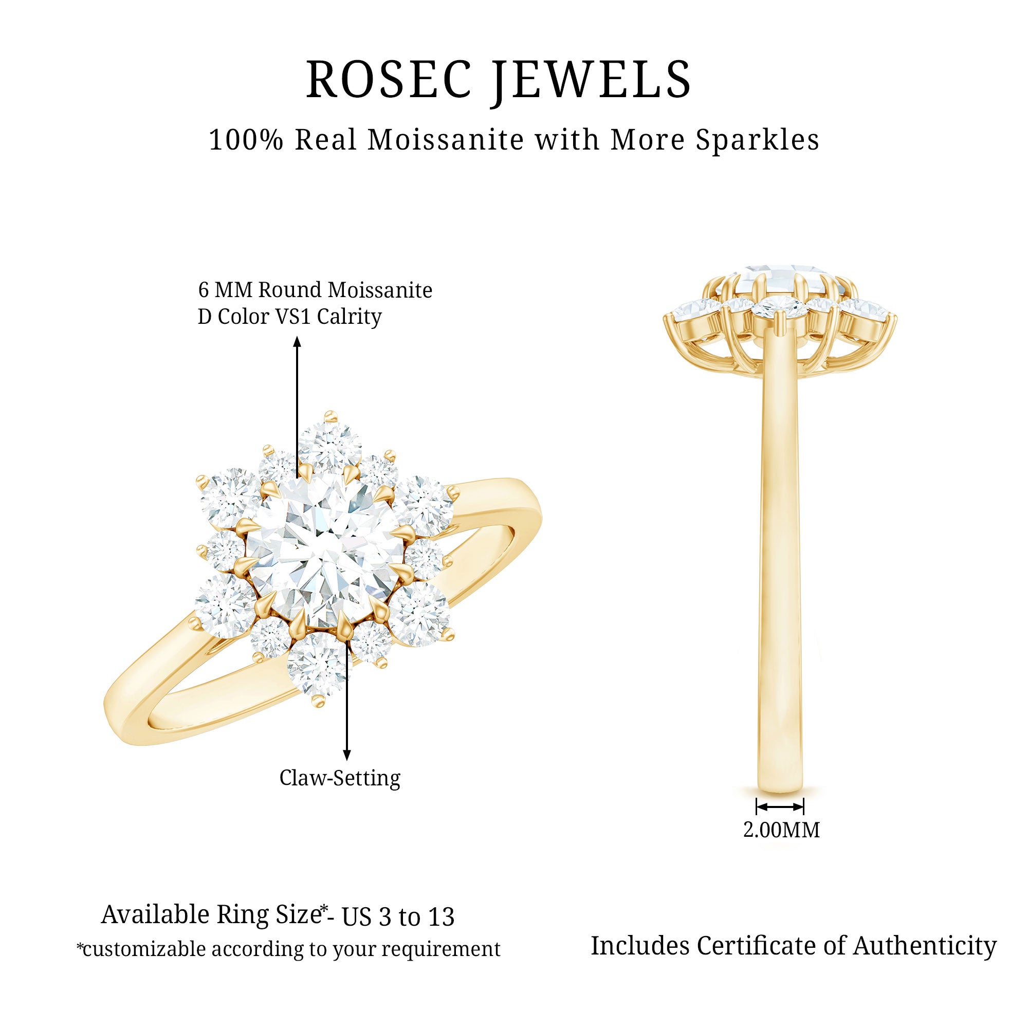 Begin your forever with the breathtaking Moissanite Halo Engagement Ring, a stunning piece crafted to honor your love in its most genuine form. At the heart of this timeless design lies a 6 MM round cut moissanite, securely nestled in claw setting and encircled by a radiant halo of smaller moissanite stones. This halo not only amplifies the center stones sparkle and brilliance but also adds an extra layer of elegance, making this Round Engagement Ring a remarkable emblem of commitment. Tailored for those who value elegance with intention, this Moissanite Engagement Ring beautifully combines the charm of classic design with the brilliance of sustainable gemstones. The sleek band allows the halo and center stone to dazzle, while ensuring a comfortable fit for everyday wear. Whether you are planning a heartfelt proposal or looking to enhance a cherished piece, this Halo Ring conveys a powerful message, elegant, radiant, and responsibly crafted. Delivered in a luxurious jewelry box, it’s prepared to make the moment unforgettable. Let this 1 Carat Moissanite Ring symbolize the promise you hold every day.