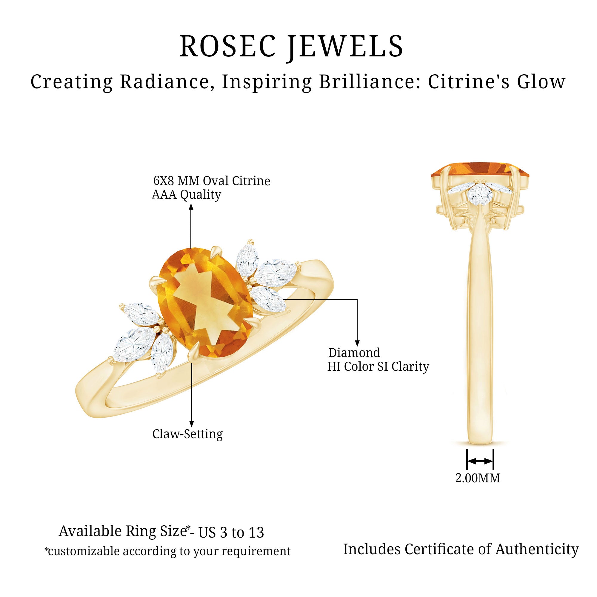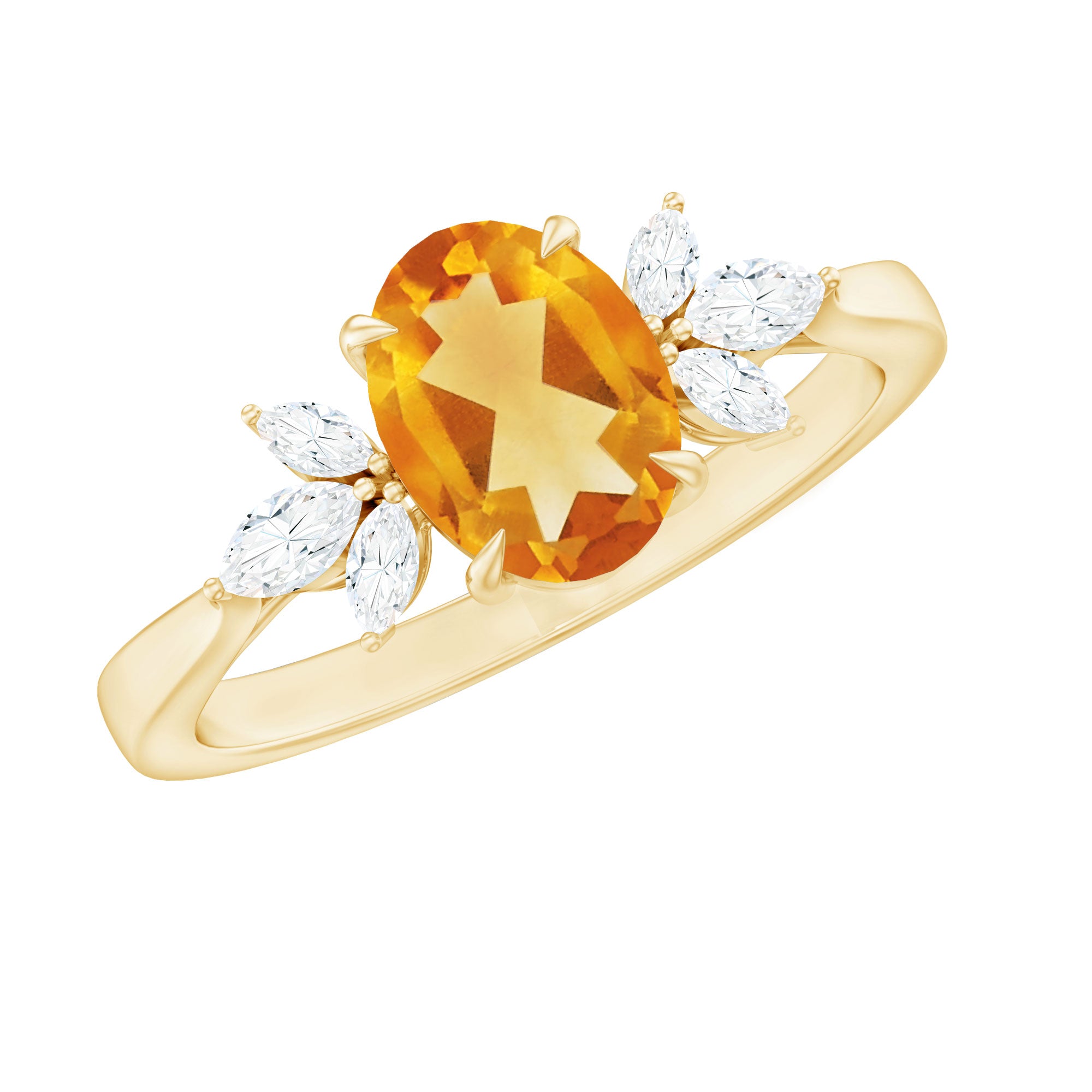 Held in a claw setting is a center oval citrine in this minimal solitaire ring that makes a great choice for anyone who has a taste for classics. It is set with a trio of marquise Diamond. The oval citrine ring gives a modern feel and has an unmatched aura. It is completed by a luminous and plain shank to keep things on the simpler and classy side.