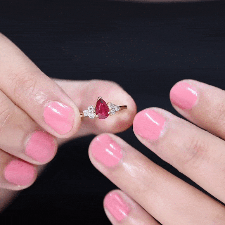 Claw Set Pear Cut Ruby Engagement Ring with Diamond Trio