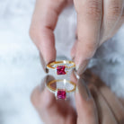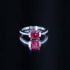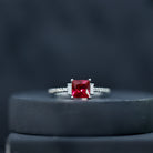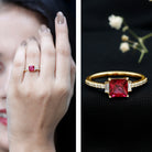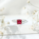 Add a little sparkle to her ensemble with our Ruby Engagement Ring, timeless jewelry for your special day. Embellished with a princess-cut created ruby claw set in the center and the diamond-lined shank captures attention. Embrace her wedding look with this created ruby ring, a perfect combination of elegance and sophistication. Impress her with the mesmerizing red allure of this ruby ring and leave a lasting impression on her heart.