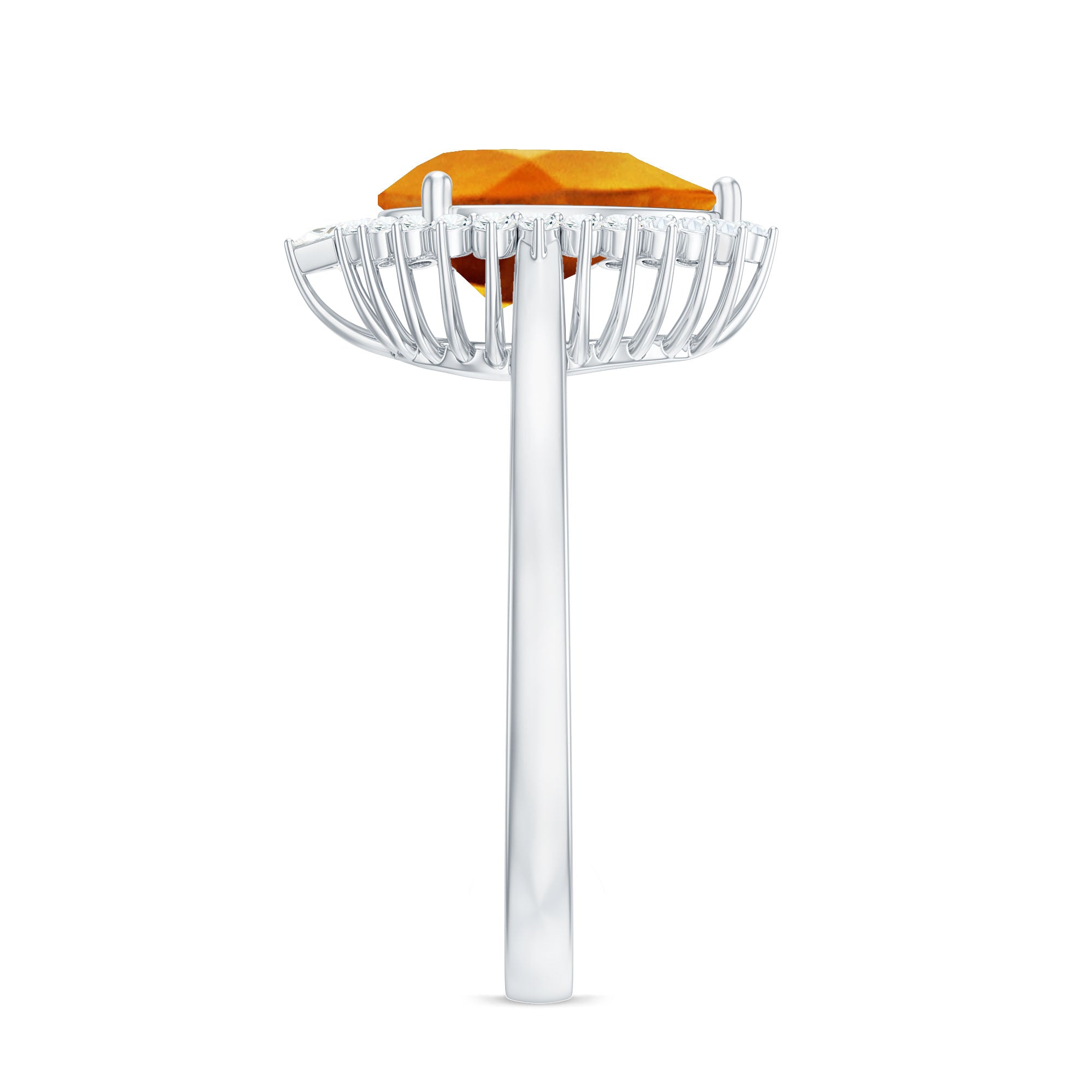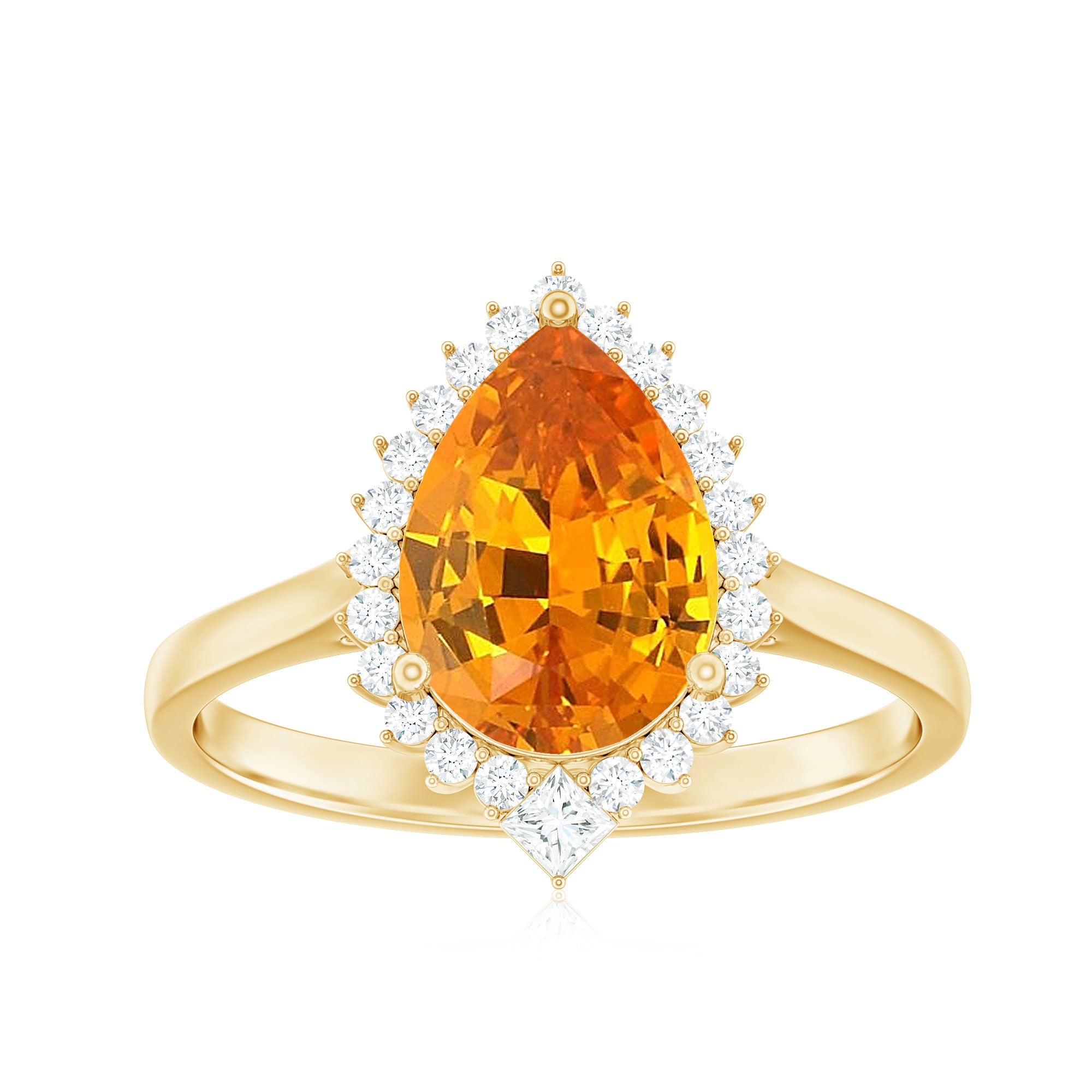 Exuding a glistening allure, the Cocktail Halo Engagement Ring is an eloquent expression of emotions, making it the perfect token of love for your beloved. The Pear Cut Created Orange Sapphire, embraced by a dazzling Diamond Halo, symbolizes your everlasting love and commitment, creating a meaningful and enchanting piece that celebrates your special bond.