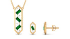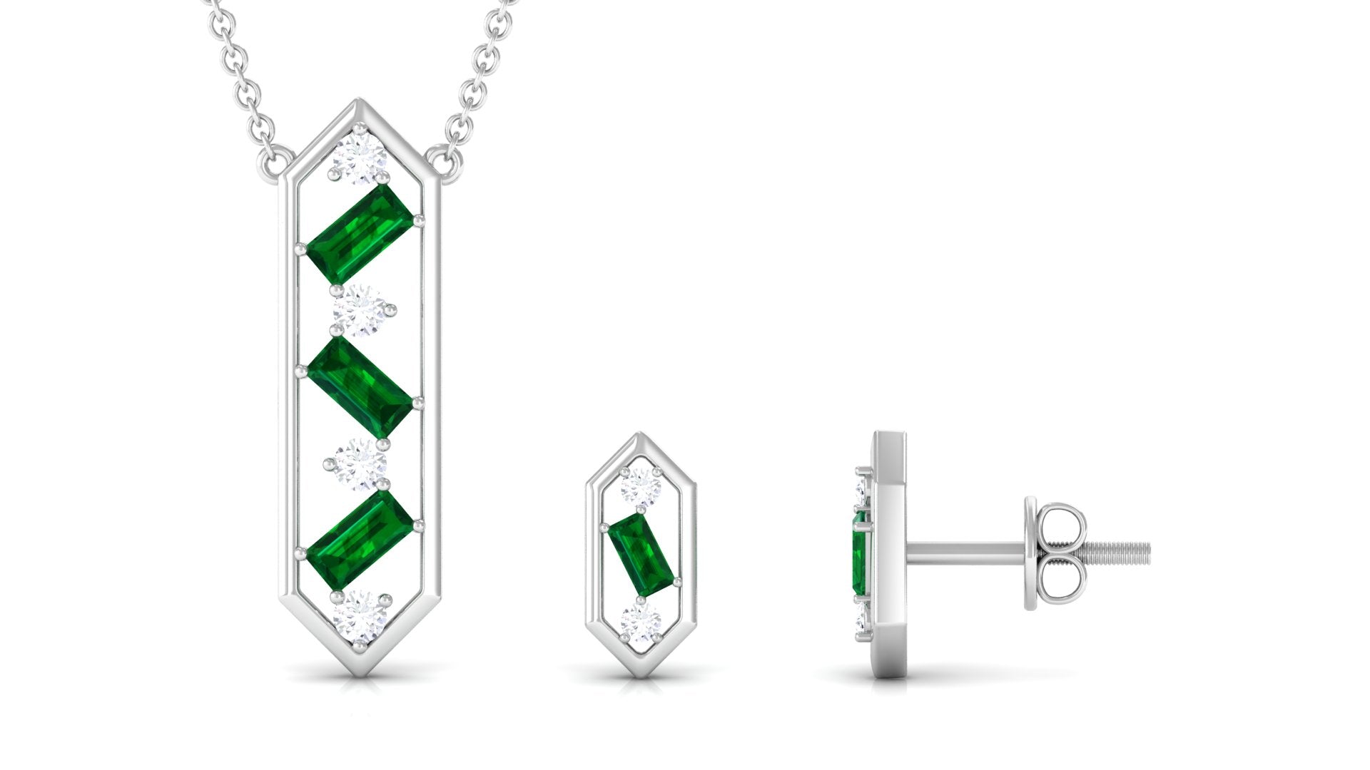 Make a stylish statement with this Contemporary jewelry Set. Featuring stunning baguette-cut created emerald stones paired with round Diamond stones, this necklace earring set offers a modern take on classic jewelry styles. The dangling design adds movement and elegance to the pieces, making them the most suitable choice for any special occasion. Add this Created Emerald and Diamond jewelry set to your jewelry collection for sophistication and luxury.