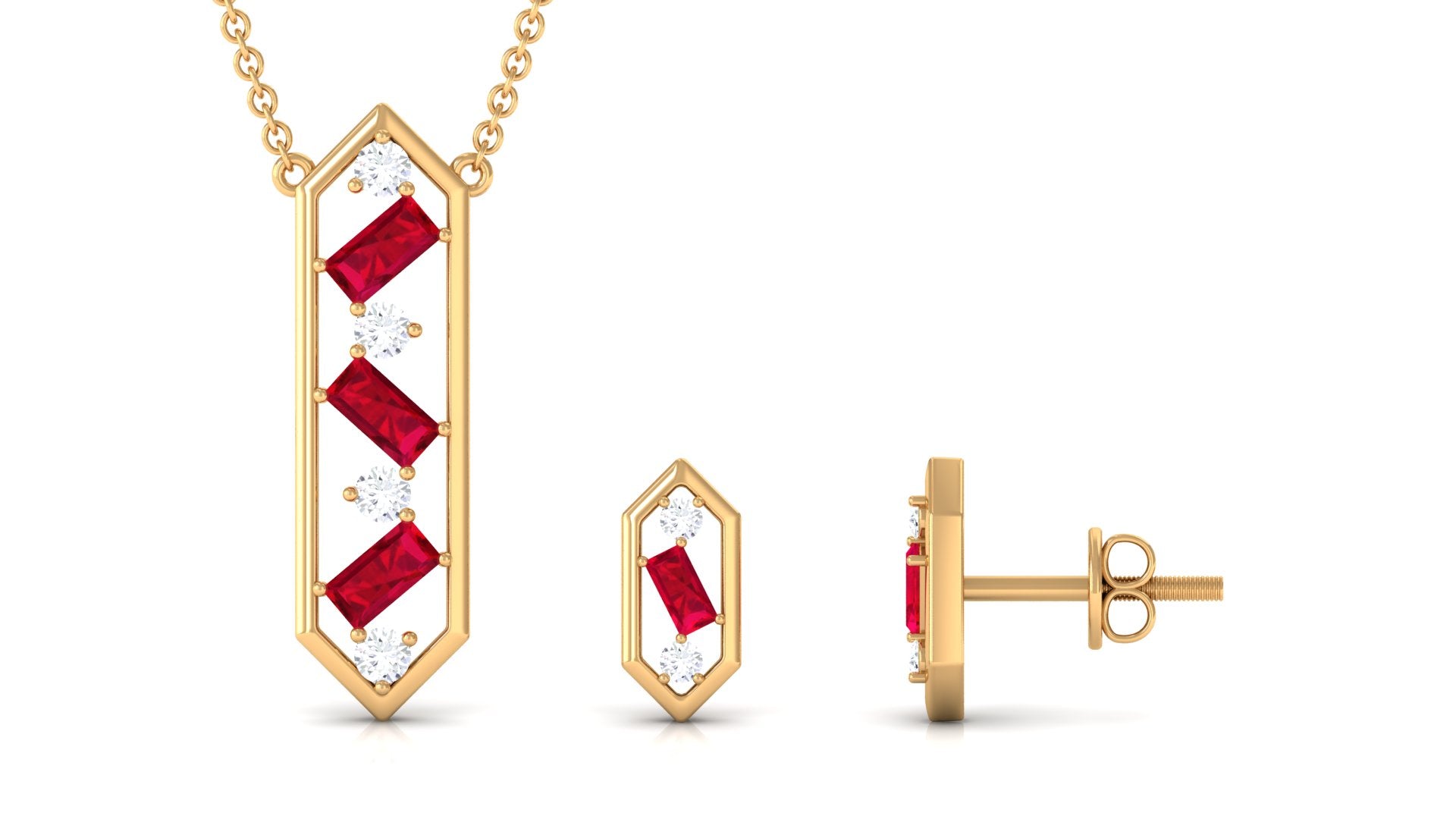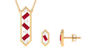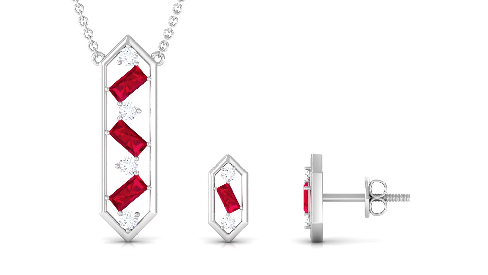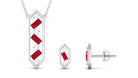 Make a stylish statement with this Contemporary Jewelry Set, featuring baguette-cut created Ruby stones and round diamonds. The modern design with dangling elements adds elegance and movement to the pieces, perfect for any special occasion. Add this sophisticated Created Ruby and Diamond set to your collection for a touch of luxury and allure.