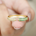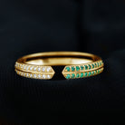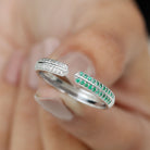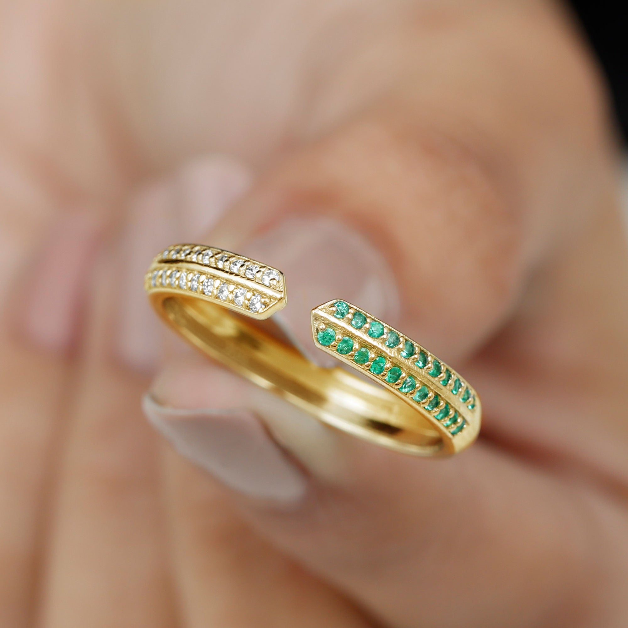 This Emerald Cuff Ring is a beautiful piece that celebrates individuality and modern style. Made with an open-ended design, it features two rows of sparkling round emeralds on one side and two rows of shining moissanite stones on the other. Each stone is carefully set in a secure pave setting, giving the Wrap Ring a bright and elegant look. At both ends of the cuff, arrow-shaped tips point toward each other, adding a bold and stylish touch that makes the design stand out. Perfect for any occasion, this Emerald and Moissanite Ring makes a meaningful gift for an anniversary, wedding, or special celebration. Its sleek design allows it to be worn alone for a simple and elegant look or stacked with other rings for a unique, layered style. The open design also makes it comfortable to wear and easy to adjust for the perfect fit. Crafted with care and attention to detail, this Open Wedding Band comes with a certificate of authenticity and is beautifully packed in a signature jewelry box, ready for gifting or safekeeping. You can also choose your preferred metal type and color to match your personal taste. Available in US sizes 3 to 13, this Emerald Ring Enhancer is a lovely blend of elegance, meaning, and style.