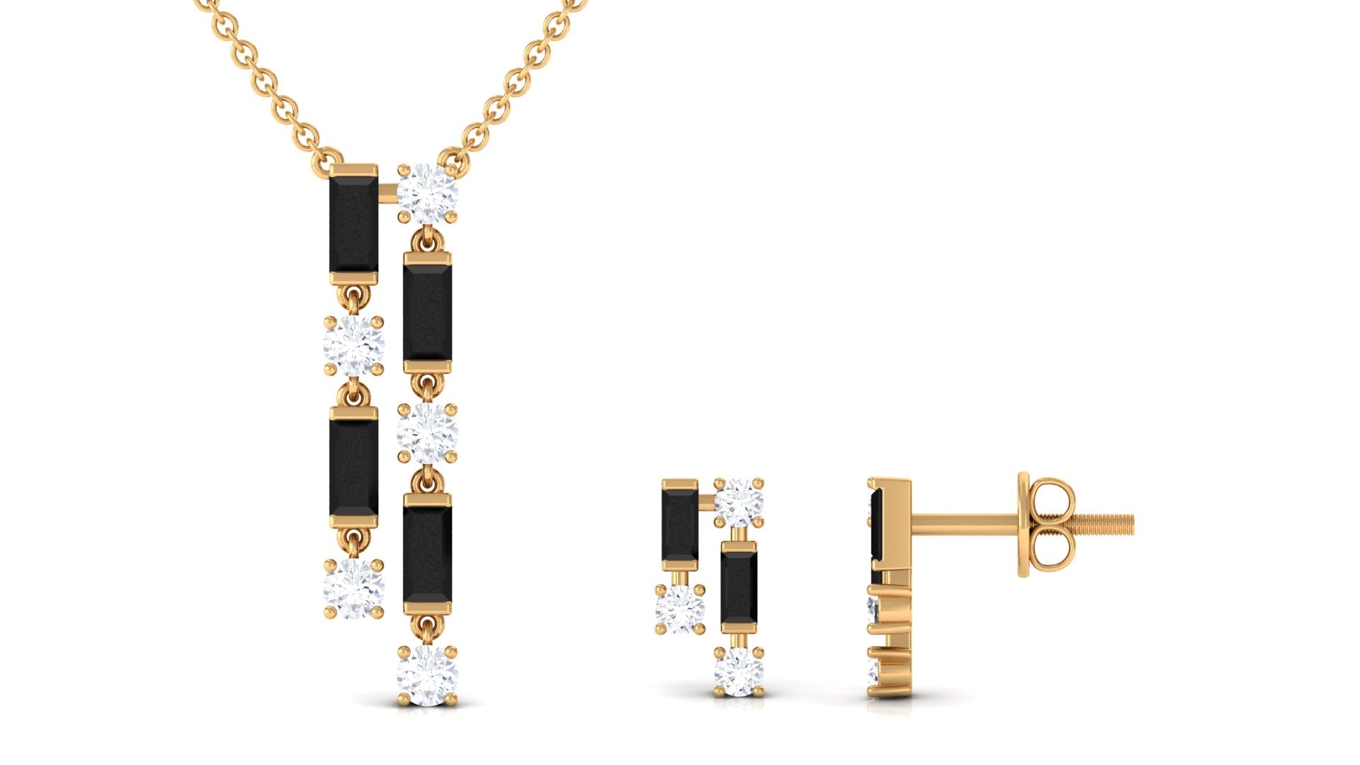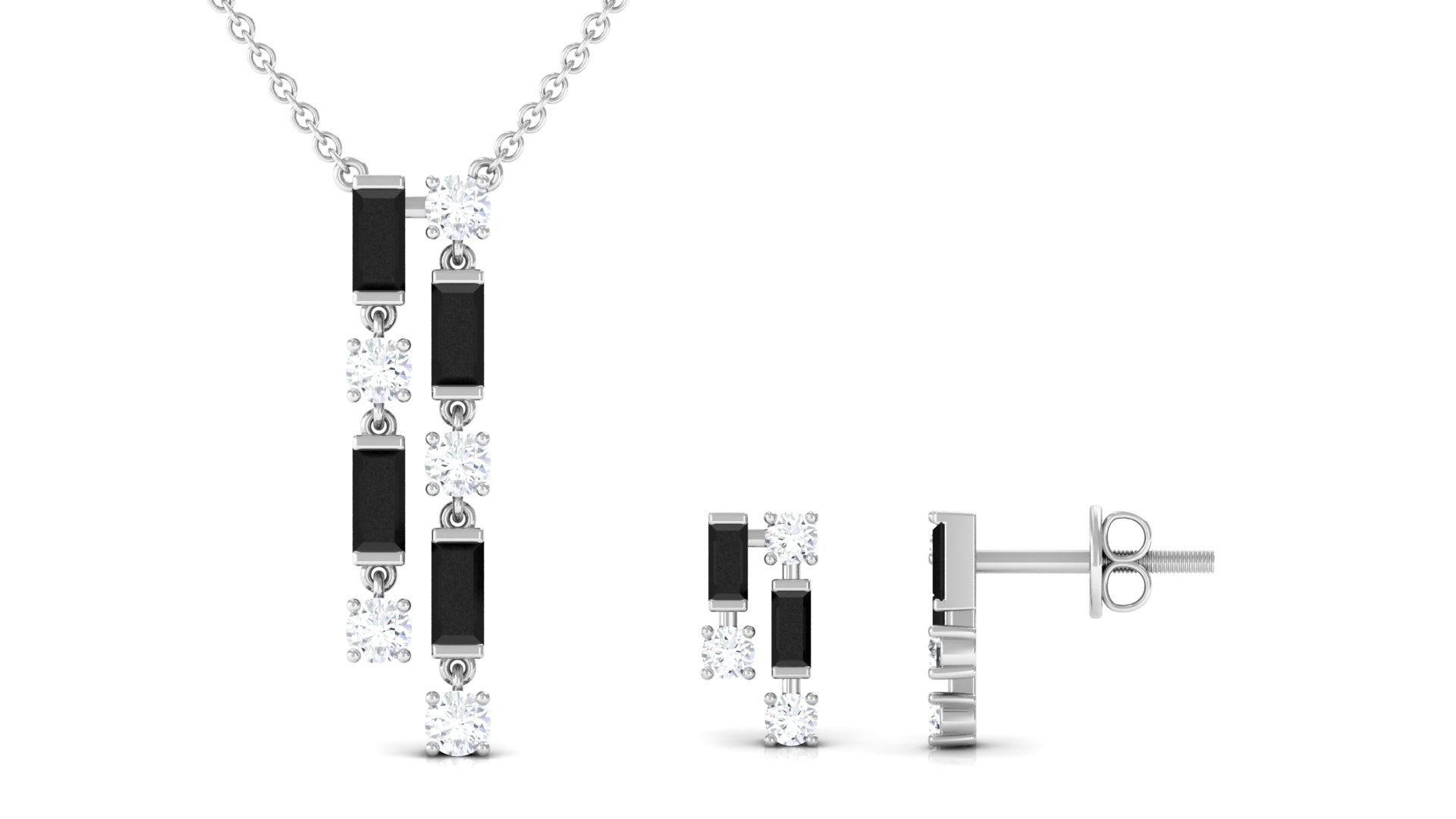 Make a statement with this beautiful Dangle Necklace and Earrings Set, featuring Baguette Cut Created Black Diamond in a bar setting and round Diamond stones. The intricate design and exquisite craftsmanship of this jewelry set create a stunning contrast, making it a standout piece of jewelry. This Created Black Diamond necklace set is perfect for adding a touch of luxury to any outfit or special occasion.