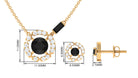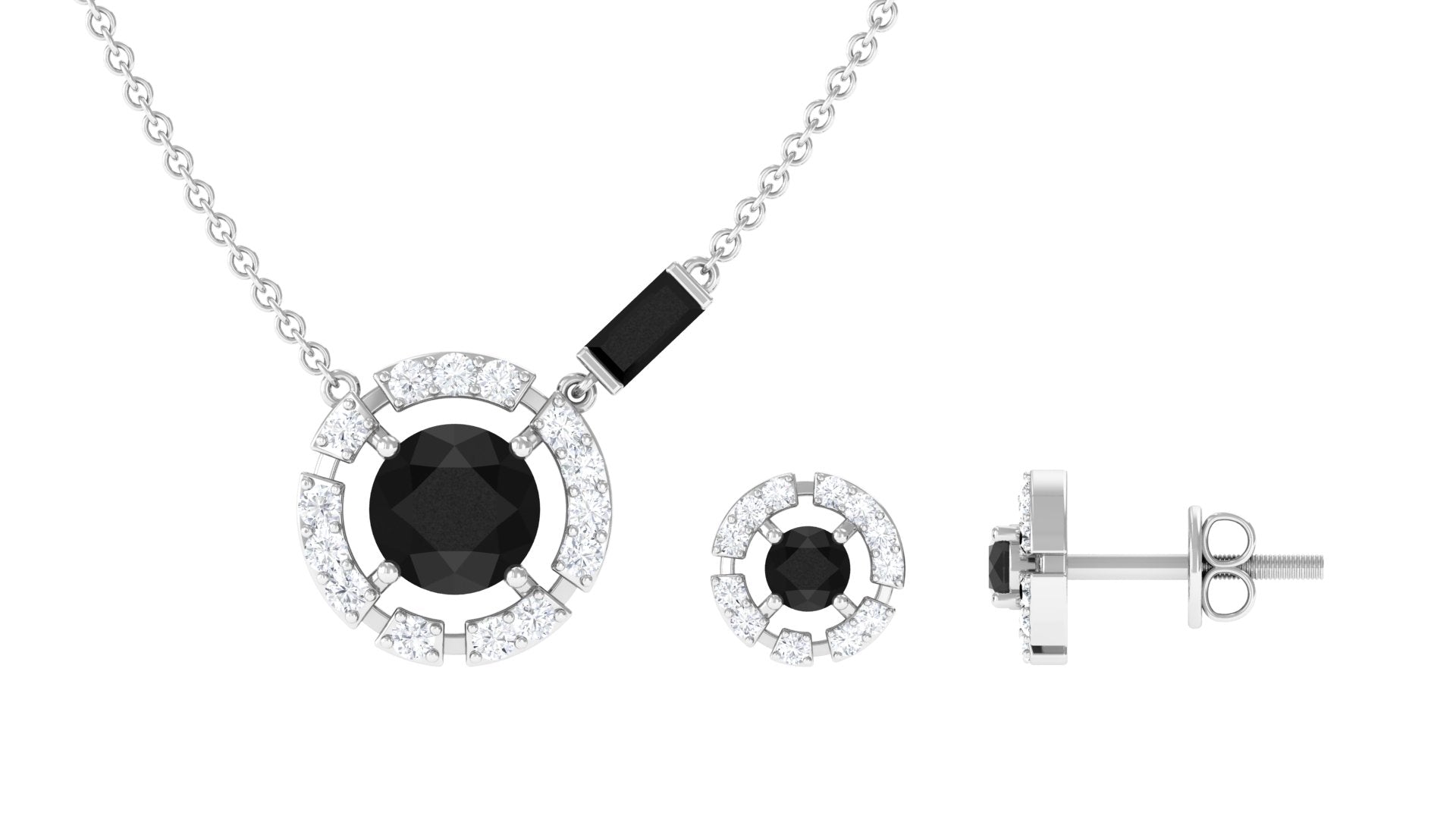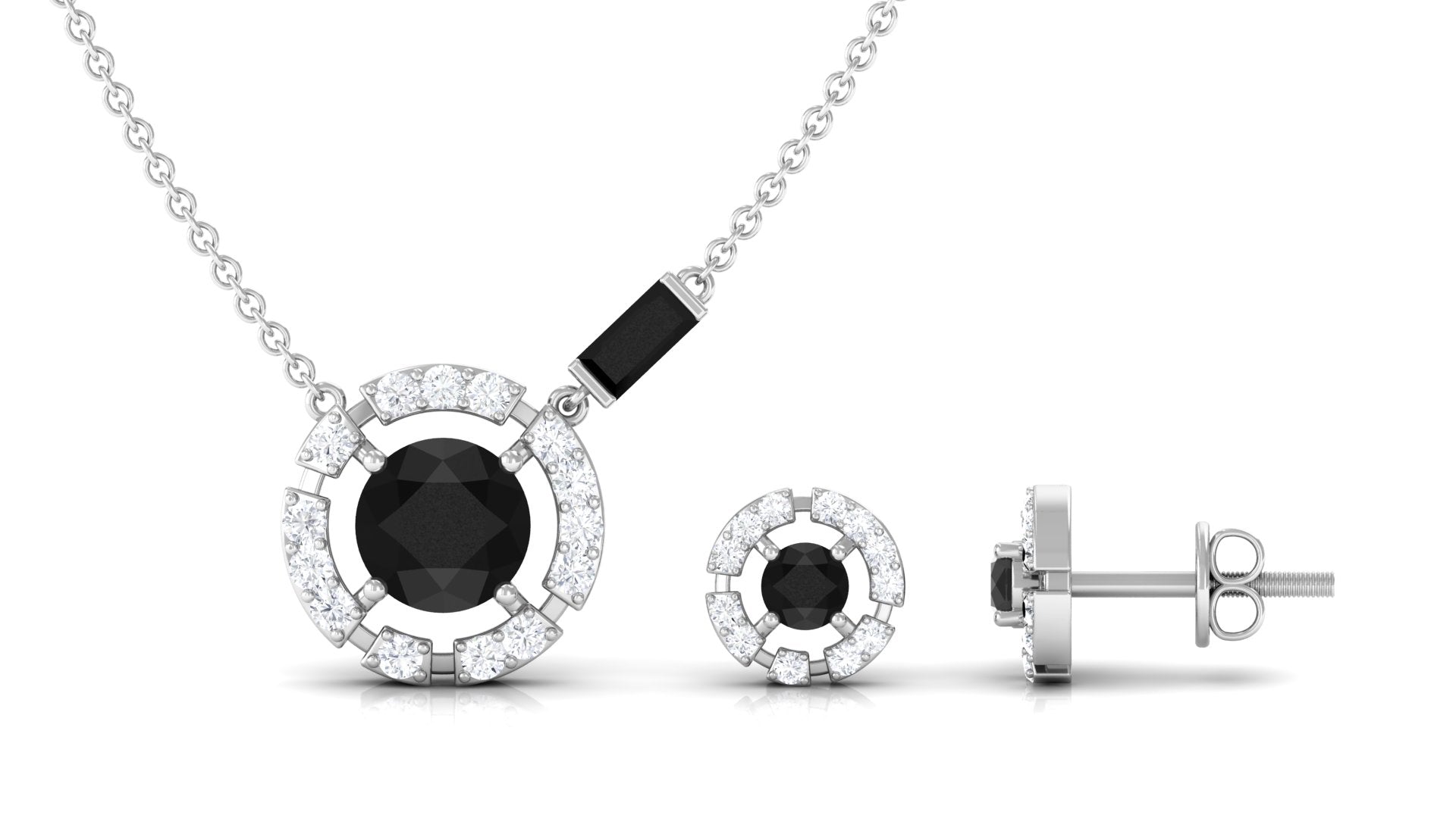 Make a stunning statement on any special occasion with this Created Black Diamond Jewelry Set. Featuring a Round Shape Created Black Diamond stone set in a secure Prong Setting surrounded by a dazzling halo of Diamonds on both the pendant and earrings. A baguette-cut Created Black Diamond on the necklace chain is just the cherry on the cake.