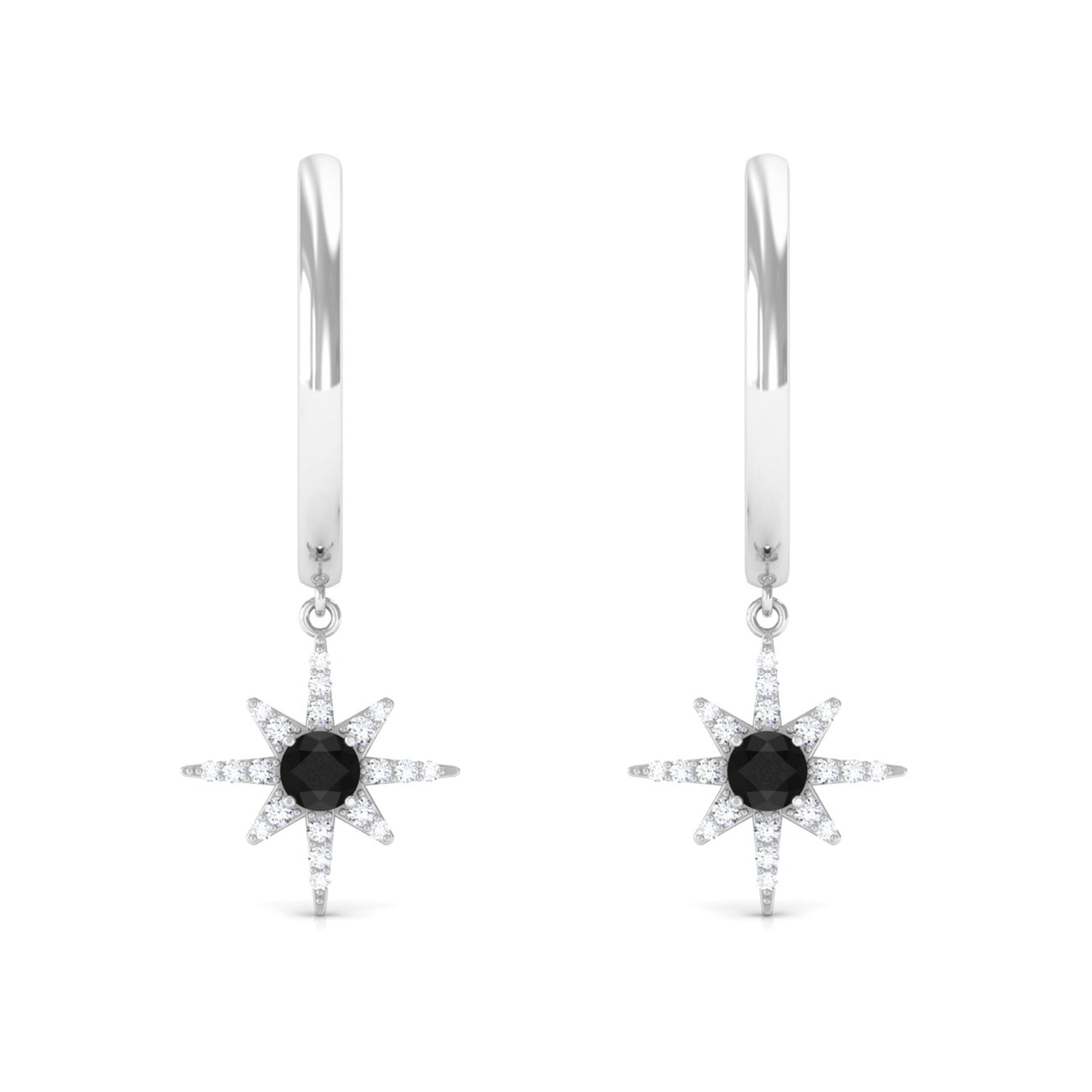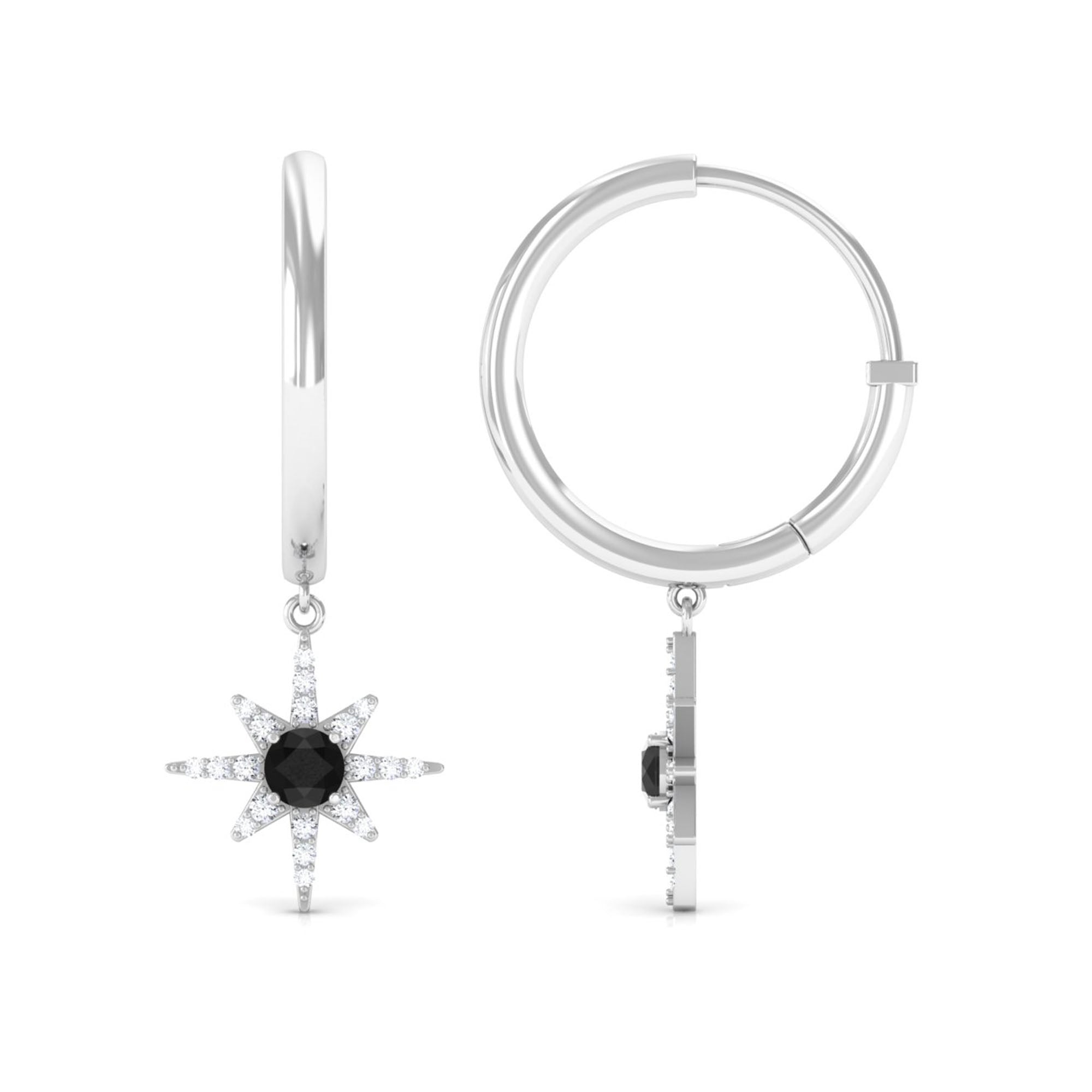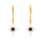 Make a Statement as you flaunt these Sunburst Hoop Earrings with a Lab-Created Black Diamond Solitaire embodied in a unique Sunburst design accentuated by Round Shape Diamond Stones which adds to the look of these Sunburst Hoop Earrings.