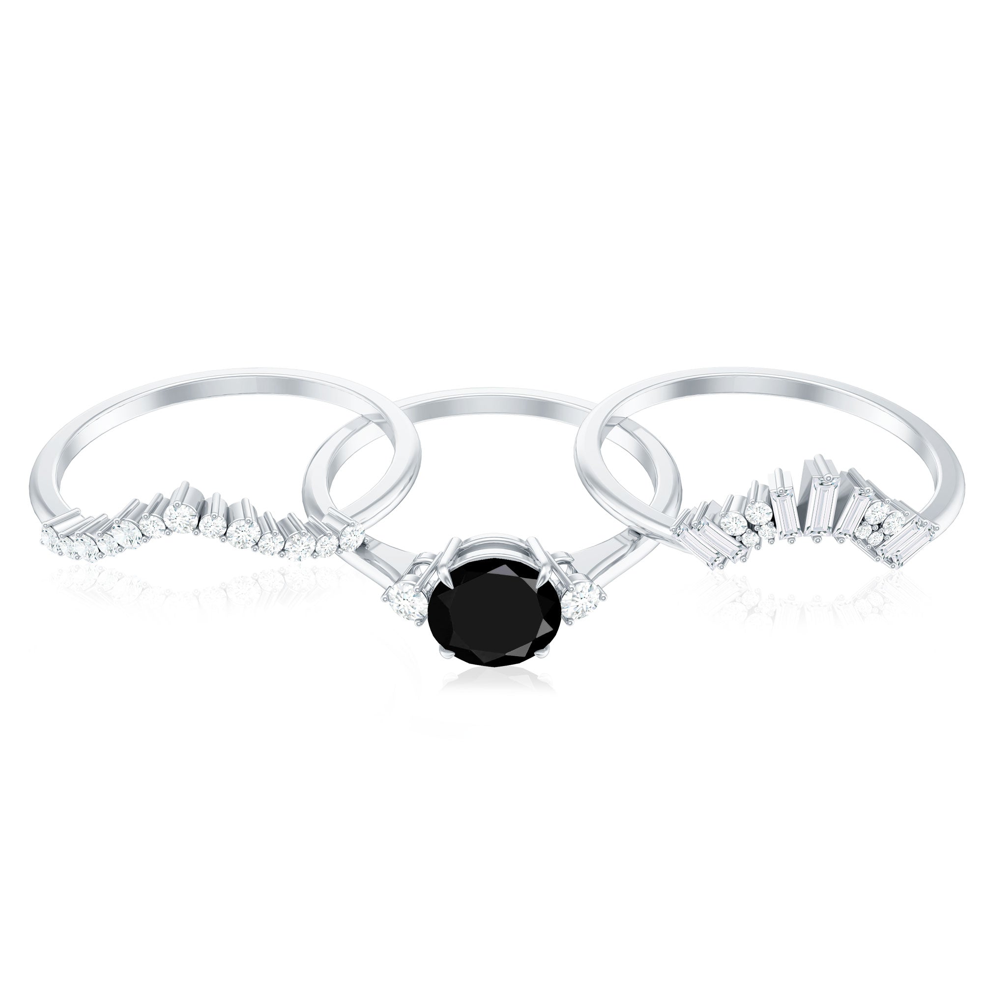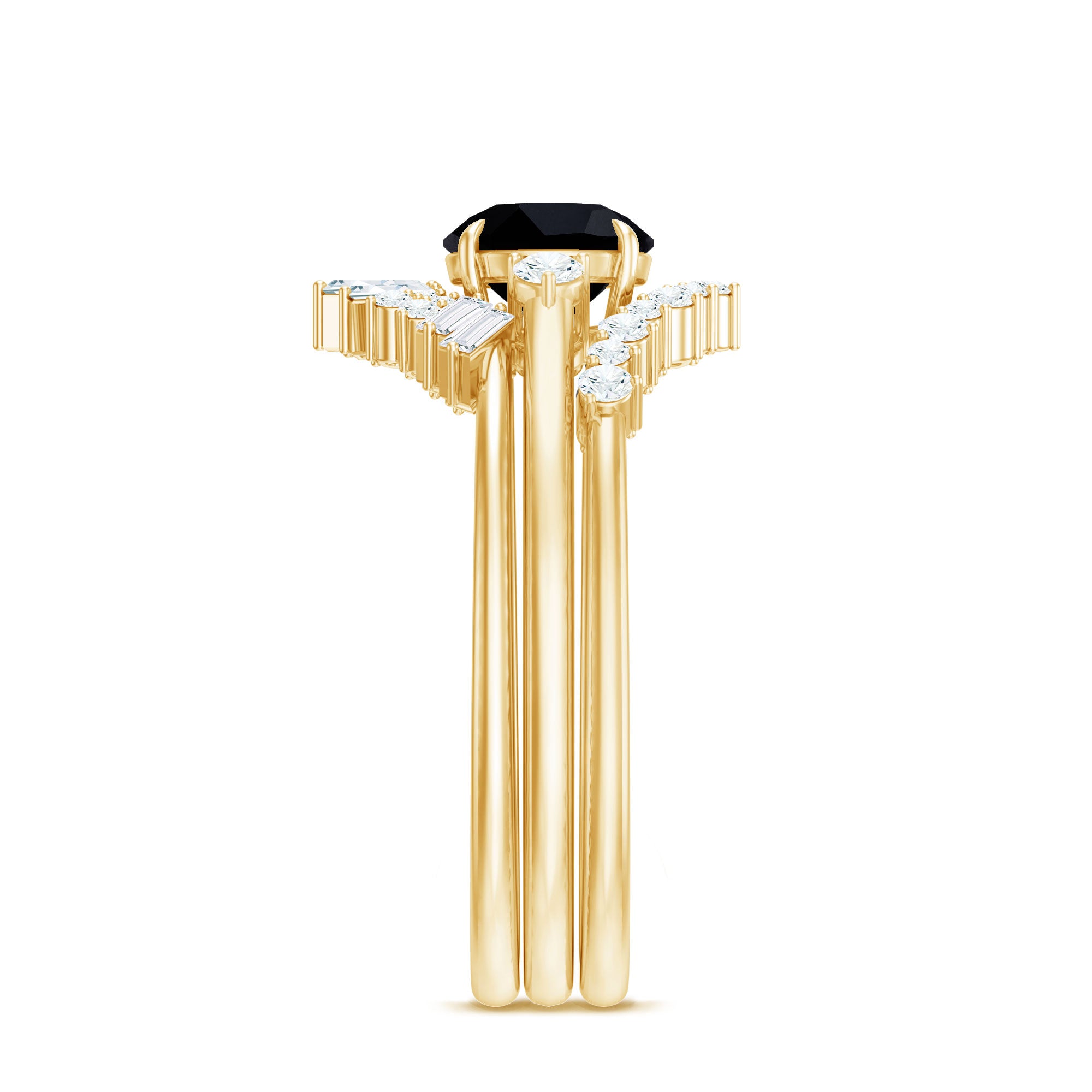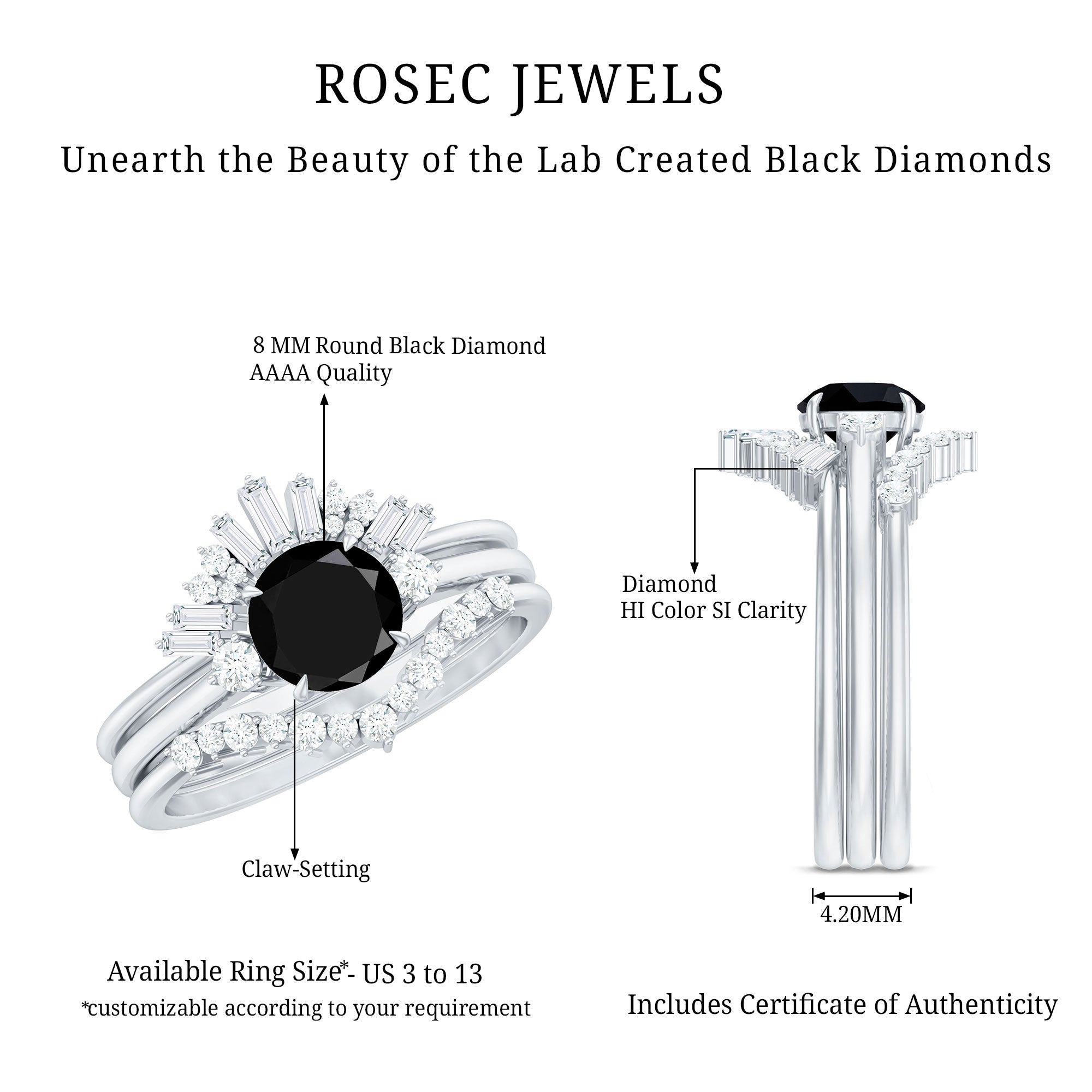 Radiate elegance with this exquisitely beautiful Created Black Diamond Wedding Ring Set. The 7 MM Round Shape Created Black Diamond is adorned with uniquely set Round Shape and Baguette Cut Diamond, making this ring a truly regal piece. This Designer Ring Set has a classic appeal that will take your breath away. Crafted in Solid Gold, this Ring Set will be a perfect choice for your wedding.