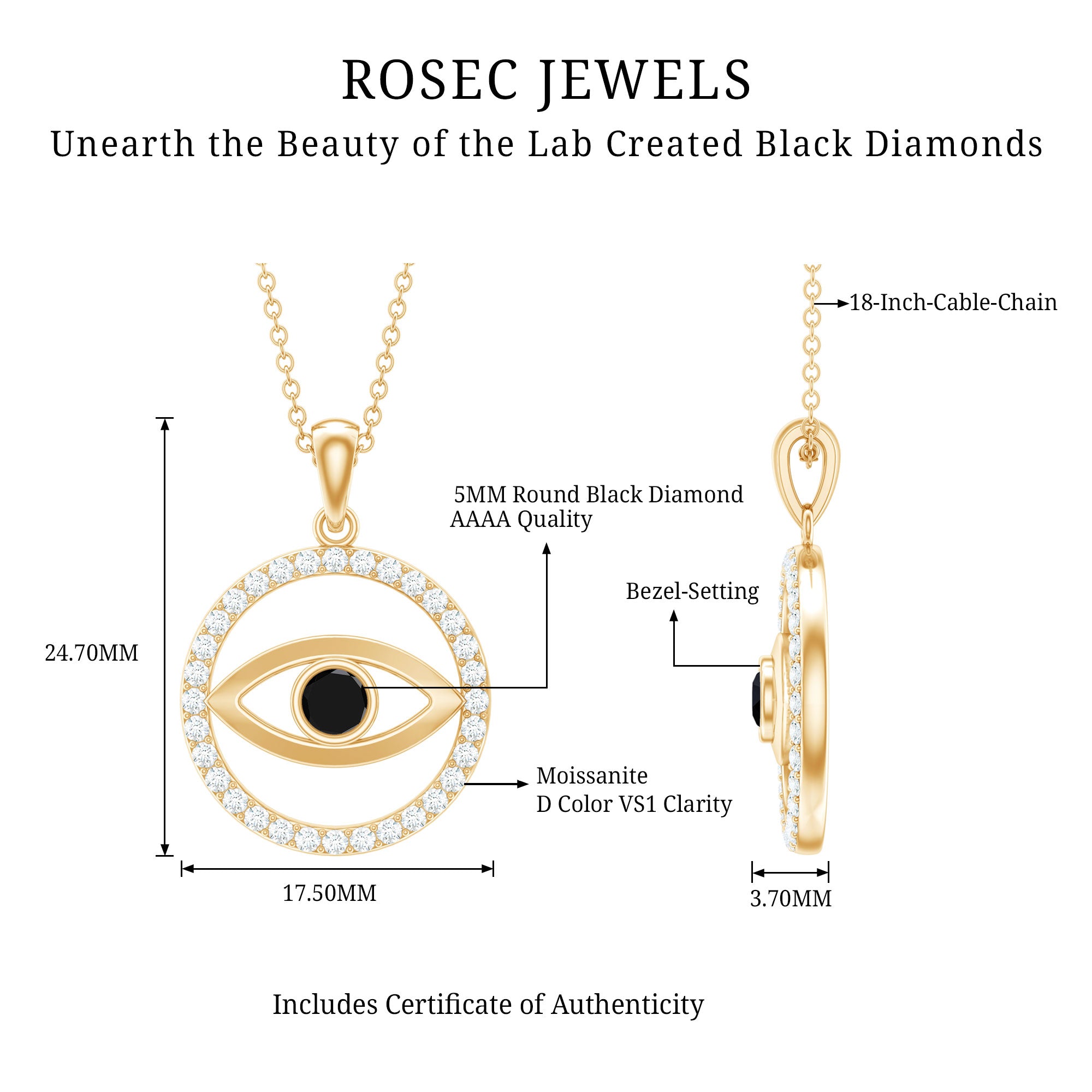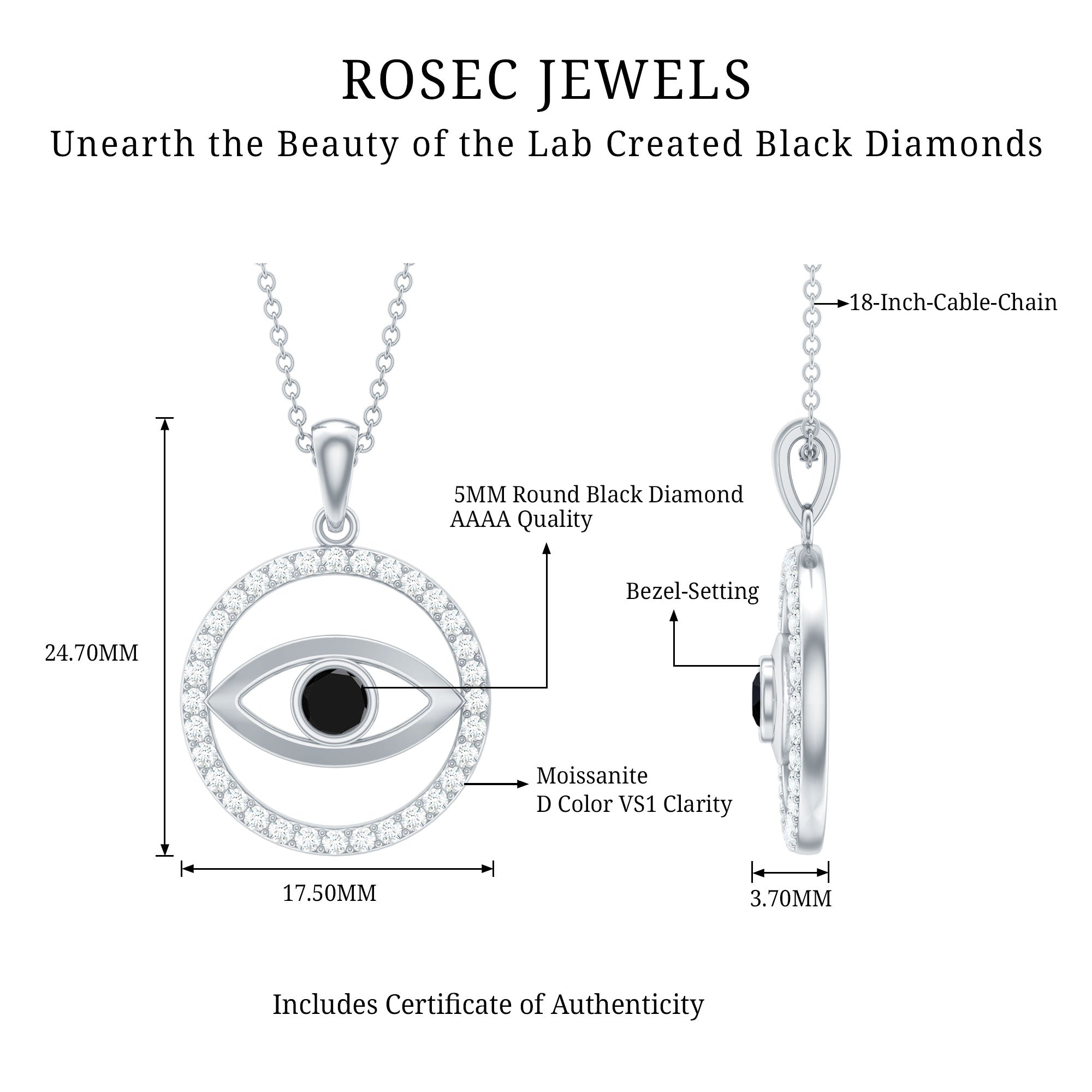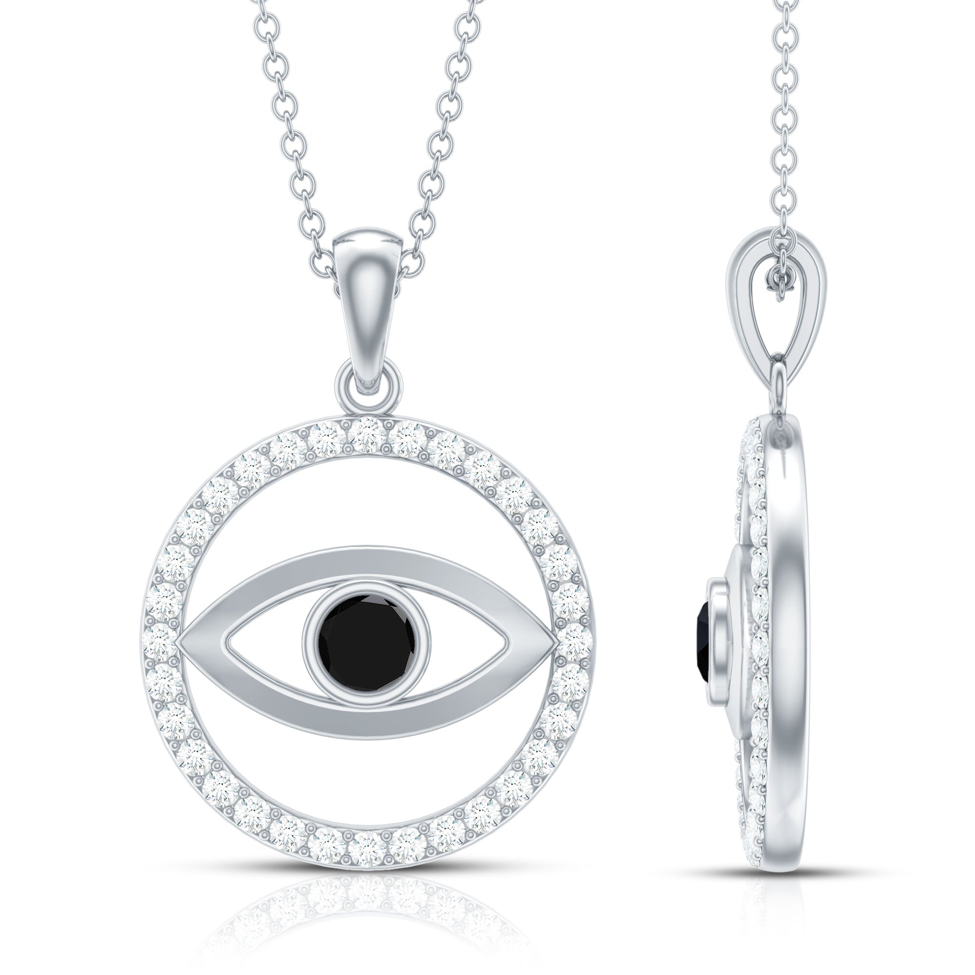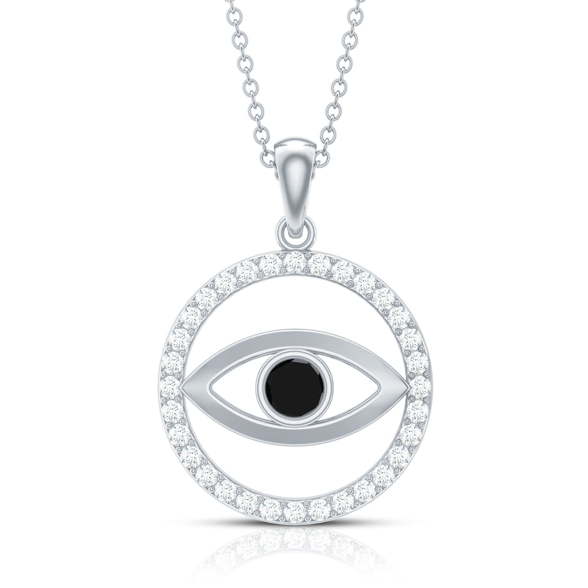 This exquisite pendant showcasing the Evil Eye design exudes just the right amount of charm and would make an excellent present for someone special. The Created Black Diamond pendant is crafted with a circular eternity design encrusted with dazzling round-cut Created Black Diamond gemstone in a secure bezel setting. The eternity circle is further accentuated with brilliant-cut Moissanite stones, enhancing the overall elegance and sophistication of the piece. This evil eye pendant necklace is a perfect accessory to add a touch of glamour and refinement to any outfit.