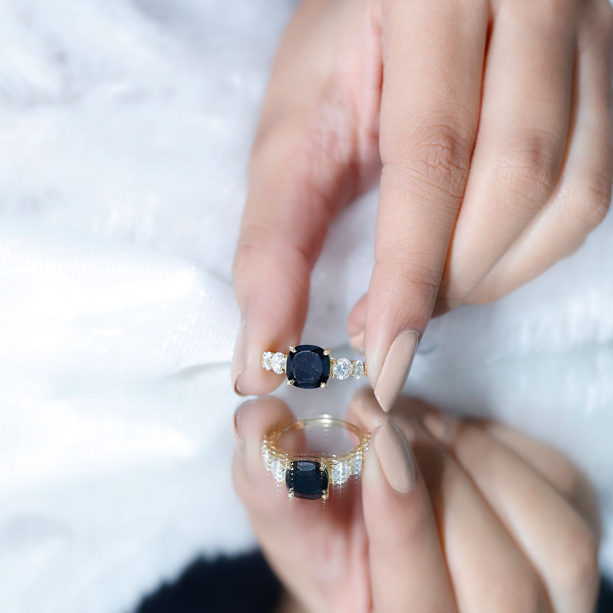 Start a new chapter in your life with this exquisite Solitaire Engagement Ring. Featuring a stunning Cushion Cut Lab-Created Black Diamond, surrounded by Round Cut Moissanite side stones, this ring is sure to take your loved ones breath away. Crafted with the finest gold, this Cushion Cut ring offers an elegant and timeless look that will complement any outfit for years to come. Dont hesitate to surprise your special someone with this gorgeous Created Black Diamond ring.