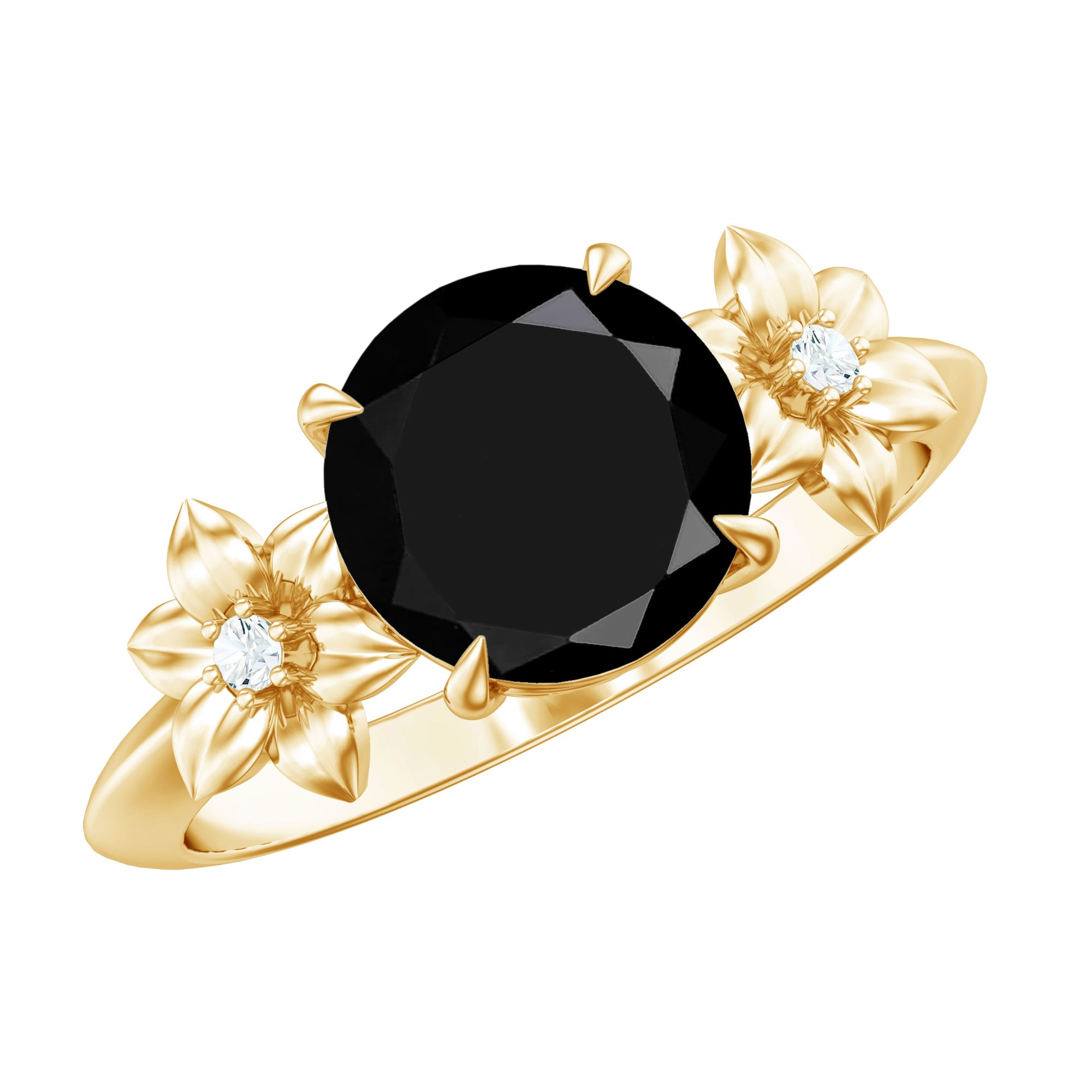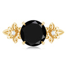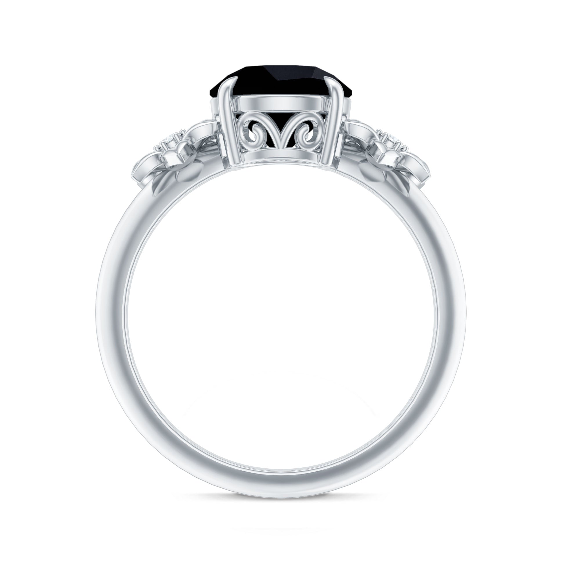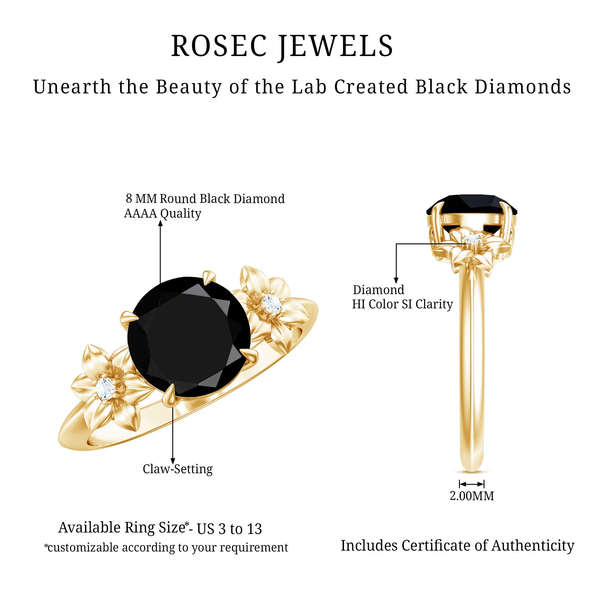 This exquisite floral engagement ring features a magnificent 8 MM round-cut Created Black Diamond, beautifully set in a claw setting. The solitaire stone has sparkling round-cut Diamond stones in a six-prong setting on both sides, which adds a dazzling touch of elegance to the ring. This stunning piece of jewelry serves as a reminder of the love you share with your significant other and is sure to capture their heart. Whether its a special occasion or just because this solitaire ring is the perfect way to express your love and commitment.