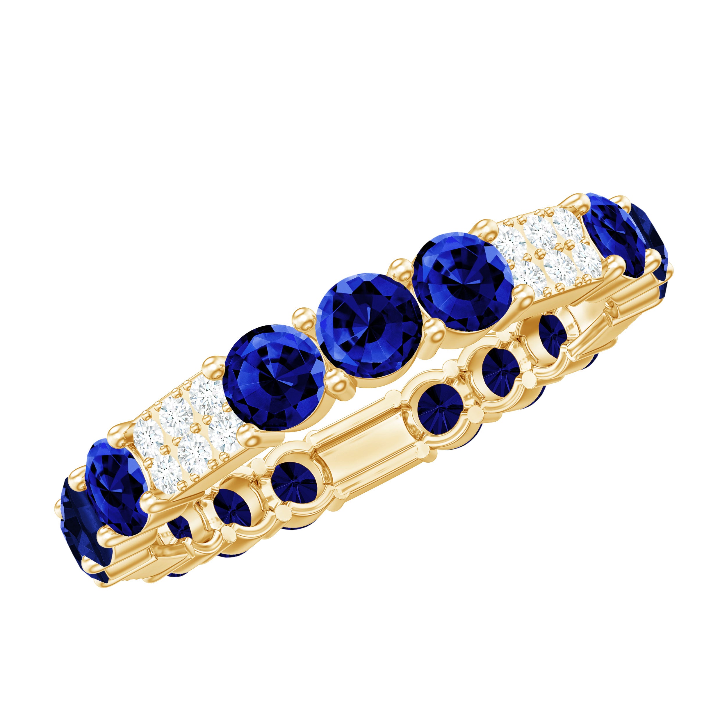 Express your love with this exquisite Designer Eternity Ring, featuring Round Shape Created Blue Sapphire and Diamond stones set in a beautiful prong setting. Crafted from Solid Gold, this Full Eternity Ring exudes class and luxury. Its the perfect accessory to complement your favorite outfit and a timeless piece to cherish forever.